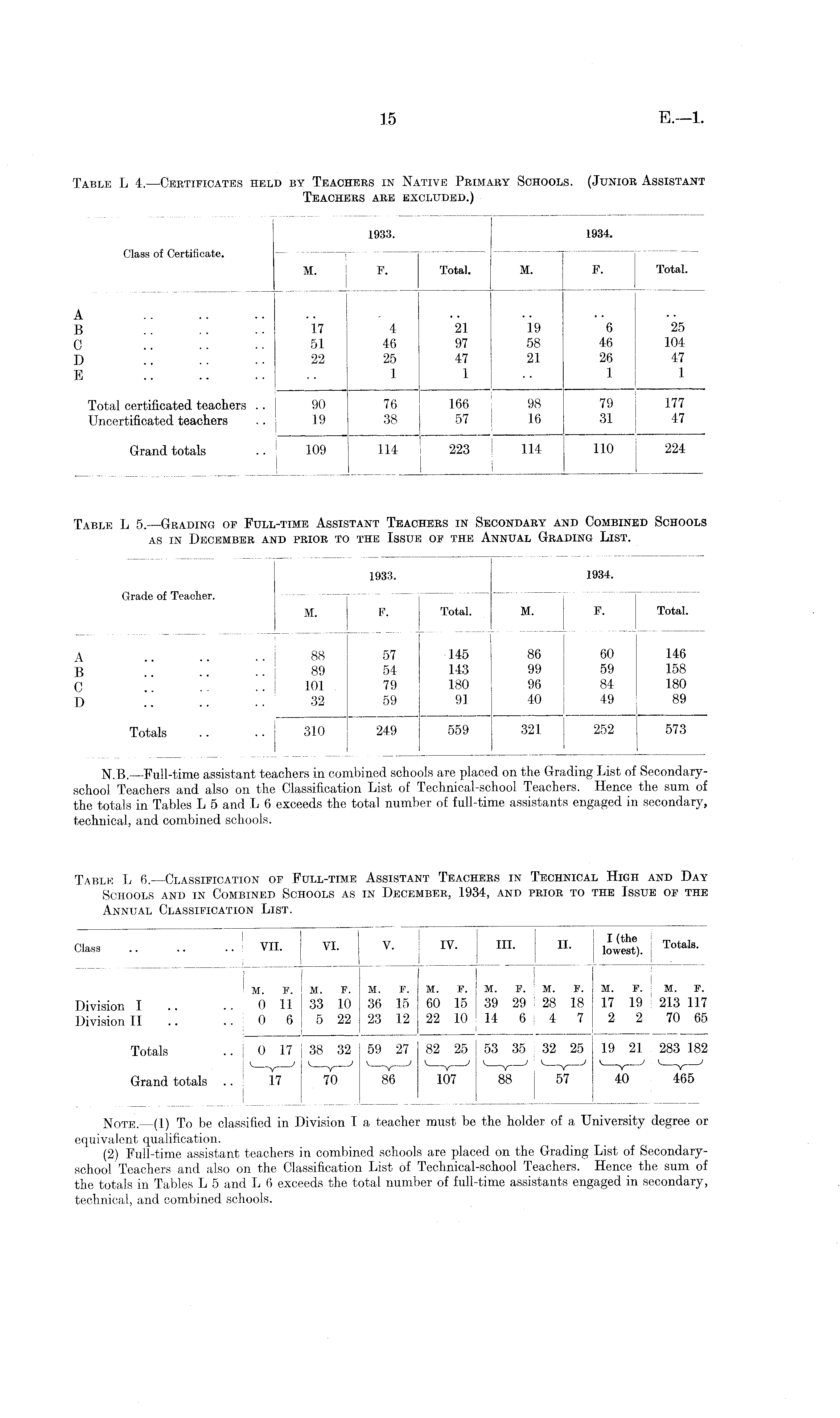 1933. 1934. Class of Certificate. 1 r M. F. Total. M. F. Total. A B . .... 17 4 21 19 6 25 C .. .. .. 51 46 97 58 46 104 D .. .. .. 22 25 47 21 26 47 E .. .. .... 1 1 .. 1 1 Total certificated teachers .. 90 76 166 . 98 79 177 Uncertificated teachers .. 19 38 57 16 31 47 Grand totals .. 109 114 223 114 110 224