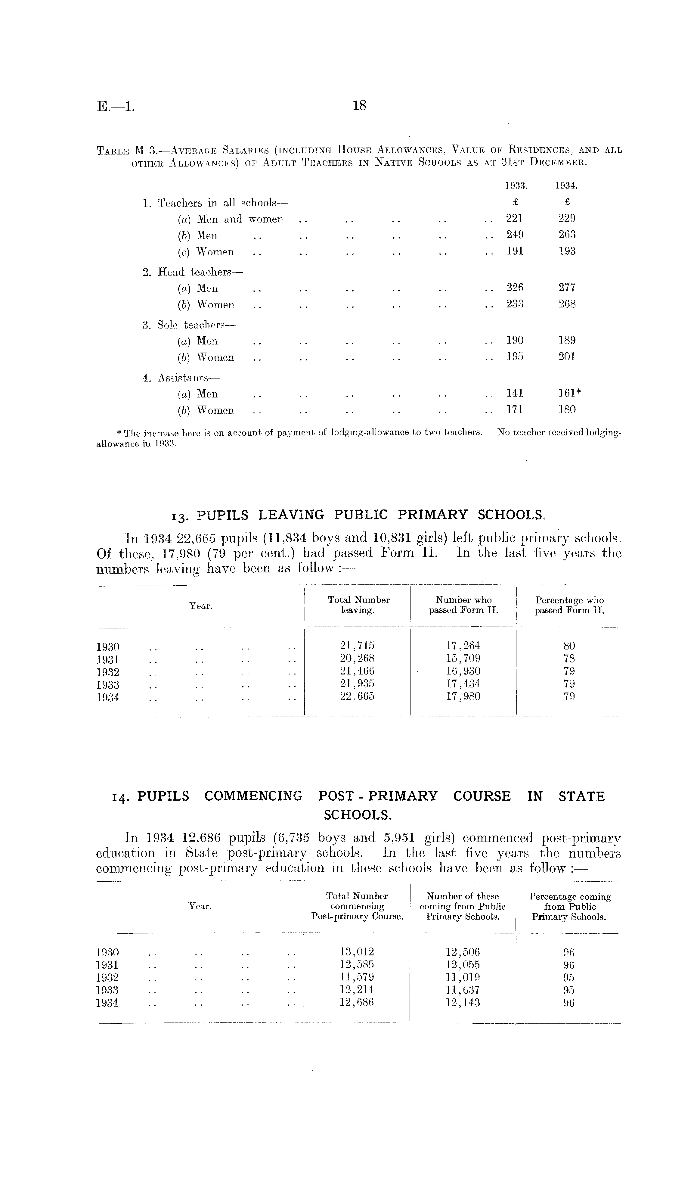 Table M 3. —Average Salaries (including House Allowances, Value of Residences, and all other Allowances) oe Adult Teachers in Native Schools as at 31st December. 1933. 1934. 1. Teachers in all schools — £ £ (а) Men and women .. .. .. .. .. 221 229 (б) Men 249 263 (c) Women .. .. .. .. .. .. 191 193 2. Head teachers — (a) Men .. .. .. .. .. .. 226 277 (b) Women .. .. .. .. .. .. 233 268 3. Sole teachers — (а) Men .. .. .. .. • • • ■ 190 189 (б) Women .. .. .. .. .. .. 195 201 4. Assistants — (a) Men .. .. .. .. .. .. 141 161* (b) Women .. .. .. .. . . . . 171 180 * The increase here is on account of payment of lodging-allowance to two teachers. No teacher received lodgingallowance in 1933. 13. PUPILS LEAVING PUBLIC PRIMARY SCHOOLS. In 1934 22,665 pupils (11,834 boys and 10,831 girls) left public primary schools. Of these, 17,980 (79 per cent.) had passed Form 11. In the last five years the numbers leaving have been as follow :—