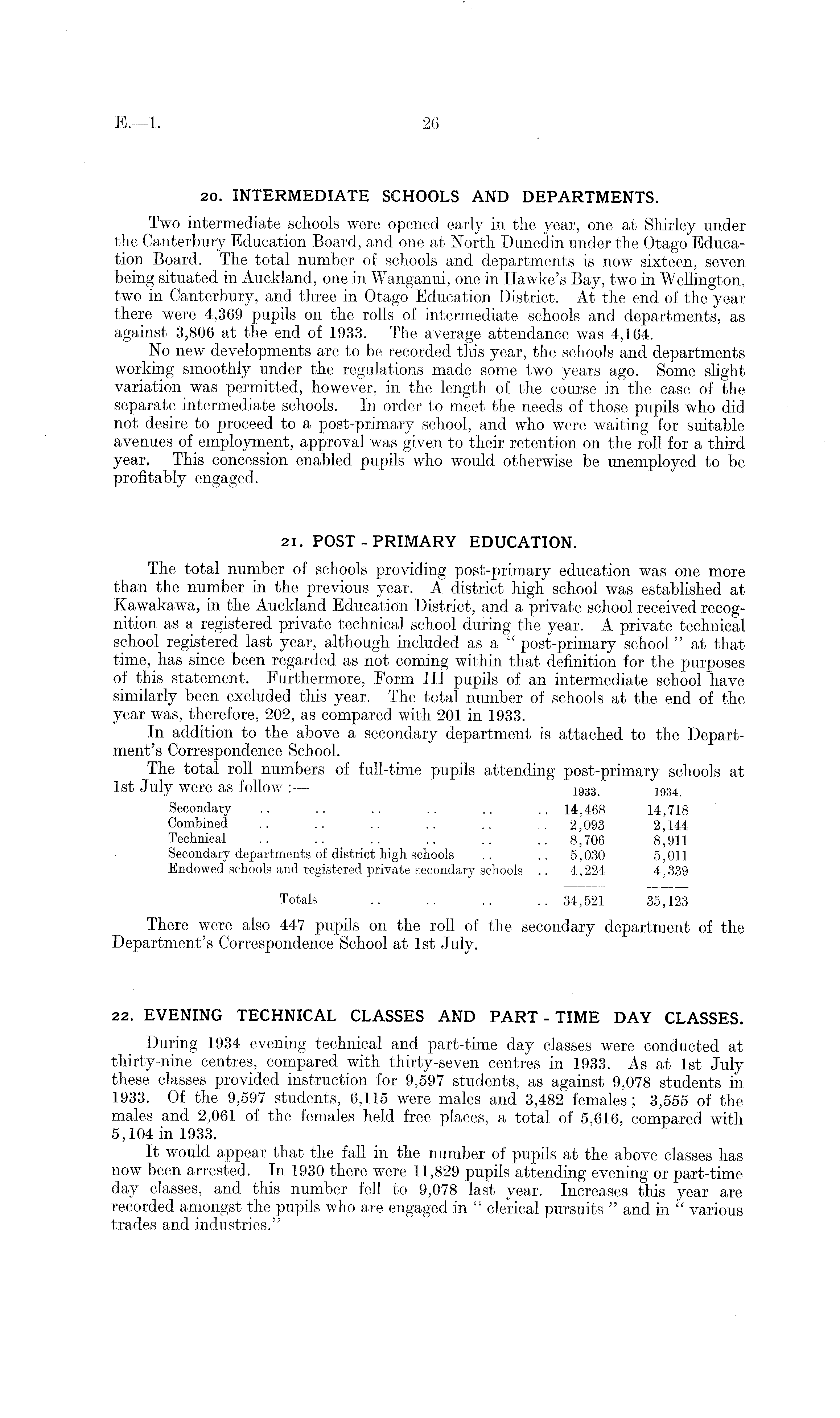 20. INTERMEDIATE SCHOOLS AND DEPARTMENTS. Two intermediate schools were opened early in the year, one at Shirley under the Canterbury Education Board, and one at North Dunedin under the Otago Education Board. The total number of schools and departments is now sixteen, seven being situated in Auckland, one in Wanganui, one in Hawke's Bay, two in Wellington, two in Canterbury, and three in Otago Education District. At the end of the year there were 4,369 pupils on the rolls of intermediate schools and departments, as against 3,806 at the end of 1933. The average attendance was 4,164. No new developments are to be recorded this year, the schools and departments working smoothly under the regulations made some two years ago. Some slight variation was permitted, however, in the length of the course in the case of the separate intermediate schools. In order to meet the needs of those pupils who did not desire to proceed to a post-primary school, and who were waiting for suitable avenues of employment, approval was given to their retention on the roll for a third year. This concession enabled pupils who would otherwise be unemployed to be profitably engaged. 2i. POST-PRIMARY EDUCATION. The total number of schools providing post-primary education was one more than the number in the previous year. A district high school was established at Kawakawa, in the Auckland Education District, and a private school received recognition as a registered private technical school during the year. A private technical school registered last year, although included as a " post-primary school" at that time, has since been regarded as not coming within that definition for the purposes of this statement. Furthermore, Form 111 pupils of an intermediate school have similarly been excluded this year. The total number of schools at the end of the year was, therefore, 202, as compared with 201 in 1933. In addition to the above a secondary department is attached to the Department's Correspondence School. The total roll numbers of full-time pupils attending post-primary schools at Ist July were as follow: — 19 33. 1934 i Secondary .. .. .. .. .. .. 14,468 14,718 Combined .. .. .. .. .. .. 2,093 2,144 Technical .. .. .. .. .. .. 8,706 8,911 Secondary departments of district high schools .. .. 5,030 5,011 Endowed schools and registered private secondary schools .. 4,224 4,339 Totals .. .. .. .. 34,521 35,123 There were also 447 pupils on the roll of the secondary department of the Department's Correspondence School at Ist July. 22. EVENING TECHNICAL CLASSES AND PART-TIME DAY CLASSES. During 1934 evening technical and part-time day classes were conducted at thirty-nine centres, compared with thirty-seven centres in 1933. As at Ist July these classes provided instruction for 9,597 students, as against 9,078 students in 1933. Of the 9,597 students, 6,115 were males and 3,482 females; 3,555 of the males and 2,061 of the females held free places, a total of 5,616, compared with 5,104 in 1933. It would appear that the fall in the number of pupils at the above classes has now been arrested. In 1930 there were 11,829 pupils attending evening or part-time day classes, and this number fell to 9,078 last year. Increases this year are recorded amongst the pupils who are engaged in " clerical pursuits " and in " various trades and industries."