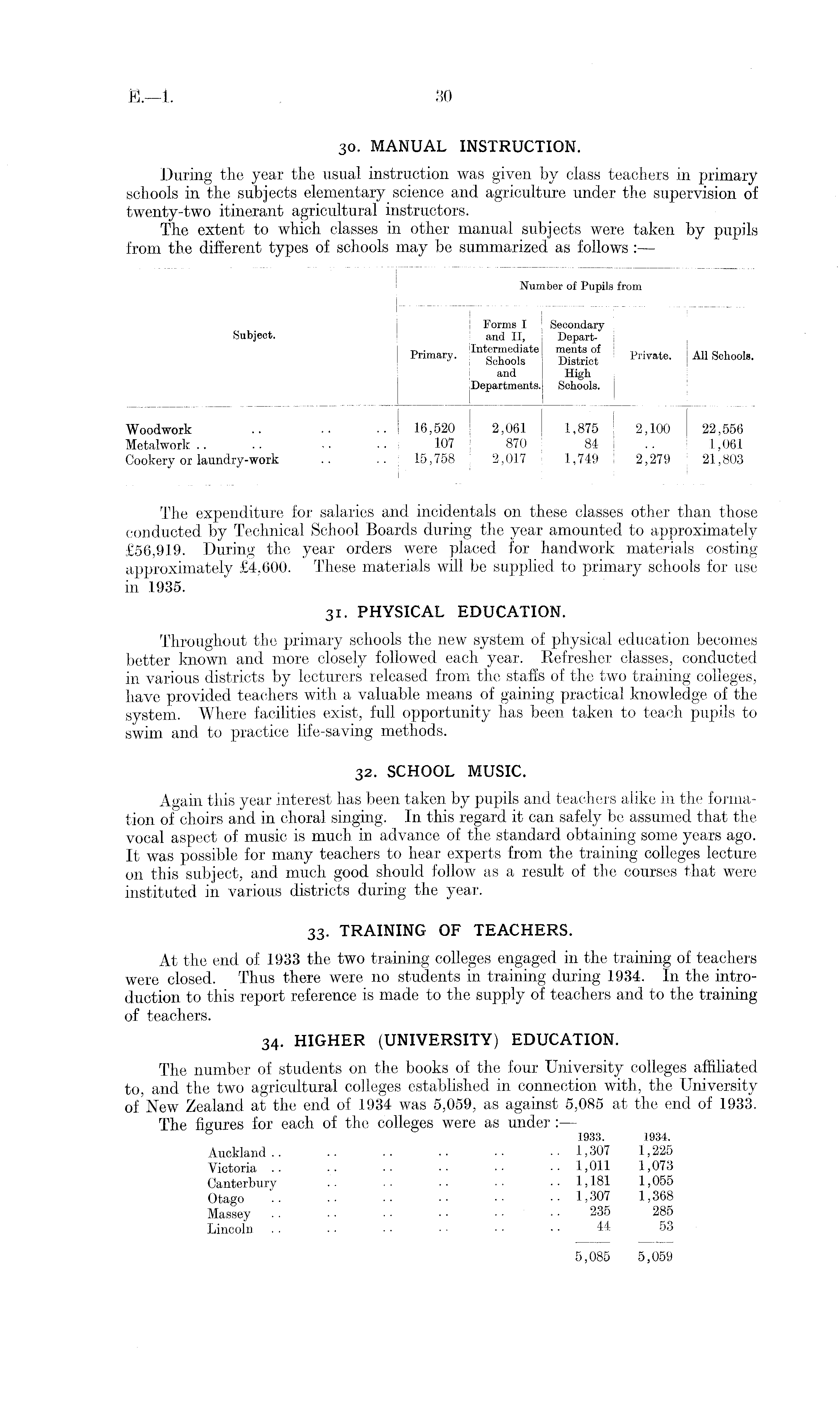 The expenditure for salaries and incidentals on these classes other than those conducted by Technical School Boards during the year amounted to approximately £56,919. During the year orders were placed for handwork materials costing approximately £4.600. These materials will be supplied to primary schools for use in 1935. 31. PHYSICAL EDUCATION. Throughout the primary schools the new system of physical education becomes better known and more closely followed each year. Refresher classes, conducted in various districts by lecturers released from the staffs of the two training colleges, have provided teachers with a valuable means of gaining practical knowledge of the system. Where facilities exist, full opportunity has been taken to teach pupils to swim and to practice life-saving methods. 32. SCHOOL MUSIC. Again this year interest has been taken by pupils and teachers alike in the formation of choirs and in choral singing. In this regard it can safely be assumed that the vocal aspect of music is much in advance of the standard obtaining some years ago. It was possible for many teachers to hear experts from the training colleges lecture on this subject, and much good should follow as a result of the courses that were instituted in various districts during the year. 33. TRAINING OF TEACHERS. At the end of 1933 the two training colleges engaged in the training of teachers were closed. Thus there were no students in training during 1934. In the introduction to this report reference is made to the supply of teachers and to the training of teachers. 34. HIGHER (UNIVERSITY) EDUCATION. The number of students on the books of the four University colleges affiliated to, and the two agricultural colleges established in connection with, the University of New Zealand at the end of 1934 was 5,059, as against 5,085 at the end of 1933. The figures for each of the colleges were as under : — 1933. 1934. Auckland .. .. .. • • • • 1 > 307 1,225 Victoria .. •• •• •• •• 1,011 1,073 Canterbury •• •• •• 1,181 1,055 Otago .. 1,307 1,368 Massey .. • • • • • • • • • • 235 285 Lincoln . . .. . ■ • • ■ • • • 44 53 5,085 5,059
