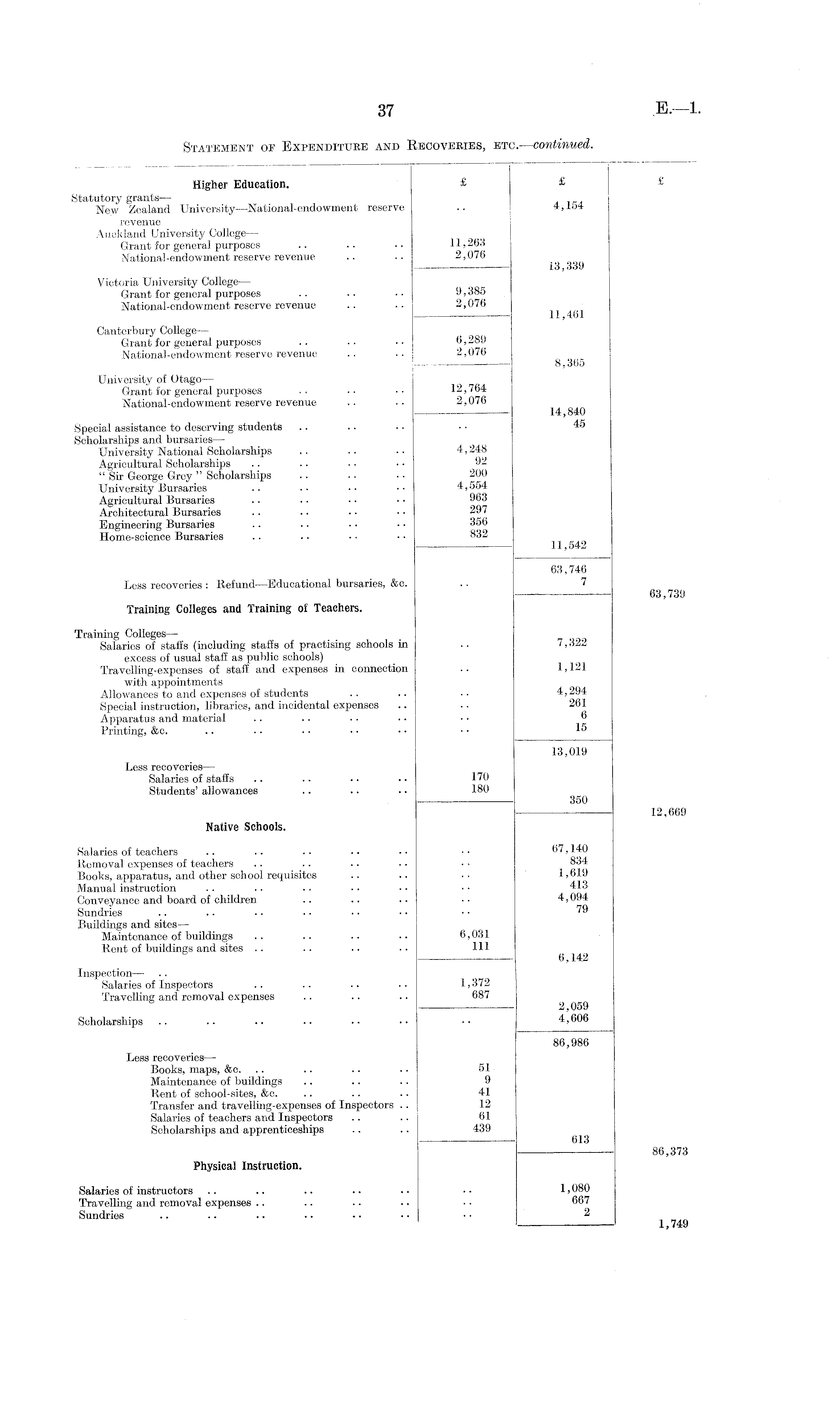 Higher Education. £ £ £ Statutory grants — New Zealand University—National-endowment reserve .. 4,154 revenue Auckland University College— Grant for general purposes .. .. •• 11,263 National-endowment reserve revenue .. .. 2,076 — 13,339 Victoria University College— Grant for general purposes .. • • • • 9,385 National-endowment reserve revenue .. •• 2,076 11,461 Canterbury College— Grant for general purposes .. • • • • 6,289 National-endowment reserve revenue .. .. 2,076 8,365 University of Otago — Grant for general purposes .. • • • • 12,764 National-endowment reserve revenue .. •• 2,076 14,840 Special assistance to deserving students .. . • • • • • 45 Scholarships and bursaries — University National Scholarships .. •• 4,248 Agricultural Scholarships .. . • • • • • " Sir George Grey " Scholarships .. . • • • 200 University Bursaries .. .. • • • • 4,554 Agricultural Bursaries .. . ■ • • • • 963 Architectural Bursaries .. • • • • ■ • 297 Engineering Bursaries ■. • • ■ • • • 356 Home-science Bursaries .. .. • • • • 832 11,542 63,746 Less recoveries: Refund —Educational bursaries, &c. .. 7 63,739 Training Colleges and Training of Teachers. Training Colleges— Salaries of staffs (including staffs of practising schools in .. 7,32L excess of usual staff as public schools) Travelling-expenses of staff and expenses in connection .. 1»121 with appointments Allowances to and expenses of students .. .. • • 4,294 Special instruction, libraries, and incidental expenses .. .. 261 Apparatus and material .. . • • • • • • • ® Printing, &c. .. .. . • • • • • ■ • 13,019 Less recoveries— Salaries of staffs .. .. .. . ■ 170 Students' allowances .. .. • • 180 350 12,669 Native Schools. Salaries of teachers .. .. . • •• •• 67,140 Removal expenses of teachers .. .. .. . • • • 834 Books, apparatus, and other school requisites .. .. 1,619 Manual instruction . . . • . • • • ■ • • • 413 Conveyance and board of children . • •. • • • ■ 4,094 Sundries .. .. . • • ■ • • ■ • • ■ Buildings and sites— Maintenance of buildings .. .. .. .. 6,031 Rent of buildings and sites .. .. .. .. Ill 6,142 Inspection— Salaries of Inspectors .. .. .. •• 1,372 Travelling and removal expenses .. .. .. 687 2,059 Scholarships .. .. .. .. , • •• •• 4,606 86,986 Less recoveries— Books, maps, &c. .. .. .. .. 51 Maintenance of buildings .. .. .. 9 Rent of school-sites, &c. .. .. ■. 41 Transfer and travelling-expenses of Inspectors .. 12 Salaries of teachers and Inspectors .. .. 61 Scholarships and apprenticeships .. .. 439 86,373 Physical Instruction. Salaries of instructors .. .. .. .. •. • • 1,080 Travelling and removal expenses .. .. .. .. • • 667 Sundries .. .. .. .. • • • • • • 2 1,749