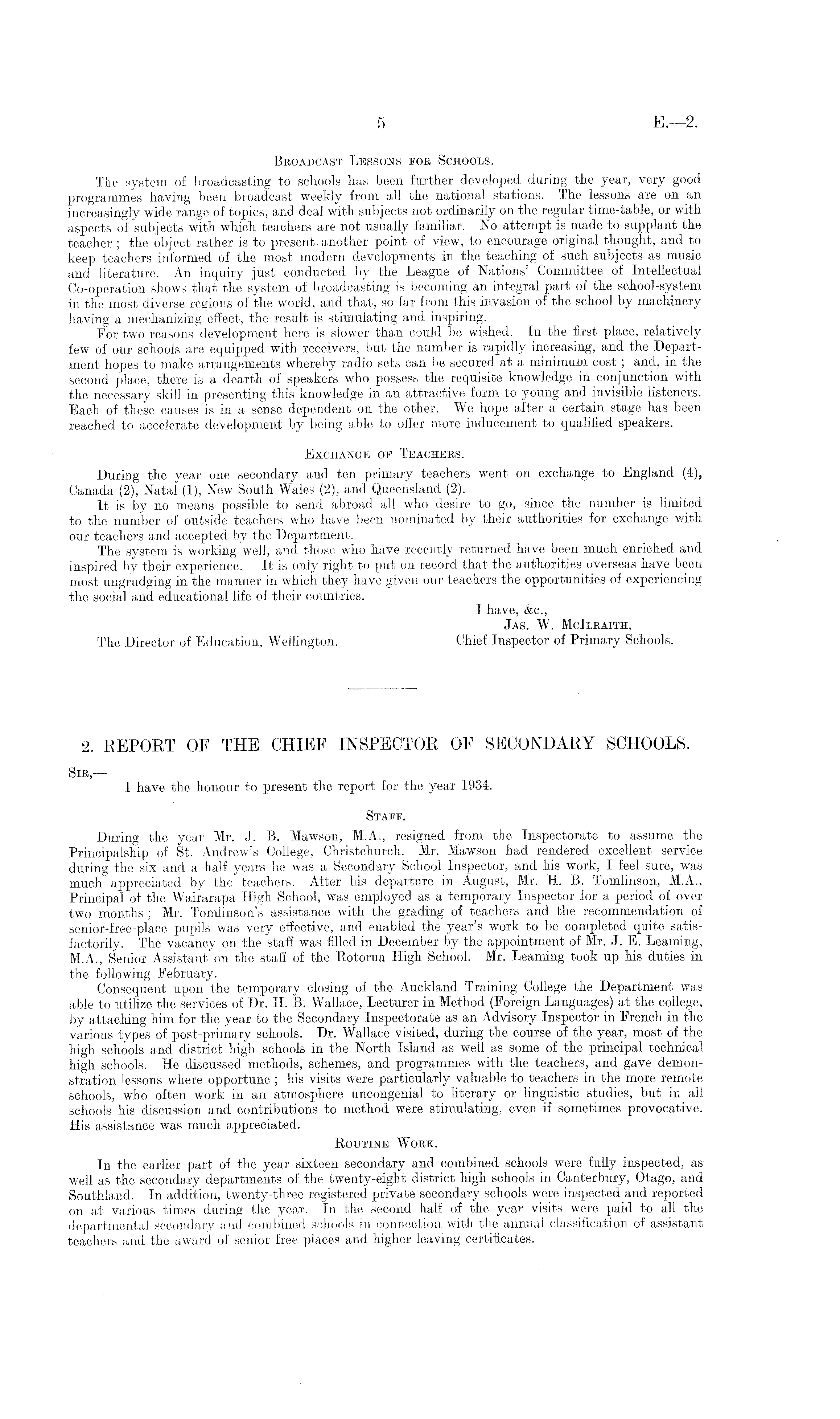 2. REPORT OF THE CHIEF INSPECTOR OF SECONDARY SCHOOLS. Slß,— I have the honour to present the report for the year 1934. Staff. During the year Mr. J. B. Mawson, M.A., resigned from the Inspectorate to assume - the Principalship of St. Andrew's College, Christehuroh. Mr. Mawson had rendered excellent service during the six and a half years he was a Secondary School Inspector, and his work, I feel sure, was much appreciated by the teachers. After his departure in August, Mr. H. B. Tomlinson, M.A., Principal of the Wairarapa High School, was employed as a temporary Inspector for a period of over two months ; Mr. Tomlinson's assistance with the grading of teachers and the recommendation of senior-free-place pupils was very effective, and enabled the year's work to be completed quite satisfactorily. The vacancy on the staff was filled in December by the appointment of Mr. J. E. Learning, M.A., Senior Assistant on the staff of the Rotorua High School. Mr. Learning took up his duties in the following February. Consequent upon the temporary closing of the Auckland Training College the Department was able to utilize the services of Dr. H. B. Wallace, Lecturer in Method (Foreign Languages) at the college, by attaching him for the year to the Secondary Inspectorate as an Advisory Inspector in French in the various types of post-primary schools. Dr. Wallace visited, during the course of the year, most of the high schools and district high schools in the North Island as well as some of the principal technical high schools. He discussed methods, schemes, and programmes with the teachers, and gave demonstration lessons where opportune ; his visits were particularly valuable to teachers in the more remote schools, who often work in an atmosphere uncongenial to literary or linguistic studies, but in all schools his discussion and contributions to method were stimulating, even if sometimes provocative. His assistance was much appreciated. Routine Work. In the earlier part of the year sixteen secondary and combined schools were fully inspected, as well as the secondary departments of the twenty-eight district high schools in Canterbury, Otago, and Southland. In addition, twenty-three registered private secondary schools were inspected and reported on at various times during the year. In the second half of the year visits were paid to all the departmental secondary and combined schools in connection with the annual classification of assistant teachers and the award of senior free places and higher leaving certificates.