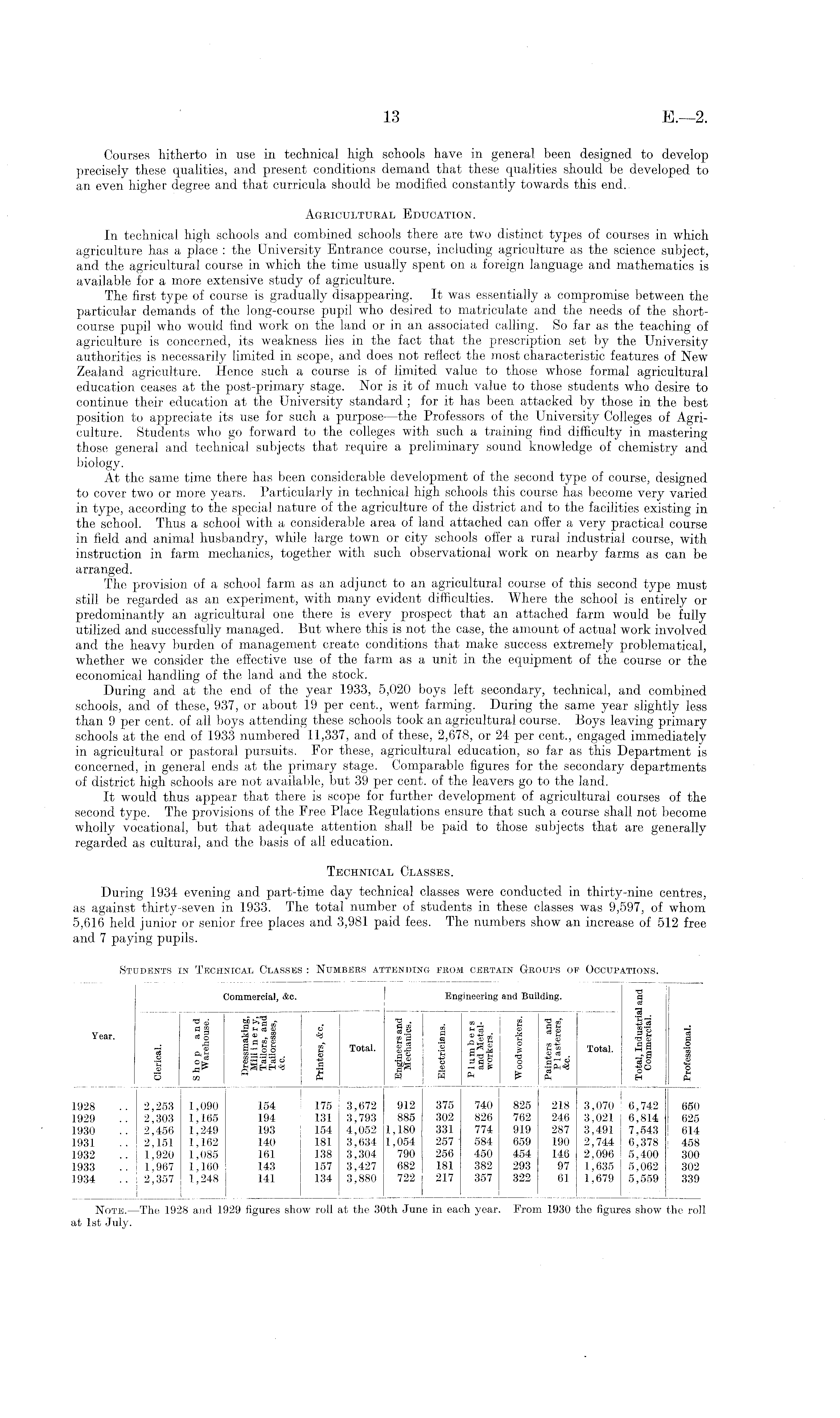 Courses hitherto in use in technical high schools have in general been designed to develop precisely these qualities, and present conditions demand that these qualities should be developed to an even higher degree and that curricula should be modified constantly towards this end. Agricultural Education. In technical high schools and combined schools there are two distinct types of courses in which agriculture has a place : the University Entrance course, including agriculture as the science subject, and the agricultural course in which the time usually spent on a foreign language and mathematics is available for a more extensive study of agriculture. The first type of course is gradually disappearing. It was essentially a compromise between the particular demands of the long-course pupil who desired to matriculate and the needs of the shortcourse pupil who would find work on the land or in an associated calling. So far as the teaching of agriculture is concerned, its weakness lies in the fact that the prescription set by the University authorities is necessarily limited in scope, and does not reflect the most characteristic features of New Zealand agriculture. Hence such a course is of limited value to those whose formal agricultural education ceases at the post-primary stage. Nor is it of much value to those students who desire to continue their education at the University standard ; for it has been attacked by those in the best position to appreciate its use for such a purpose —the Professors of the University Colleges of Agriculture. Students who go forward to the colleges with such a training find difficulty in mastering those general and technical subjects that require a preliminary sound knowledge of chemistry and biology. At the same time there has been considerable development of the second type of course, designed to cover two or more years. Particularly in technical high schools this course has become very varied in type, according to the special nature of the agriculture of the district and to the facilities existing in the school. Thus a school with a considerable area of land attached can offer a very practical course in field and animal husbandry, while large town or city schools offer a rural industrial course, with instruction in farm mechanics, together with such observational work on nearby farms as can be arranged. The provision of a school farm as an adjunct to an agricultural course of this second type must still be regarded as an experiment, with many evident difficulties. Where the school is entirely or predominantly an agricultural one there is every prospect that an attached farm would be fully utilized and successfully managed. But where this is not the case, the amount of actual work involved and the heavy burden of management create conditions that make success extremely problematical, whether we consider the effective use of the farm as a unit in the equipment of the course or the economical handling of the land and the stock. During and at the end of the year 1933, 5,020 boys left secondary, technical, and combined schools, and of these, 937, or about 19 per cent., went farming. During the same year slightly less than 9 per cent, of all boys attending these schools took an agricultural course. Boys leaving primary schools at the end of 1933 numbered 11,337, and of these, 2,678, or 24 per cent., engaged immediately in agricultural or pastoral pursuits. For these, agricultural education, so far as this Department is concerned, in general ends at the primary stage. Comparable figures for the secondary departments of district high schools are not available, but 39 per cent, of the leavers go to the land. It would thus appear that there is scope for further development of agricultural courses of the second type. The provisions of the Free Place Regulations ensure that such a course shall not become wholly vocational, but that adequate attention shall be paid to those subjects that are generally regarded as cultural, and the basis of all education. Technical Classes. During 1934 evening and part-time day technical classes were conducted in thirty-nine centres, as against thirty-seven in 1933. The total number of students in these classes was 9,597, of whom 5,616 held junior or senior free places and 3,981 paid fees. The numbers show an increase of 512 free and 7 paying pupils.