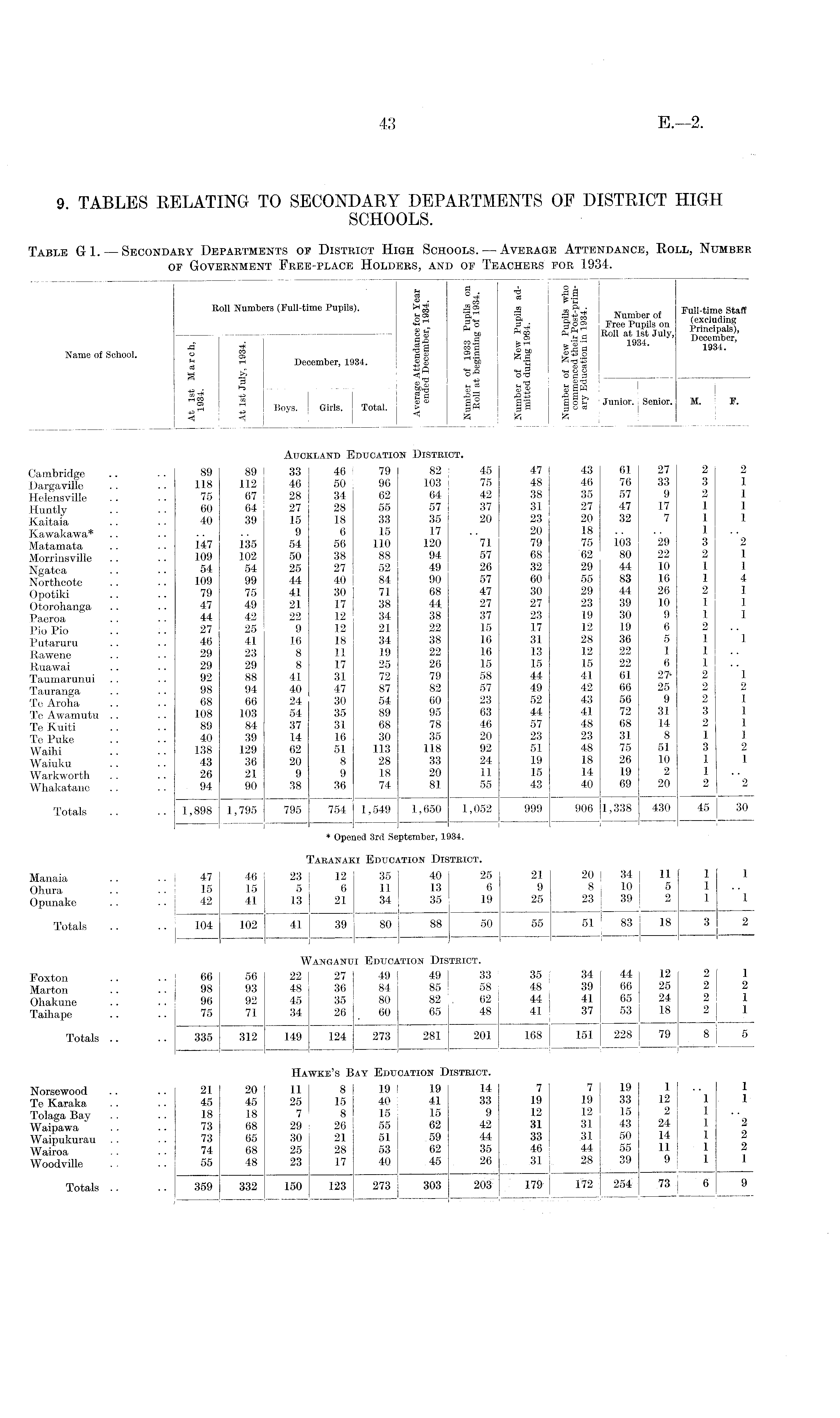 9. TABLES RELATING TO SECONDARY DEPARTMENTS OF DISTRICT HIGH SCHOOLS. Table G1. —Secondary Departments of District High Schools.—Average Attendance, Roll, Number of Government Free-place Holders, and of Teachers for 1934.