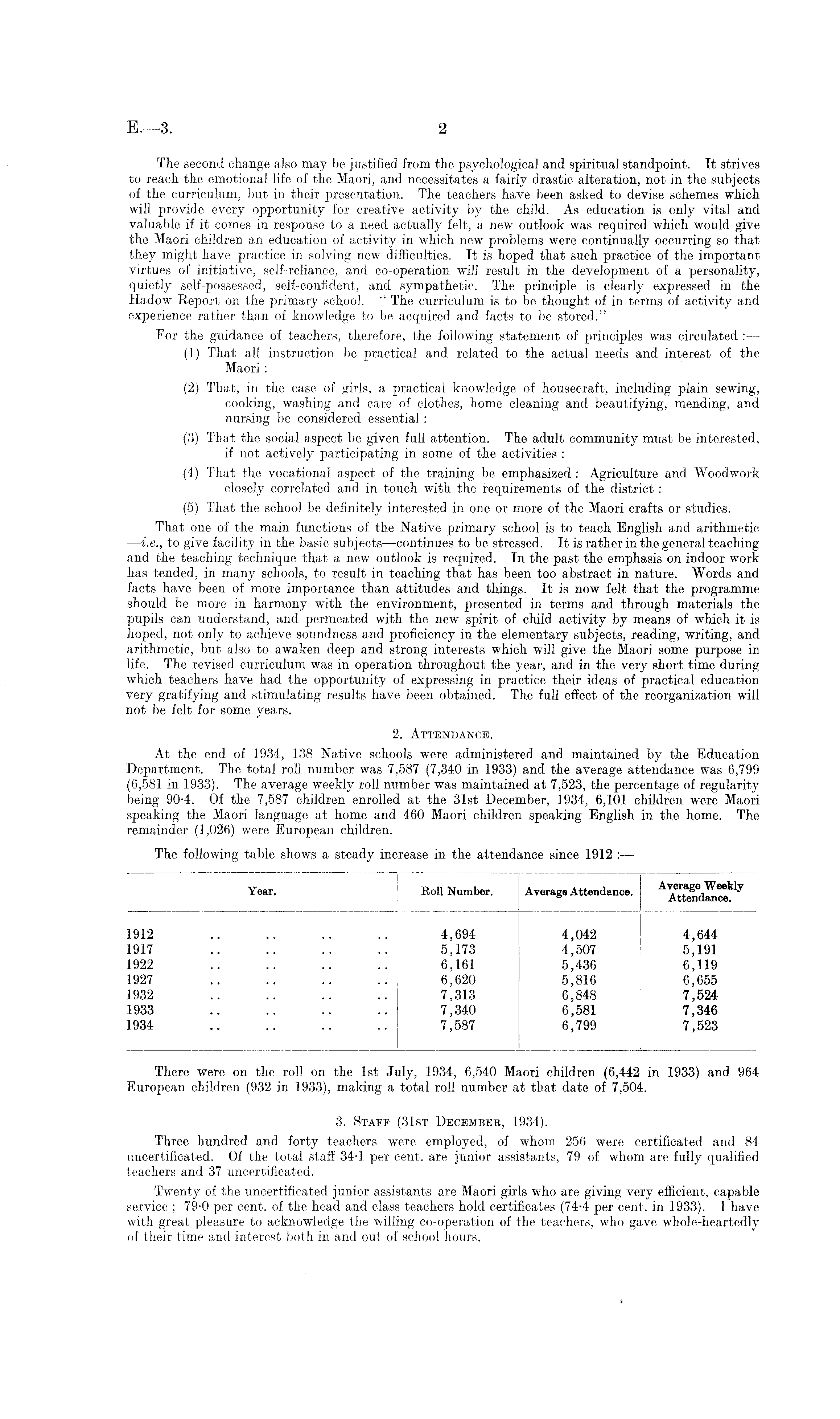 The second change also may be justified from the psychological and spiritual standpoint. It strives to reach the emotional life of the Maori, and necessitates a fairly drastic alteration, not in the subjects of the curriculum, but in their presentation. The teachers have been asked to devise schemes which will provide every opportunity for creative activity by the child. As education is only vital and valuable if it comes in response to a need actually felt, a new outlook was required which would give the Maori children an education of activity in which new problems were continually occurring so that they might have practice in solving new difficulties. It is hoped that such practice of the important virtues of initiative, self-reliance, and co-operation will result in the development of a personality, quietly self-possessed, self-confident, and sympathetic. The principle is clearly expressed in the Hadow Report on the primary school. " The curriculum is to be thought of in terms of activity and experience rather than of knowledge to be acquired a.nd facts to be stored." For the guidance of teachers, therefore, the following statement of principles was circulated : — (1) That all instruction be practical and related to the actual needs and interest of the Maori: (2) That, in the case of girls, a practical knowledge of housecraft, including plain sewing, cooking, washing and care of clothes, home cleaning and beautifying, mending, and nursing be considered essential : (3) That the social aspect be given full attention. The adult community must be interested, if not actively participating in some of the activities : (4) That the vocational aspect of the training be emphasized : Agriculture and Woodwork closely correlated and in touch with the requirements of the district: (5) That the school be definitely interested in one or more of the Maori crafts or studies. That one of the main functions of the Native primary school is to teach English and arithmetic —i.e., to give facility in the basic subjects—continues to be stressed. It is rather in the general teaching and the teaching technique that a new outlook is required. In the past the emphasis on indoor work has tended, in many schools, to result in teaching that has been too abstract in nature. Words and facts have been of more importance than attitudes and things. It is now felt that the programme should be more in harmony with the environment, presented in terms and through materials the pupils can understand, and permeated with the new spirit of child activity by means of which it is hoped, not only to achieve soundness and proficiency in the elementary subjects, reading, writing, and arithmetic, but also to awaken deep and strong interests which will give the Maori some purpose in life. The revised curriculum was in operation throughout the year, and in the very short time during which teachers have had the opportunity of expressing in practice their ideas of practical education very gratifying and stimulating results have been obtained. The full effect of the reorganization will not be felt for some years. 2. Attendance. At the end of 1934, 138 Native schools were administered and maintained by the Education Department. The total roll number was 7,587 (7,340 in 1933) and the average attendance was 6,799 (6,581 in 1933). The average weekly roll number was maintained at 7,523, the percentage of regularity being 90-4. Of the 7,587 children enrolled at the 31st December, 1934, 6,101 children were Maori speaking the Maori language at home and 460 Maori children speaking English in the home. The remainder (1,026) were European children. The following table shows a steady increase in the attendance since 1912 :—