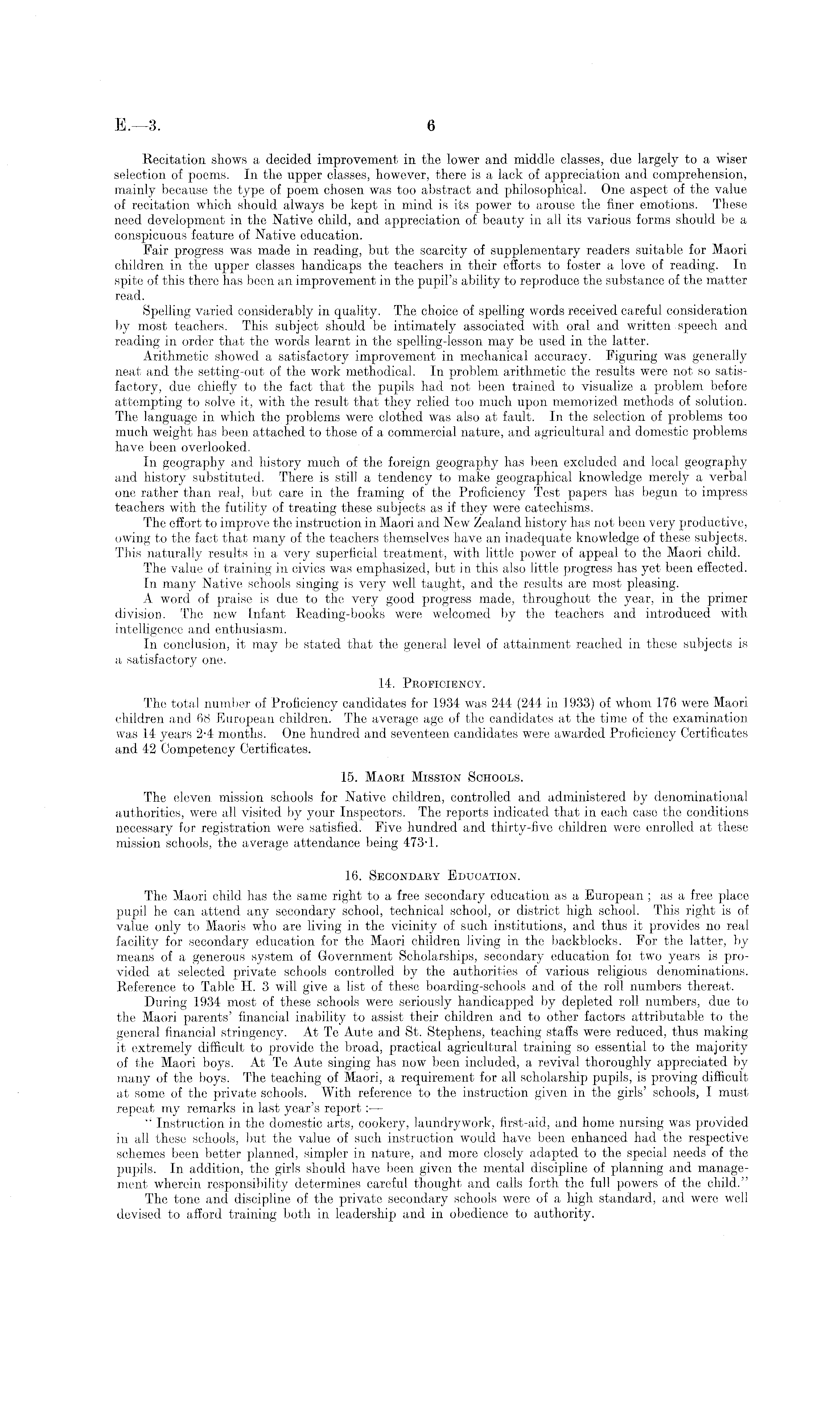 Recitation shows a decided improvement in the lower and middle classes, due largely to a wiser selection of poems. In tlie upper classes, however, there is a lack of appreciation and comprehension, mainly because the type of poem chosen was too abstract and philosophical. One aspect of the value of recitation which should always be kept in mind is its power to arouse the finer emotions. These need development in the Native child, and appreciation of beauty in all its various forms should be a conspicuous feature of Native education. Fair progress was made in reading, but the scarcity of supplementary readers suitable for Maori children in the upper classes handicaps the teachers in their efforts to foster a love of reading. In spite of this there has been an improvement in the pupil's ability to reproduce the substance of the matter read. Spelling varied considerably in quality. The choice of spelling words received careful consideration by most teachers. This subject should be intimately associated with oral and written speech and reading in order that the words learnt in the spelling-lesson may be used in the latter. Arithmetic showed a satisfactory improvement in mechanical accuracy. Figuring was generally neat and the setting-out of the work methodical. In problem arithmetic the results were not so satisfactory, due chiefly to the fact that the pupils had not been trained to visualize a problem before attempting to solve it, with the result that they relied too much upon memorized methods of solution. The language in which the problems were clothed was also at fault. In the selection of problems too much weight has been attached to those of a commercial nature, and agricultural and domestic problems have been overlooked. In geography and history much of the foreign geography has been excluded and local geography and history substituted. There is still a tendency to make geographical knowledge merely a verbal one rather than real, but care in the framing of the Proficiency Test papers has begun to impress teachers with the futility of treating these subjects as if they were catechisms. The effort to improve the instruction in Maori and New Zealand history has not been very productive, owing to the fact that many of the teachers themselves have an inadequate knowledge of these subjects. This naturally results in a very superficial treatment, with little power of appeal to the Maori child. The value of training in civics was emphasized, but in this also little progress has yet been effected. In many Native schools singing is very well taught, and the results are most pleasing. A. word of praise is due to the very good progress made, throughout the year, in the primer division. The new Infant Reading-books were welcomed by the teachers and introduced with intelligence and enthusiasm. In conclusion, it may be stated that the general level of attainment reached in these subjects is a satisfactory one. 14. Proficiency. The total number of Proficiency candidates for 1934 was 244 (244 in 1933) of whom 176 were Maori children and 68 European children. The average age of the candidates at the time of the examination was 14 years 2-4 months. One hundred and seventeen candidates were awarded Proficiency Certificates and 42 Competency Certificates. 15. Maori Mission Schools. The eleven mission schools for Native children, controlled and administered by denominational authorities, were all visited by your Inspectors. The reports indicated that in each case the conditions necessary for registration were satisfied. Five hundred and thirty-five children were enrolled at these mission schools, the average attendance being 473-1. 16. Secondary Education. The Maori child has the same right to a free secondary education as a European ; as a free place pupil he can attend any secondary school, technical school, or district high school. This right is of value only to Maoris who are living in the vicinity of such institutions, and thus it provides no real facility for secondary education for the Maori children living in the backblocks. For the latter, by means of a generous system of Government Scholarships, secondary education foi two years is provided at selected private schools controlled by the authorities of various religious denominations. Reference to Table H. 3 will give a list of these boarding-schools and of the roll numbers thereat. During 1934 most of these schools were seriously handicapped by depleted roll numbers, due to the Maori parents' financial inability to assist their children and to other factors attributable to the general financial stringency. At Te Aute and St. Stephens, teaching staffs were reduced, thus making it extremely difficult to provide the broad, practical agricultural training so essential to the majority of the Maori boys. At Te Aute singing has now been included, a revival thoroughly appreciated by many of the boys. The teaching of Maori, a requirement for all scholarship pupils, is proving difficult at some of the private schools. With reference to the instruction given in the girls' schools, I must repeat my remarks in last year's report : — " Instruction in the domestic arts, cookery, laundrywork, first-aid, and home nursing was provided in all these schools, but the value of such instruction would have been enhanced had the respective schemes been better planned, simpler in nature, and more closely adapted to the special needs of the pupils. In addition, the girls should have been given the mental discipline of planning and management wherein responsibility determines careful thought and calls forth the full powers of the child." The tone and discipline of the private secondary schools were of a high standard, and were well devised to afford training both in leadership and in obedience to authority.