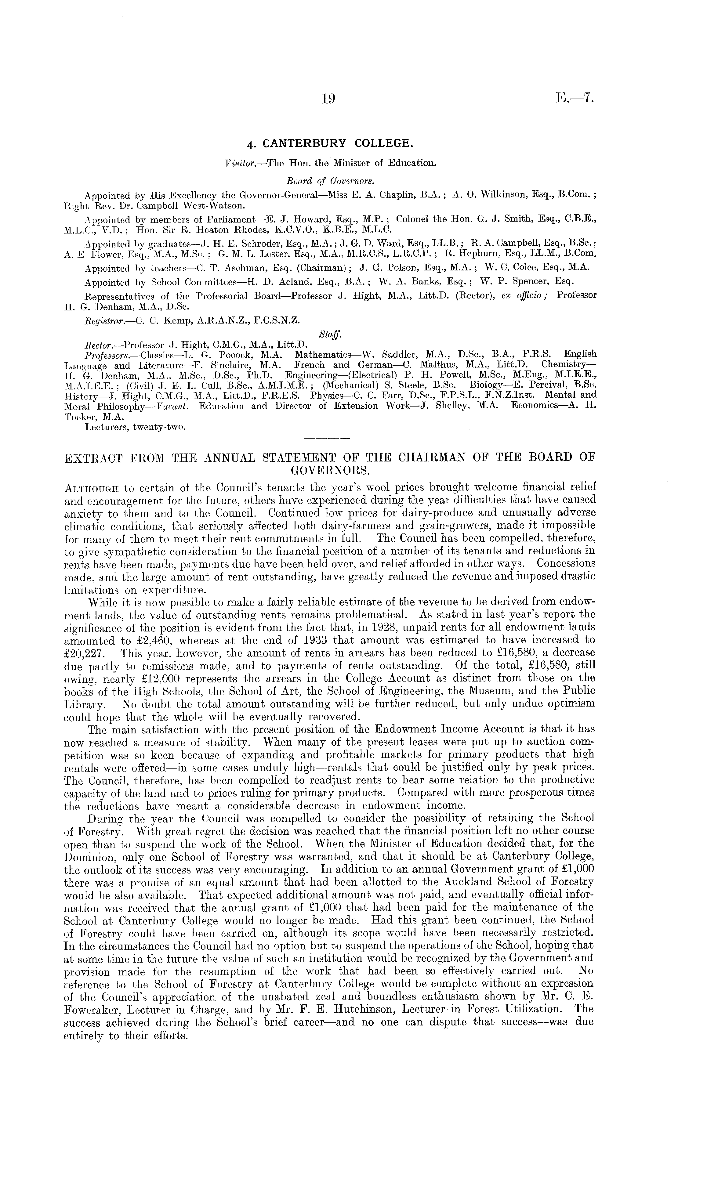 EXTRACT FROM THE ANNUAL STATEMENT OP THE CHAIRMAN OF THE BOARD OF GOVERNORS. Although to certain of the Council's tenants the year's wool prices brought welcome financial relief and encouragement for the future, others have experienced during the year difficulties that have caused anxiety to them and to the Council. Continued low prices for dairy-produce and unusually adverse climatic conditions, that seriously affected both dairy-farmers and grain-growers, made it impossible for many of them to meet their rent commitments in full. The Council has been compelled, therefore, to give sympathetic consideration to the financial position of a number of its tenants and reductions in rents have been made, payments due have been held over, and relief afforded in other ways. Concessions made, and the large amount of rent outstanding, have greatly reduced the revenue and imposed drastic limitations on expenditure. While it is now possible to make a fairly reliable estimate of the revenue to be derived from endowment lands, the value of outstanding rents remains problematical. As stated in last year's report the significance of the position is evident from the fact that, in 1928, unpaid rents for all endowment lands amounted to £2,460, whereas at the end of 1933 that amount was estimated to have increased to £20,227. This year, however, the amount of rents in arrears has been reduced to £16,580, a decrease due partly to remissions made, and to payments of rents outstanding. Of the total, £16,580, still owing, nearly £12,000 represents the arrears in the College Account as distinct from those on the books of the High Schools, the School of Art, the School of Engineering, the Museum, and the Public Library. No doubt the total amount outstanding will be further reduced, but only undue optimism could hope that the whole will be eventually recovered. The main satisfaction with the present position of the Endowment Income Account is that it has now reached a measure of stability. When many of the present leases were put up to auction competition was so keen because of expanding and profitable markets for primary products that high rentals were offered-—in some cases unduly high —rentals that could be justified only by peak prices. The Council, therefore, has been compelled to readjust rents to bear some relation to the productive capacity of the land and to prices ruling for primary products. Compared with more prosperous times the reductions have meant a considerable decrease in endowment income. During the year the Council was compelled to consider the possibility of retaining the School of Forestry. With great regret the decision was reached that the financial position left no other course open than to suspend the work of the School. When the Minister of Education decided that, for the Dominion, only one School of Forestry was warranted, and that it should be at Canterbury College, the outlook of its success was very encouraging. In addition to an annual Government grant of £1,000 there was a promise of an equal amount that had been allotted to the Auckland School of Forestry would be also available. That expected additional amount was not paid, and eventually official information was received that the annual grant of £1,000 that had been paid for the maintenance of the School at Canterbury College would no longer be made. Had this grant been continued, the School of Forestry could have been carried on, although its scope would have been necessarily restricted. In the circumstances the Council had no option but to suspend the operations of the School, hoping that at some time in the future the value of such an institution would be recognized by the Government and provision made for the resumption of the work that had been so effectively carried out. No reference to the School of Forestry at Canterbury College would be complete without an expression of the Council's appreciation of the unabated zeal and boundless enthusiasm shown by Mr. C. E. Foweraker, Lecturer in Charge, and by Mr. F. E. Hutchinson, Lecturer in Forest Utilization. The success achieved during the School's brief career —and no one can dispute that success —was due entirely to their efforts.