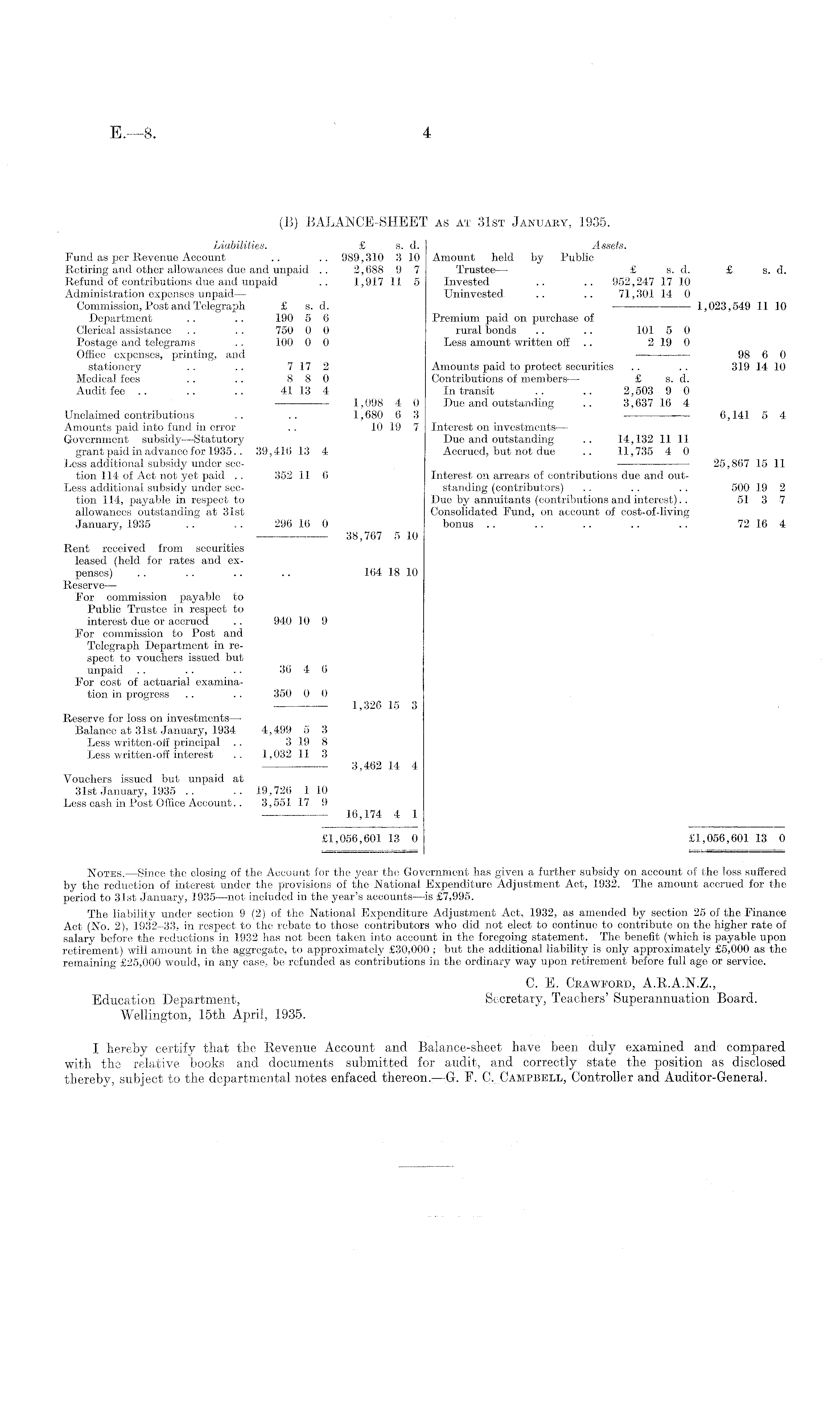 (B) BALANCE-SHEET as at 31st January, 1935. Liabilities. £ s. d. Assets. Fund as per Revenue Account .. .. 989,310 310 Amount held by Public Retiring and other allowances due and unpaid .. 2,688 9 7 Trustee — £ s. d. £ s. d. Refund of contributions due and unpaid .. 1,917 11 5 Invested .. .. 952,247 17 10 Administration expenses unpaid— Uninvested .. .. 71,301 14 0 Commission, Post and Telegraph £ s. d. — 1,023,549 11 10 Department .. .. 190 5 6 Premium paid on purchase of Clerical assistance .. .. 750 0 0 rural bonds .. .. 101 5 0 Postage and telegrams .. 100 0 0 Less amount written off 2 19 0 Office expenses, printing, and 98 6 0 stationery .. .. 717 2 Amounts paid to protect securities .. . . 319 14 10 Medical fees .. .. 8 8 0 Contributions of members — £ s. d. Audit fee .. .. .. 41 13 4 In transit .. .. 2,503 9 0 1,098 4 0 Due and outstanding .. 3,637 16 4 Unclaimed contributions .. .. 1,680 6 3 — 6,141 5 4 Amounts paid into fund in error .. 10 19 7 Interest on investments— Government subsidy—Statutory Due and outstanding .. 14,132 11 11 grant paid in advance for 1935.. 39,416 13 4 Accrued, but not due .. 11,735 4 0 Less additional subsidy under see- 25,867 15 11 tion 114 of Act not yet paid .. 352 11 6 Interest on arrears of contributions due and outLess additional subsidy under sec- standing (contributors) .. .. .. 500 19 2 tion 114, payable in respect to Due by annuitants (contributions and interest).. 51 3 7 allowances outstanding at 31st Consolidated "Fund, on account of cost-of-living January, 1935 .. .. 296 16 0 bonus .. .. .. .. .. 72 16 4 38,767 5 10 Rent received from securities leased (held for rates and expenses) .. .. .. .. 164 18 10 Reserve— For commission payable to Public Trustee in respect to interest due or accrued .. 940 10 9 For commission to Post and Telegraph Department in respect to vouchers issued but unpaid .. .. .. 36 4 6 For cost of actuarial examination in progress .. .. 350 0 0 1,326 15 3 Reserve for loss on investments— Balance at 31st January, 1934 4,499 5 3 Less written-off principal .. 3 19 8 Less written-off interest .. 1,032 11 3 3,462 14 4 Vouchers issued but unpaid at 31st January, 1935 .. .. 19,726 1 10 Less cash in Post Office Account.. 3,551 17 9 16,174 4 1 £1,056,601 13 0 £1,056,601 13 0 Notes. —Since the closing of the Account for the year the Government has given a further subsidy on account of the loss suffered by the reduction of interest under the provisions of the National Expenditure Adjustment Act, 1932. The amount accrued for the period to 31st January, 1935 —not included in the year's accounts—is £7,995. The liability under section 9 (2) of the National Expenditure Adjustment Act, 1932, as amended by section 25 of the Finance Act (No. 2), 1932-33, in respect to the rebate to those contributors who did not elect to continue to contribute on the higher rate of salary before the reductions in 1932 lias not been taken into account in the foregoing statement. The benefit (which is payable upon retirement) will amount in the aggregate, to approximately £30,000 ; but the additional liability is only approximately £5,000 as the remaining £25,000 would, in any case, be refunded as contributions in the ordinary way upon retirement before full age or service. C. E. Crawford, A.R.A.N.Z., Education Department, Secretary, Teachers' Superannuation Board. Wellington, 15th- April, 1935. I hereby certify that the Revenue Account and Balance-sheet have been duly examined and compared with the relative books and documents submitted for audit, and correctly state the position as disclosed thereby, subject to the departmental notes enfaced thereon, —G. F. C. Campbell, Controller and Auditor-General.