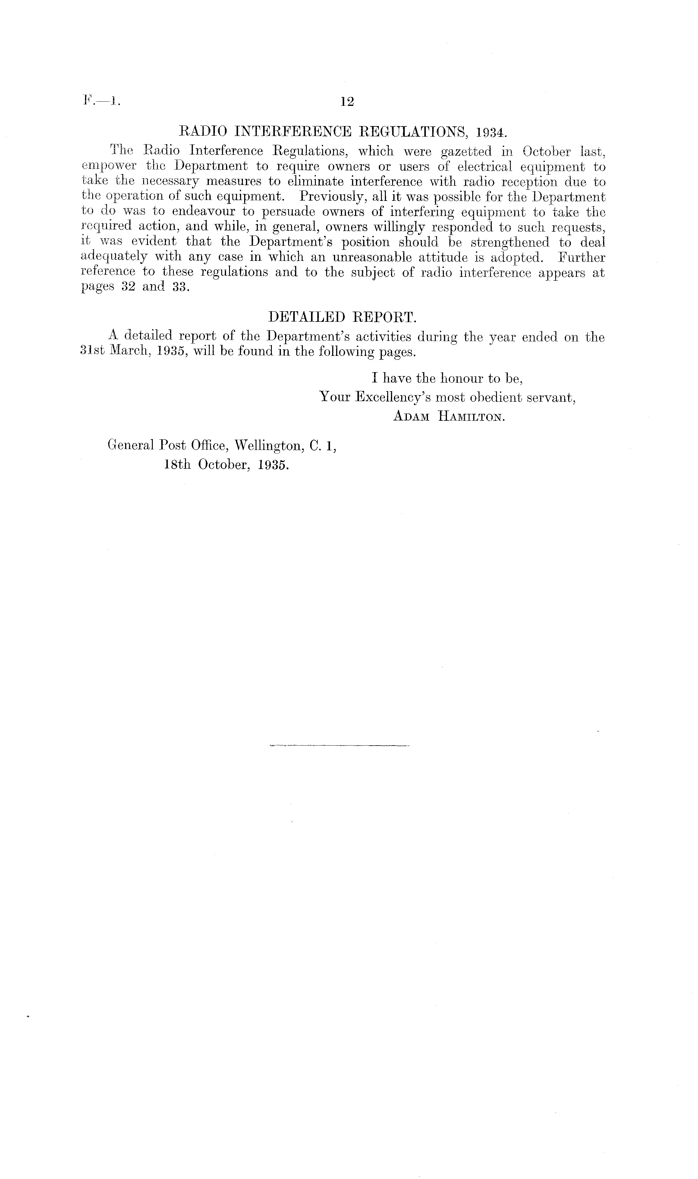 RADIO INTERFERENCE REGULATIONS, 1934. The Radio Interference Regulations, which, were gazetted in October last, empower the Department to require owners or users of electrical equipment to take the necessary measures to eliminate interference with radio reception due to the operation of such equipment. Previously, all it was possible for the Department to do was to endeavour to persuade owners of interfering equipment to take the required action, and while, in general, owners willingly responded to such requests, it was evident that the Department's position should be strengthened to deal adequately with any case in which an unreasonable attitude is adopted. Further reference to these regulations and to the subject of radio interference appears at pages 32 and 33. DETAILED REPORT. A detailed report of the Department's activities during the year ended on the 31st March, 1935, will be found in the following pages. I have the honour to be, Your Excellency's most obedient servant, Adam Hamilton. General Post Office, Wellington, C. 1, 18th October, 1935.