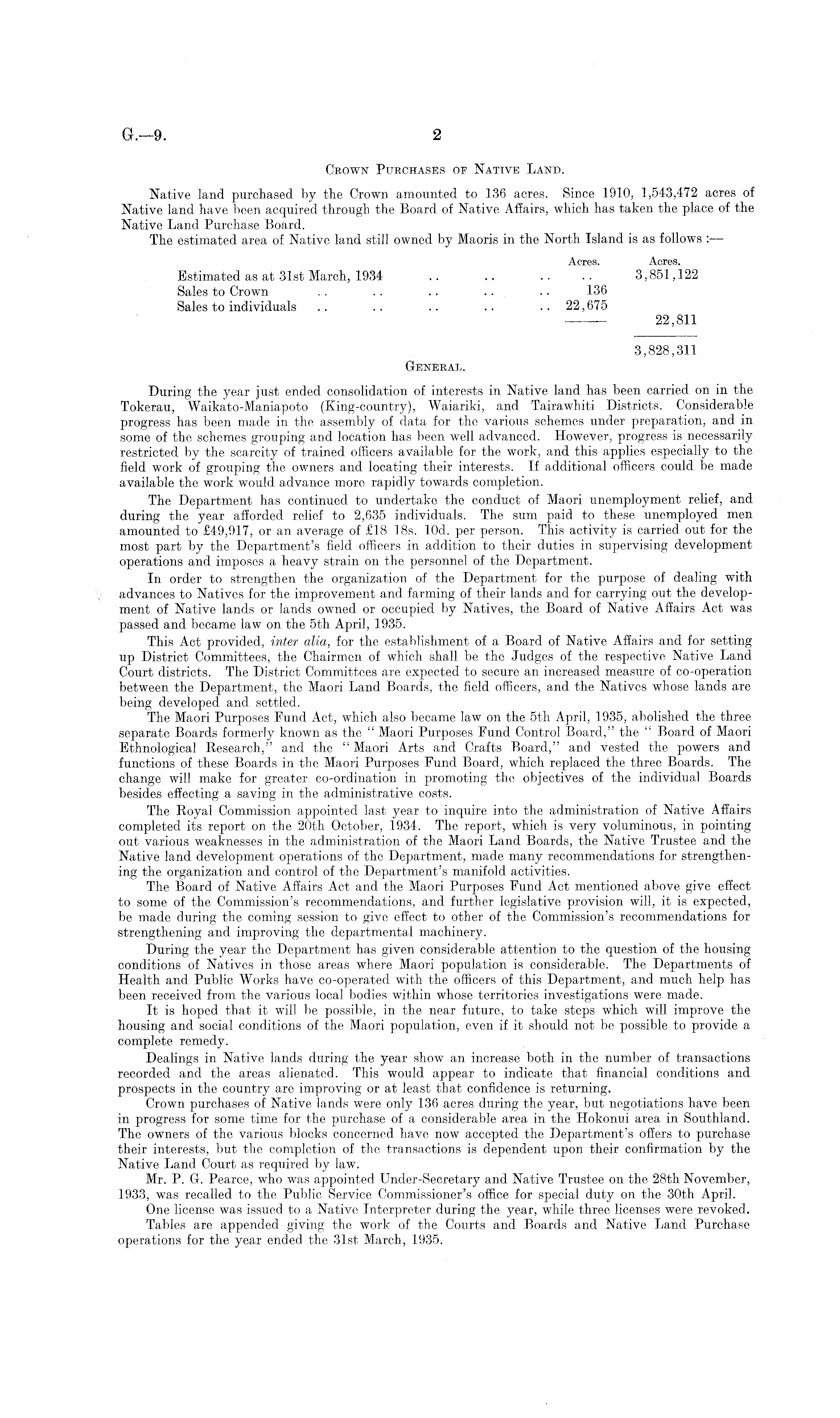 Crown Purchases of Native Land. Native land purchased by the Crown amounted to 136 acres. Since 1910, 1,543,472 acres of Native land have been acquired through the Board of Native Affairs, which has taken the place of the Native Land Purchase Board. The estimated area of Native land still owned by Maoris in the North Island is as follows : — Acres. Acres. Estimated as at 31st March, 1934 .. .. .. .. 3,851,122 Sales to Crown .. .. .. .. .. 136 Sales to individuals .. .. .. .. ..22,675 22,811 3,828,311 General. During the year just ended consolidation of interests in Native land has been carried on in the Tokerau, Waikato-Maniapoto (King-country), Waiariki, and Tairawhiti Districts. Considerable progress has been made in the assembly of data for the various schemes under preparation, and in some of the schemes grouping and location has been well advanced. However, progress is necessarily restricted by the scarcity of trained officers available for the work, and this applies especially to the field work of grouping the owners and locating their interests. If additional officers could be made available the work would advance more rapidly towards completion. The Department has continued to undertake the conduct of Maori unemployment relief, and during the year afforded relief to 2,635 individuals. The sum paid to these unemployed men amounted to £49,917, or an average of £18 18s. lOd. per person. This activity is carried out for the most part by the Department's field officers in addition to their duties in supervising development operations and imposes a heavy strain on the personnel of the Department. In order to strengthen the organization of the Department for the purpose of dealing with advances to Natives for the improvement and farming of their lands and for carrying out the development of Native lands or lands owned or occupied by Natives, the Board of Native Affairs Act was passed and became law on the sth April, 1935. This Act provided, inter alia, for the establishment of a Board of Native Affairs and for setting up District Committees, the Chairmen of which shall be the Judges of the respective Native Land Court districts. The District Committees are expected to secure an increased measure of co-operation between the Department, the Maori Land Boards, the field officers, and the Natives whose lands are being developed and settled. The Maori Purposes Fund Act, which also became law on the sth April, 1935, abolished the three separate Boards formerly known as the " Maori Purposes Fund Control Board," the " Board of Maori Ethnological Research," and the " Maori Arts and Crafts Board," and vested the powers and functions of these Boards in the Maori Purposes Fund Board, which replaced the three Boards. The change will make for greater co-ordination in promoting the objectives of the individual Boards besides effecting a saving in the administrative costs. The Royal Commission appointed last year to inquire into the administration of Native Affairs completed its report on the 20th October, 1934. The report, which is very voluminous, in pointing out various weaknesses in the administration of the Maori Land Boards, the Native Trustee and the Native land development operations of the Department, made many recommendations for strengthening the organization and control of the Department's manifold activities. The Board of Native Affairs Act and the Maori Purposes Fund Act mentioned above give effect to some of the Commission's recommendations, and further legislative provision will, it is expected, be made during the coming session to give effect to other of the Commission's recommendations for strengthening and improving the departmental machinery. During the year the Department has given considerable attention to the question of the housing conditions of Natives in those areas where Maori population is considerable. The Departments of Health and Public Works have co-operated with the officers of this Department, and much help has been received from the various local bodies within whose territories investigations were made. It is hoped that it will be possible, in the near future, to take steps which will improve the housing and social conditions of the Maori population, even if it should not be possible to provide a complete remedy. Dealings in Native lands during the year show an increase both in the number of transactions recorded and the areas alienated. This would appear to indicate that financial conditions and prospects in the country are improving or at least that confidence is returning. Crown purchases of Native lands were only 136 acres during the year, but negotiations have been in progress for some time for the purchase of a considerable area in the Hokonui area in Southland. The owners of the various blocks concerned have now accepted the Department's offers to purchase their interests, but the completion of the transactions is dependent upon their confirmation by the Native Land Court, as required by law. Mr. P. G. Pearce, who was appointed Under-Secretary and Native Trustee on the 28th November, 1933, was recalled to the Public Service Commissioner's office for special duty on the 30th April. One license was issued to a Native Interpreter during the year, while three licenses were revoked. Tables are appended giving the work of the Courts and Boards and Native Land Purchase operations for the year ended the 31st March, 1935.