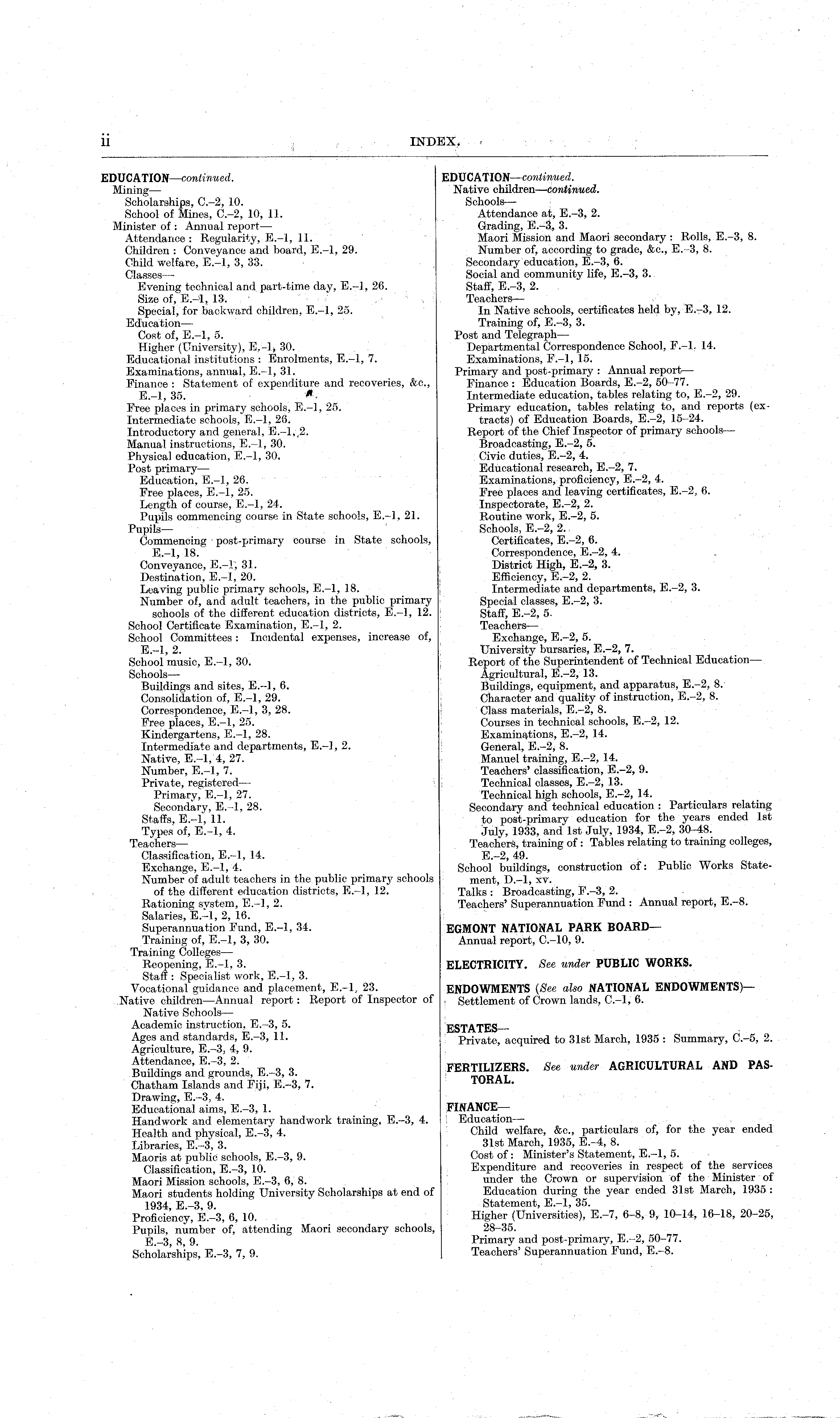 EDUCATION—continued. Native children—continued. Schools — Attendance at, E.-3, 2. Grading, E.-3, 3. Maori Mission and Maori secondary : Rolls, E.-3, 8. Number of, according to grade, &c., E.-3, 8. Secondary education, E.-3, 6. Social and community life, E.-3, 3. Staff, E.-3, 2. Teachers — In Native schools, certificates held by, E.-3, 12. Training of, E.-3, 3. Post and Telegraph— Departmental Correspondence School, E.-l. 14. Examinations, E.-l, 15. Primary and post-primary : Annual report — Finance : Education Boards, E.-2, 50-77. Intermediate education, tables relating to, E.-2, 29. Primary education, tables relating to, and reports (extracts) of Education Boards, E.-2, 15-24. Report of the Chief Inspector of primary schools — Broadcasting, E.-2, 5. Civic duties, E.-2, 4. Educational research, E.-2, 7. Examinations, proficiency, E.-2, 4. Free places and leaving certificates, E.-2, 6. Inspectorate, E.-2, 2. Routine work, E.-2, 5. Schools, E.-2, 2. Certificates, E.-2, 6. Correspondence, E.-2, 4. District High, E.-2, 3. Efficiency, E.-2, 2. Intermediate and departments, E.-2, 3. Special classes, E.-2, 3. Staff, E.-2, 5. Teachers— Exchange, E.-2, 5. University bursaries, E.-2, 7. Report of the Superintendent of Technical Education Agricultural, E.-2, 13. Buildings, equipment, and apparatus, E.-2, 8. Character and quality of instruction, E.-2, 8. Class materials, E.-2, 8. Courses in technical schools, E.-2, 12. Examinations, E.-2, 14. General, E.-2, 8. Manuel training, E.-2, 14. Teachers' classification, E.-2, 9. Technical classes, E.-2, 13. Technical high schools, E.-2, 14. Secondary and technical education : Particulars relating to post-primary education for the years ended Ist July, 1933, and Ist July, 1934, E.-2, 30-48. Teachers, training of : Tables relating to training colleges, E.-2, 49. School buildings, construction of: Public Works Statement, D.-l, xv. Talks : Broadcasting, F.-3, 2. Teachers' Superannuation Fund : Annual report, E.-8. EGMONT NATIONAL PARK BOARD — Annual report, C.-10, 9. ELECTRICITY. See under PUBLIC WORKS. ENDOWMENTS (See also NATIONAL ENDOWMENTS) — Settlement of Crown lands, C.-l, 6. ESTATES Private, acquired to 31st March, 1935 : Summary, C.-5, 2. F E™ER S . B* under AGRICULTURAL AND PASlUKAL. FINANCE Education — Child welfare, &e„ particulars of, for the year ended 31st March, 1935, E.-4, 8. Cost of: Minister's Statement, E.—l, 5. Expenditure and recoveries in respect of the services under the Crown or supervision of the Minister of Education during the year ended 31st March, 1935 : Statement, E.-l, 35. Higher (Universities), E.-7, 6-8, 9, 10-14, 16-18, 20-25, 28-35. Primary and post-primary, E.-2, 50-77. Teachers' Superannuation Fund, E.-8.