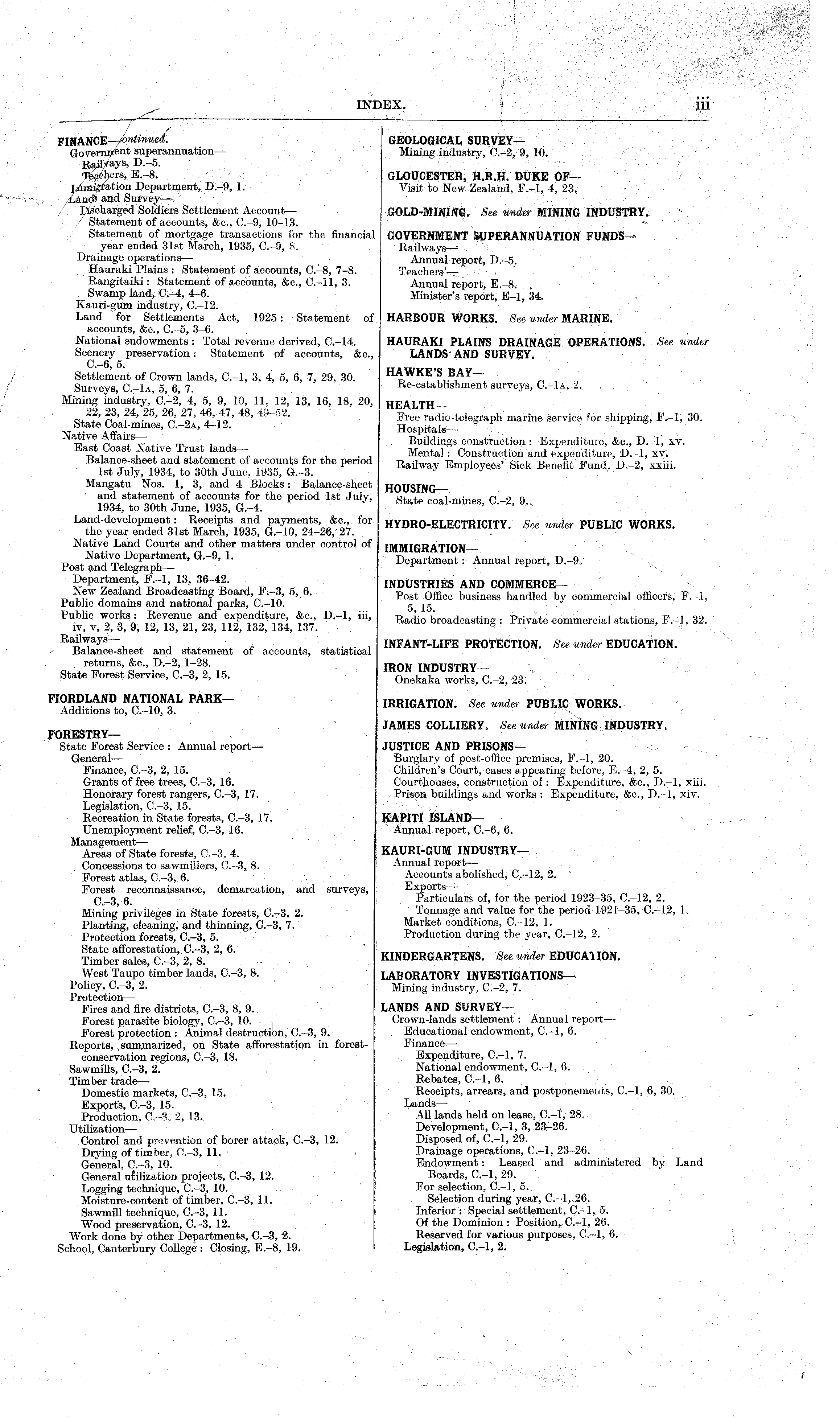 GEOLOGICAL SURVEY— Mining industry, 0.-2, 9, 10. GLOUCESTER, H.R.H. DUKE OF— Visit to New Zealand, F.-l, 4, 23. GOLD-MINING. See under MINING INDUSTRY. GOVERNMENT SUPERANNUATION FUNDS — Railways— Annual report, D.-5. Teachers'— Annual report, E.-8. Minister's report, E-l, 34. HARBOUR WORKS. See under MARINE. HAURAKI PLAINS DRAINAGE OPERATIONS. See under LANDS AND SURVEY. HAWKE S BAY lie-establishment surveys, C.-la, 2. HFALTH Ereo ra«lii -telegraph marine service for shipping, F.-l, 30. HospitalsBuildings construction: Expenditure, &c., D.-l, xv. Mental : Construction and expenditure, D.-l, xv. Railway Employees' Sick Benefit Fund. D.-2, xxiii. J HOUSING - State coal-mines, C.-2, 9. HYDKO-ELECTRICITY. See under PUBLIC WORKS. IMMIGRATION Department: Annual report, D.-9. x 1 INDUSTRIES AND COMMERCE— Post Office business handled by commercial officers, F.-l, 5 lō Radiobroadcasting: Private commercial stations, F.-l, 32. ° INFANT-LIFE PROTECTION. See under EDUCATION. IRON INDUSTRY - Onekaka works, C.-2, 23. IRRIGATION. See under PUBLIC WORKS. JAMES COLLIERY. See under MINING INDUSTRY, JUSTICE AND PRISONS— Burglary of post-office premises, F.-l, 20. Children's Court, cases appearing before, E.-4, 2, 5. Courthouses, construction of: Expenditure, &c., D.-l, xiii. Prison buildings and works : Expenditure, &c., D.-l, xiv. KAPITI ISLAND — Annual report, C.-6, 6. KAURI-GUM INDIfSTRY Annual report Accounts abolished, C.-12, 2. Exports Particulars of, for the period 1923-35, C.-12, 2. Tonnage and value for the period-1921-35, C.-12, 1. Market conditions, C 12, 1. Production during the ;w, C.-12, 2. C! / KINDERGARTENS. undev EDUCATION. LABORATORY INVESTIGATIONS— Mining industry, C.-2, 7. LANDS AND SURVEY — Crown-lands settlement: Annual reportEducational endowment, C.-l, 6. Finance — Expenditure, C.-l, 7. National endowment, C.-l, 6. Rebates, C.-l, 6. Receipts, arrears, and postponements, C.-l, 6, 30. Lands — All lands held on lease, C.-l, 28. Development, C.—l, 3, 23—26. Disposed of, C.-l, 29. Drainage operations, C.-l, 23-26. Endowment: Leased and administered by Land Boards, C.-l, 29. For selection, C.-l, 5. Selection during year, C.-l, 26. Inferior : Special settlement, C.-l, 5. Of the Dominion : Position, C.-l, 26. Reserved for various purposes, C.-l, 6. Legislation, C.-l, 2.