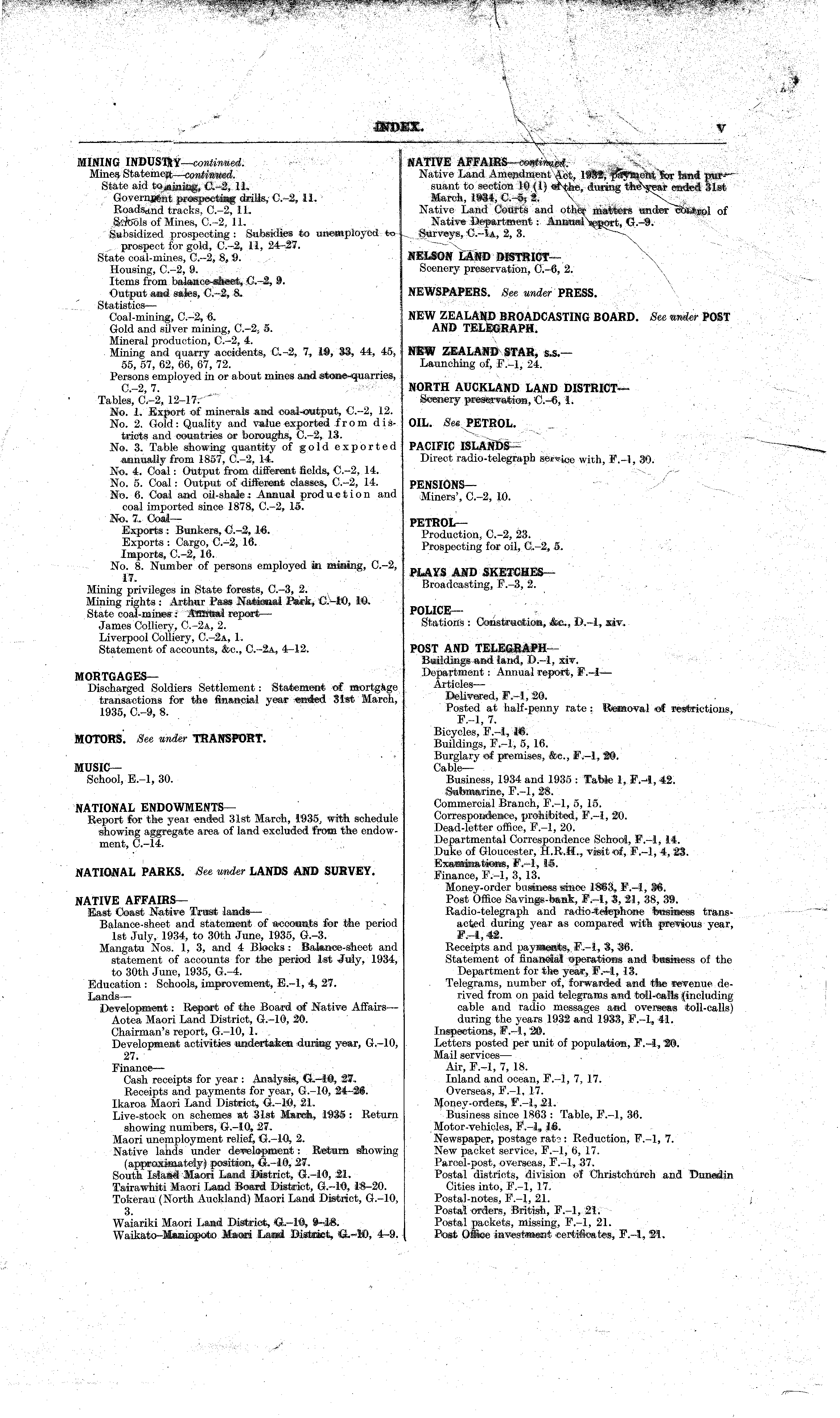 NATIVE AFFAIRS- contact. Native Land Amendment Act, 1932, payment for land pur suant to section 10 (I) of the, during the year ended 31st March, 1934, C.-5, 2. Native Land Courts and other matters under control of Native Department: Annual report, G.-9. Surveys, C.-la, 2, 3. NELSON LAND DISTRICT— Scenery preservation, C.-6, 2. NEWSPAPERS. See under PRESS. NEW ZEALAND BROADCASTING BOARD See under POST AND TELEGRAPH. NEW ZEALAND STAR, s.S — Launching of, F.-l, 24. NORTH AUCKLAND LAND DISTRICT— Scenery preservation, C.-6, 1. OIL. See PETROL. PACIFIC ISLANDS— Direct radio-telegraph service with, F.-l, 30, PENSIONS— Miners', C.-2, 10. PETROL— Production, C.-2, 23. Prospecting for oil, C.-2, 5. PLAYS AND SKETCHES— Broadcasting, F. 3. 2. POLICE— Stations : Construction, &c., D.-l, xiv. POST AND TELEGRAPH— Buildings and laud, D.-l, xiv. Department: Annual report, F.-I— Articles— Delivered, F.-l, 20. Posted at half-penny rate : Removal of restrictions, F.-l, 7. Bicycles, F.-l, 16. Buildings, F.-l, 5, 16. Burglary of premises, &c., F.-l, 20. CableBusiness, 1934 and 1935 : Table 1, F. -1, 42. Submarine, F.-l, 28. Commercial Branch, F.-l, 5, 15. Correspondence, prohibited, F.-l, 20. Dead-letter office, F.-l, 20. Departmental Correspondence School, F.-l, 14. Duke of Gloucester, H.R.H., visit of, F.-l, 4, 23. Examinations, F.-l, 15. Finance, F.-l, 3, 13. Money-order business since 1863, F.-l, 36. Post Office Savings-bank, F.-l, 3, 21, 38, 39. Radio-telegraph and radio-telephone business transacted during year as compared with previous year, F.-l, 42. Receipts and payments, F.-l, 3, 36. Statement of financial operations and business of the Department for the year, F.-l, 13. Telegrams, number of, forwarded and the revenue derived from on paid telegrams and toll-calls (including cable and radio messages and overseas toll-calls) during the years 1932 and 1933, F.-l, 41. Inspections, F.-l, 20. Letters posted per unit of population, F.-l, 20. Mail services— Air, F.-l, 7, 18. Inland and ocean, F.-l, 7, 17. Overseas, F.-l, 17. Money-orders, F.-l, 21. Business since 1863 : Table, F.-l, 36. Motor-vehicles, F.-l, 16. Newspaper, postage rat? : Reduction, F.-l, 7. New packet service, F.-l, 6, 17. Parcel-post, overseas, F.-l, 37. Postal districts, division of Christchurcb and Dunedin Cities into, F.-l, 17. Postal notes, F.-l, 21. Postal orders, British, F.-l, 21. Postal packets, missing, F.-l, 21. Post Office investment certificates, F.-I, 21.