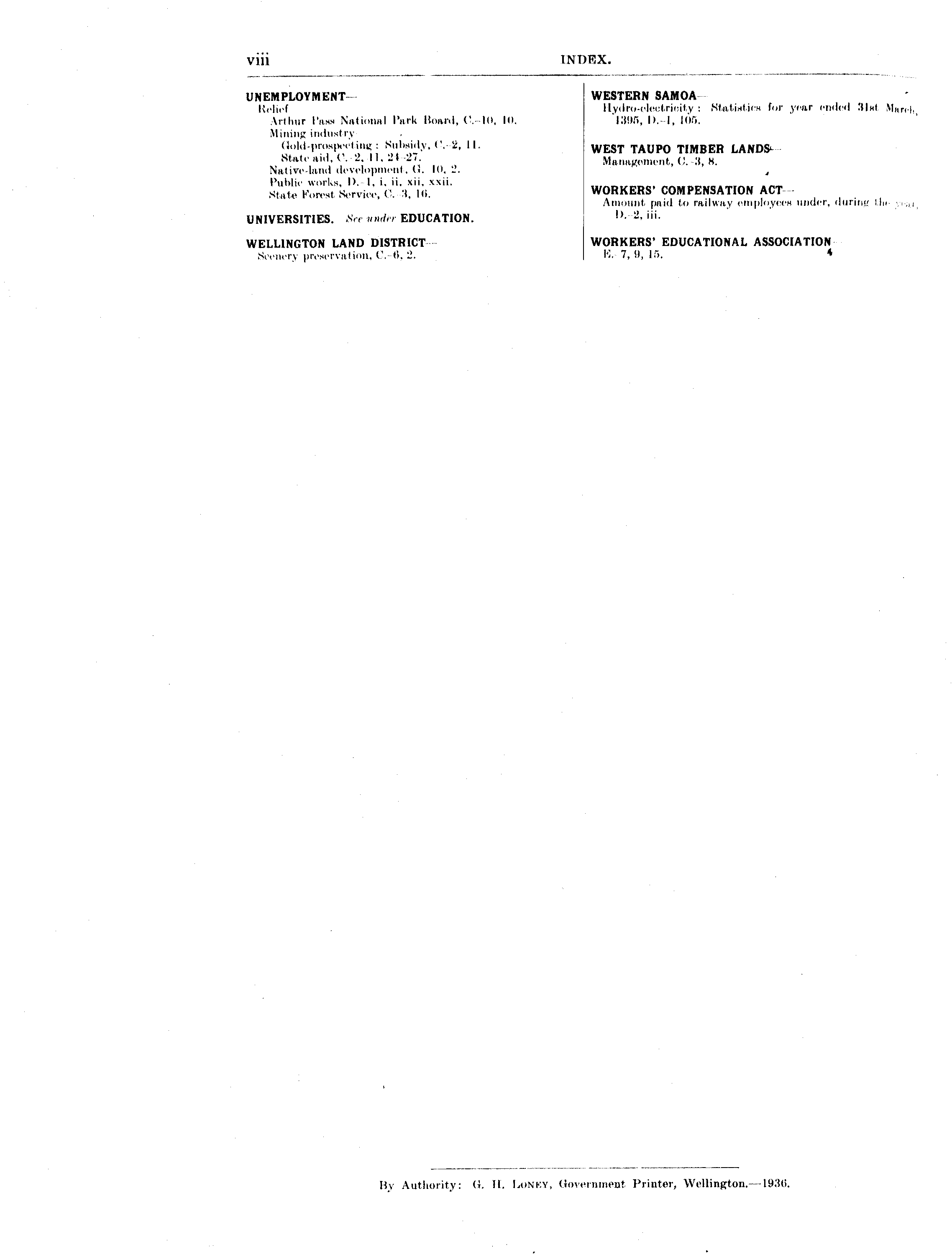 UNEMPLOYMENT— Relief Arthur Pans National Park Board, C.-10, 10. Mining industry— Gold-proa poo ting : Subsidy, C.-2, 11. State aid, C. 2. 11. 24 -27.' Native-land development, O. 10. 2. Public works, D.-l, i, ii, xii. xxii. State Forest Service, C.-.'i, 16. UNIVERSITIES. See under EDUCATION. WELLINGTON LAND DISTRICT — Scenery preservation, C.-6, 2.