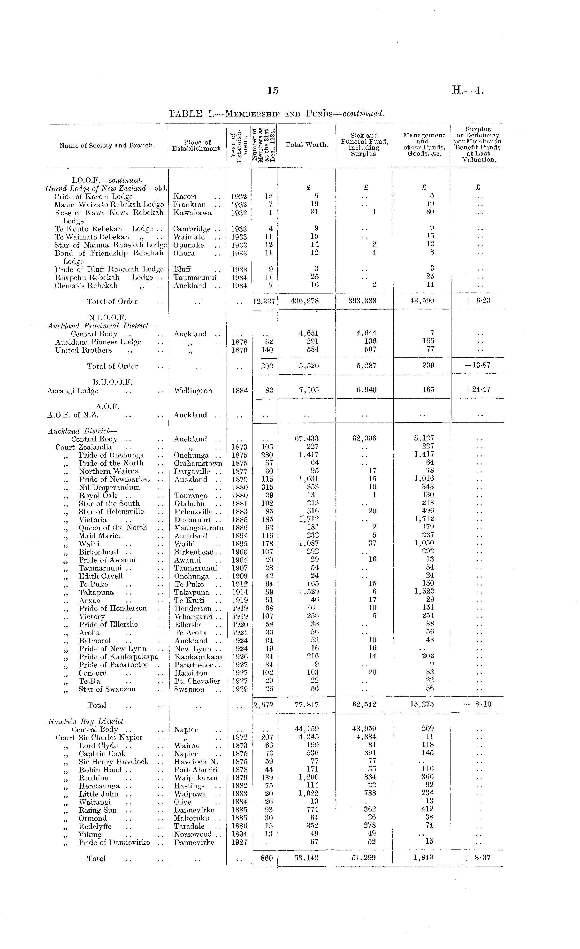 Surplus q% u oiTHg Sick and Management or Deficiency „ „ , , Place of ■-> — a Funeral Fund, and per Member in I\ame of Society and Branch. Establishment. ■i'SS S'o-o " Total Woith. including other Funds, Benefit Funds fw® Surplus Goods, &c. at Last H P Valuation, 1.0.0.F.—continued. Grand Lodge of New Zealand—ctd. £ £ £ £ Pride of Karori Lodge .. Karori .. 1932 15 5 .. 5 Matua Waikato Rebekah Lodge Frankton .. 1932 7 19 .. 19 Rose of Kawa Kawa Rebekah Kawakawa 1932 1 81 1 80 Lodge Te Koutu Rebekah Lodge .. Cambridge .. 1933 4 9 , . 9 Te Waimate Rebekah ',, .. Waimate .. 1933 11 15 •• 15 Star of Naumai Rebekah Lodge Opunake .. 1933 12 14 2 12 Bond of Friendship Rebekah Ohura .. 1933 11 12 4 8 Lodge Pride of Bluff Rebekah Lodge Bluff .. 1933 9 3 .. 3 Ruapehu Rebekah Lodge .. Taumarunui 1934 11 25 .. 25 Clematis Rebekah ,, .. Auckland .. 1934 7 16 2 14 Total of Order .. .. .. 12,337 436,978 393,388 43,590 + 6-23 N.I.O.O.F. Auckland Provincial District — Central Body .. .. Auckland .. .. .. 4,651 4,644 7 Auckland Pioneer Lodge .. ,, .. 1878 62 291 136 155 United Brothers „ .. „ .. 1879 140 584 507 77 Total of Order .. .. .. 202 5,526 5,287 239 -13-87 B.U.O.O.F. Aorangi Lodge .. •• Wellington 1884 83 7,105 6,940 165 +24-47 A.O.F. A.O.F. of N.Z. .. .. Auckland .... Auckland District— Central Body .. .. Auckland .. .. .. 67,433 62,306 5,127 Court Zealandia .. .. „ .. 1873 105 227 .. 227 „ Pride of Onehunga .. Onehunga .. 1875 280 1,417 .. 1,417 „ Pride of the North .. Grahamstown 1875 57 64 .. 64 „ Northern Wairoa .. Dargaville .. 1877 60 95 17 78 „ Pride of Newmarket .. Auckland .. 1879 115 1,031 15 1,016 „ Nil Desperandum .. „ .. 1880 315 353 10 343 „ Royal Oak .. .. Tauranga .. 1880 39 131 1 130 „ Star of the South .. Otahuhu .. 1881 102 213 .. 213 „ Star of Helensville .. Helensville .. 1883 85 516 20 496 „ Victoria .. .. Devonport .. 1885 185 1,712 .. 1,712 „ Queen of the North .. Maungaturoto 1886 63 181 2 179 „ Maid Marion .. Auckland .. 1894 116 232 5 227 „ Waihi .. .. Waihi .. 1895 178 1,087 37 1,050 „ Birkenhead .. .. Birkenhead.. 1900 107 292 .. 292 „ Pride of Awanui .. Awanui .. 1904 20 29 16 13 „ Taumarunui .. .. Taumarunui 1907 28 54 .. 54 „ Edith Cavell .. Onehunga .. 1909 42 24 .. 24 „ Te Puke .. .. Te Puke .. 1912 64 165 15 150 ,, Takapuna .. .. Takapuna .. 1914 59 1,529 6 1,523 „ Anzac .. .. Te Kuiti .. 1919 51 46 17 29 „ Pride of Henderson . Henderson . . 1919 68 161 10 151 ,, Victory .. . Whangarei .. 1919 107 256 5 251 „ Pride of Ellerslie . EUershe .. 1920 58 38 .. 38 „ Aroha .. . Te Aroha .. 1921 33 56 .. 56 ,, Balmoral .. . . Auckland . . 1924 91 53 10 43 „ Pride of New Lynn . . New Lynn .. 1924 19 16 16 „ Pride of Kaukapakapa Kaukapakapa 1926 34 216 14 202 ,, Pride of Papatoetoe . Papatoetoe.. 1927 34 9 9 „ Concord . . . . Hamilton .. 1927 102 103 20 83 „ Te-Ra .. . . Pt. Chevalier 1927 29 22 .. 22 ... „ Star of Swanson . Swanson .. 1929 26 56 . . 56 Total .. . .. .. 2,672 77,817 62,542 15,275 -8-10 Hawke's Bay District— Central Body .. .. Napier .. .. .. 44,159 43,950 209 Court Sir Charles Napier .. „ .. 1872 207 4,345 4,334 11 „ Lord Clyde .. .. Wairoa . . 1873 66 199 81 118 „ Captain Cook . . Napier .. 1875 73 536 391 145 „ Sir Henry Havelock . , Havelock N. 1875 59 77 77 .. .. „ Robin Hood.. .. Port Ahuriri 1878 44 171 55 116 „ Ruahine .. .. Waipukurau 1879 139 1,200 834 366 „ Heretaunga .. .. Hastings .. 1882 75 114 22 92 ,, Little John .. .. Waipawa .. 1883 20 1,022 788 234 „ Waitangi .. .. Clive .. 1884 26 13 .. 13 „ Rising Sun .. .. Dannevirke 1885 93 774 362 412 ,, Ormond .. .. Makotuku .. 1885 30 64 26 38 „ Redclyffe .. .. Taradale .. 1886 15 352 278 74 „ Viking .. .. Norsewood . . 1894 13 49 49 „ Pride of Dannevirke .. Dannevirke 1927 .. 67 52 15 Total .. .. .. .. 860 53,142 51,299 1,843 +8-37