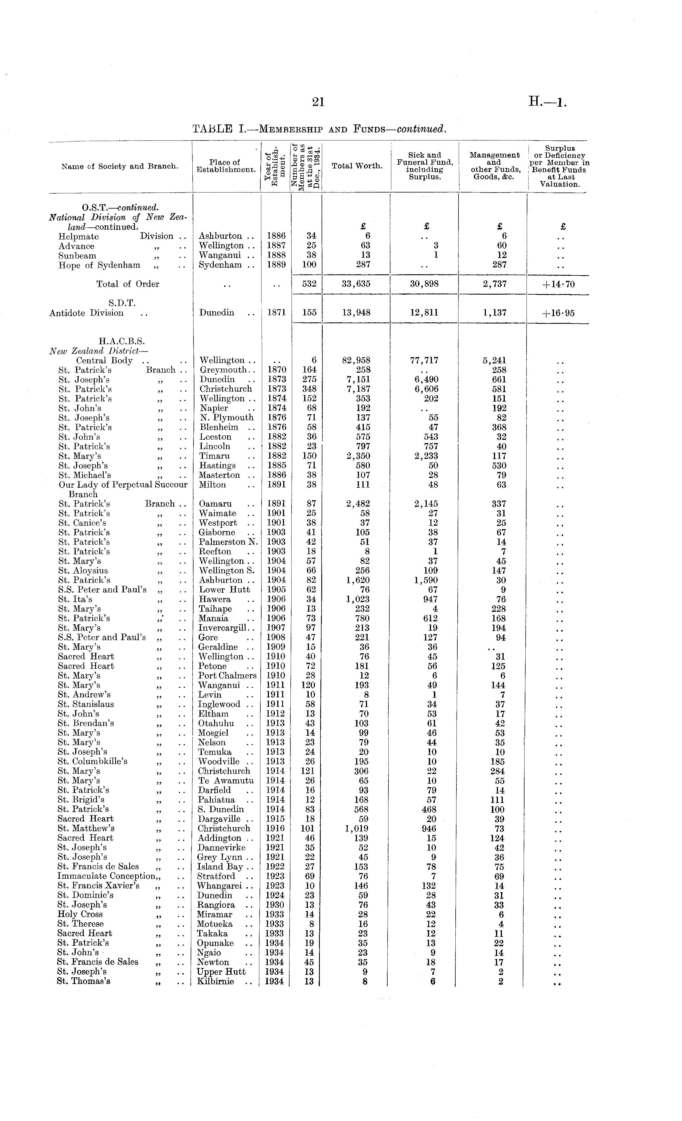 A o S ~ • i Surplus mcohm Sick and Management or Deficiency Name of Society and Branch. Bs fe°ient. g!| |H® Total Worth. otherfunds, j^nSd? >h m d S 43 Surplus. Goods, &c. at Last H i Valuation. O.S.T.—continued. National Division of New Zealand —continued. £ £ £ £ Helpmate Division .. Ashburton .. 1886 34 6 .. 6 Advance „ .. Wellington .. 1887 25 63 3 60 Sunbeam „ .. Wanganui .. 1888 38 13 1 12 Hope of Sydenham „ .. Sydenham .. 1889 100 287 .. 287 Total of Order .. .. 532 33,635 30,898 2,737 +14-70 S.D.T. Antidote Division .. Dunedin .. 1871 155 13,948 12,811 1,137 +16-95 H.A.C.B.S. New Zealand District — Central Body .. .. Wellington.. .. 6 82,958 77,717 5,241 St. Patrick's Branch .. Greymouth,. 1870 164 258 .. 258 St. Joseph's „ .. Dunedin .. 1873 275 7,151 6,490 661 St. Patrick's „ .. Christchurch 1873 348 7,187 6,606 581 St. Patrick's „ .. Wellington .. 1874 152 353 202 151 St. John's „ .. Napier .. 1874 68 192 .. 192 St. Joseph's „ N. Plymouth 1876 71 137 55 82 St. Patrick's „ .. Blenheim .. 1876 58 415 47 368 St. John's „ .. Leeston .. 1882 36 575 543 32 St. Patrick's „ .. Lincoln .. 1882 23 797 757 40 St. Mary's „ .. Timaru .. 1882 150 2,350 2,233 117 St. Joseph's „ .. Hastings .. 1885 71 580 50 530 St. Michael's „ .. Masterton .. 1886 38 107 28 79 Our Lady of Perpetual Succour Milton .. 1891 38 111 48 63 Branch St. Patrick's Branch .. Oamaru .. 1891 87 2,482 2,145 337 St. Patrick's „ .. Waimate .. 1901 25 58 27 31 St. Canice's „ .. Westport .. 1901 38 37 12 25 St. Patrick's „ .. Gisborne .. 1903 41 105 38 67 St. Patrick's „ .. Palmerston N. 1903 42 51 37 14 St. Patrick's ,, .. Reefton .. 1903 18 8 1 7 St. Mary's „ .. Wellington .. 1904 57 82 37 45 St. Aloysius „ .. Wellington S. 1904 66 256 109 147 St. Patrick's ,, .. Ashburton .. 1904 82 1,620 1,590 30 S.S. Peter and Paul's „ .. Lower Hutt 1905 62 76 67 9 St. Ita's „ .. Hawera .. 1906 34 1,023 947 76 St. Mary's „ .. Taihape .. 1906 13 232 4 228 St. Patrick's .. Manaia .. 1906 73 780 612 168 St. Mary's „ .. Invercargill.. 1907 97 213 19 194 S.S. Peter and Paul's „ .. Gore .. 1908 47 221 127 94 St. Mary's „ .. Geraldine .. 1909 15 36 36 Sacred Heart ,, .. Wellington .. 1910 40 76 45 31 Sacred Heart „ .. Petone .. 1910 72 181 56 125 St. Mary's „ .. Port Chalmers 1910 28 12 6 6 St. Mary's „ .. Wanganui .. 1911 120 193 49 144 St. Andrew's „ .. Levin .. 1911 10 8 1 7 St. Stanislaus „ .. Inglewood .. 1911 58 71 34 37 St. John's „ .. Eltham .. 1912 13 70 53 17 St. Brendan's „ .. Otahuhu .. 1913 43 103 61 42 St. Mary's „ .. Mosgiel .. 1913 14 99 46 53 St. Mary's „ .. Nelson .. 1913 23 79 44 35 St. Joseph's „ .. Temuka .. 1913 24 20 10 10 St. Columbkille's „ .. Woodville .. 1913 26 195 10 185 St. Mary's „ .. Christchurch 1914 121 306 22 284 St. Mary's „ Te Awamutu 1914 26 65 10 55 St. Patrick's „ .. Darfield .. 1914 16 93 79 14 St. Brigid's „ .. Pahiatua .. 1914 12 168 57 111 St. Patrick's „ S. Dunedin 1914 83 568 468 100 Sacred Heart „ .. Dargaville .. 1915 18 59 20 39 St. Matthew's „ .. Christchurch 1916 101 1,019 946 73 Sacred Heart „ .. Addington .. 1921 46 139 15 124 St. Joseph's „ .. Dannevirke 1921 35 52 10 42 St. Joseph's „ .. Grey Lynn .. 1921 22 45 9 36 St. Francis de Sales „ .. Island Bay .. 1922 27 153 78 75 Immaculate Conception,, .. Stratford .. 1923 69 76 7 69 St. Francis Xavier's „ .. Whangarei .. 1923 10 146 132 14 St. Dominic's „ .. Dunedin .. 1924 23 59 28 31 St. Joseph's „ .. Rangiora .. 1930 13 76 43 33 Holy Cross „ .. Miramar .. 1933 14 28 22 6 St. Therese „ .. Motueka .. 1933 8 16 12 4 Sacred Heart „ .. Takaka .. 1933 13 23 12 11 St. Patrick's „ .. Opunake .. 1934 19 35 13 22 St. John's „ Ngaio .. 1934 14 23 9 14 St. Francis de Sales „ .. Newton .. 1934 45 35 18 17 St. Joseph's „ .. Upper Hutt 1934 13 9 7 2 St. Thomas's „ .. | Kilbirnie .. 1934 13 8 6 2