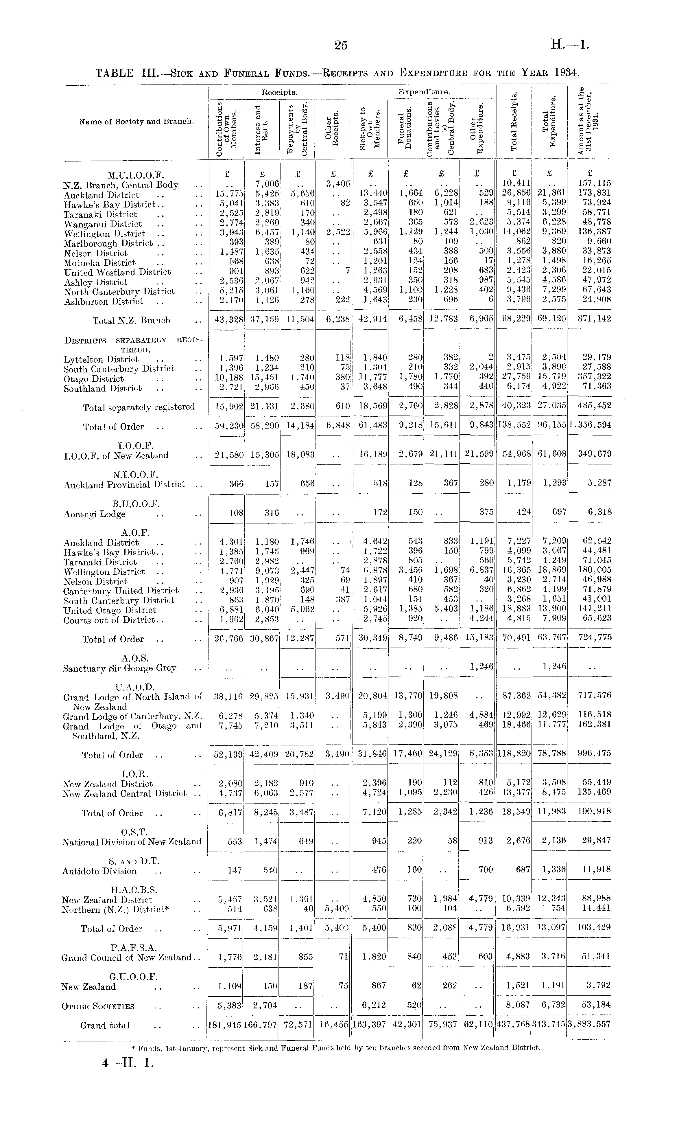 TABLE III.—Sick and Funeral Funds. —Receipts and Expenditure for the Year 1934.