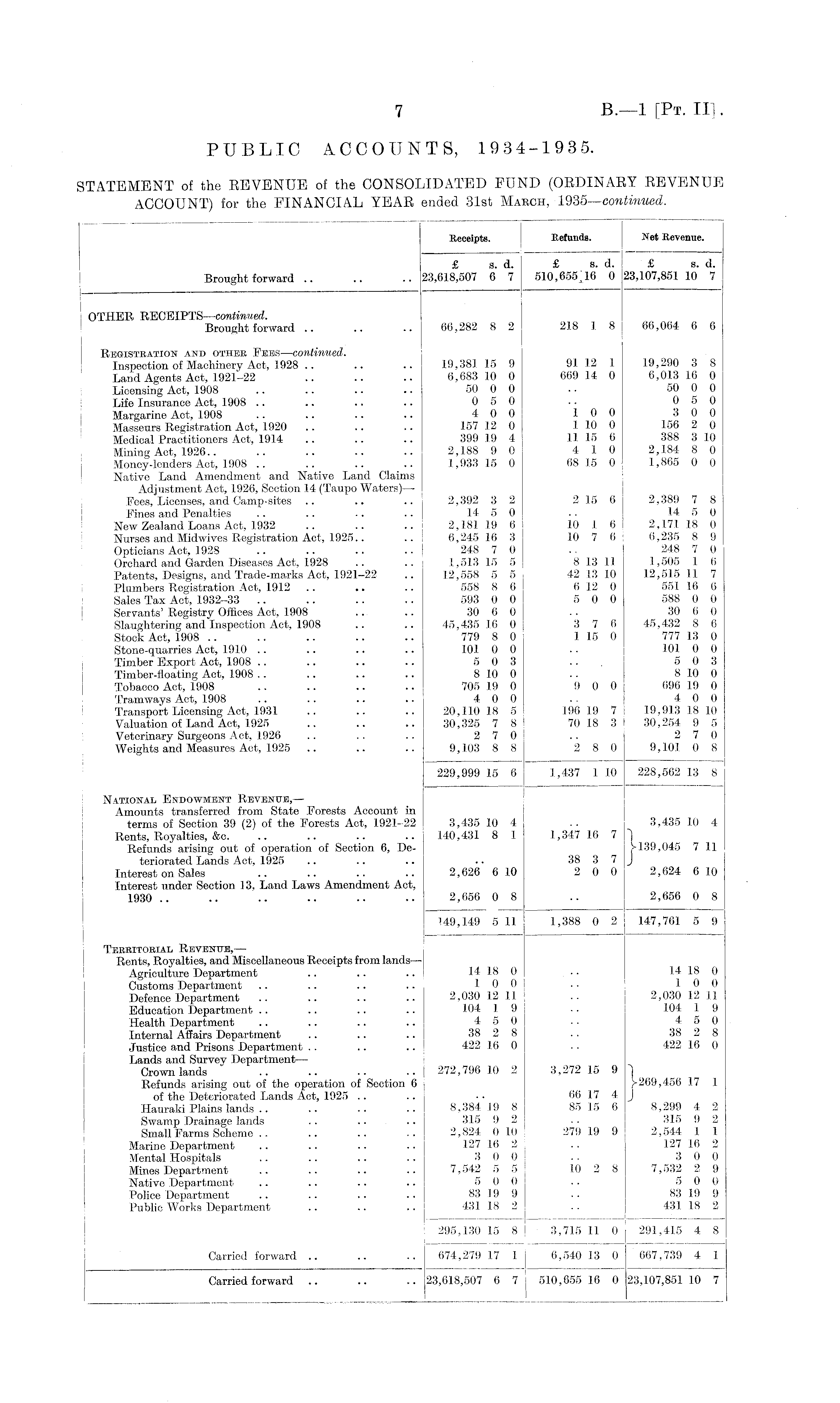 Receipts. Refunds. Jfet Revenue. £ s. d. £ s. d. £ s. d. Brought forward .. .. .. 23,618,507 6 7 510,655; 16 0 23,107,851 10 7 OTHER RECEIPTS— continued. Brought forward .. .. .. 66,282 8 2 218 1 8 66,064 6 6 Reoistkation and otheb Fees— continued. Inspection of Machinery Act, 1928 .. .. .. 19,38115 9 91 12 1 19,290 3 8 Land Agents Act, 1921-22 .. .. .. 6,683 10 0 669 14 0 6,013 16 0 Licensing Act, 1908 .. .. .. .. 50 0 0 .. 50 0 0 Life Insurance Act, 1908 .. .. .. .. 050 .. 050 Margarine Act, 1908 .. .. .. .. 400 100 300 Masseurs Registration Act, 1920 .. 157 12 0 1 10 0 156 2 0 Medical Practitioners Act, 1914 .. .. .. 399 19 4 11 15 6 388 3 10 Mining Act, 1926 2,188 9 0 4 10 2,184 8 0 Money-lenders Act, 1908 .. .. .. .. 1,933 15 0 68 15 0 1,865 0 0 Native Land Amendment and Native Land Claims Adjustment Act, 1926, Section 14 (Taupo Waters) — Fees, Licenses, and Camp-sites .. .. .. 2,392 3 2 2 15 6 2,389 7 8 Fines and Penalties .. .. .. .. 14 5 0 .. 14 5 0 New Zealand Loans Act, 1932 .. .. .. 2,181 19 6 10 1 6 2,171 18 0 Nurses and Midwives Registration Act, 1925.. .. 6,245 16 3 10 7 6 | 6,235 8 9 Opticians Act, 1928 .. .. .. .. 248 7 0 .. 248 7 0 Orchard and Garden Diseases Act, 1928 .. .. 1,513 15 5 8 13 11 1,505 1 6 Patents, Designs, and Trade-marks Act, 1921-22 .. 12,558 5 5 42 13 10 12,515 11 7 Plumbers Registration Act, 1912 .. .. .. 558 8 6 6 12 0 551 16 6 Sales Tax Act, 1932-33 .. .. .. .. 593 0 0 5 0 0 588 0 0 Servants'Registry Offices Act, 1908 .. .. 30 6 0 .. 30 6 0 Slaughtering and Inspection Act, 1908 .. .. 45,435 16 0 3 7 6 45,432 8 6 Stock Act, 1908 .. .. .. .. .. 779 8 0 1 15 0 777 13 0 Stone-quarries Act, 1910 .. .. .. .. 101 0 0 .. 101 0 0 Timber Export Act, 1908 .. .. .. .. 503 ... 503 Timber-floating Act, 1908 .. .. .. .. 8 10 0 .. 8 10 0 Tobacco Act, 1908 .. .. .. .. 705 19 0 9 0 0 696 19 0 Tramways Act, 1908 .. .. .. .. 400 .. 400 Transport Licensing Act, 1931 .. .. .. 20,110 18 5 196 19 7 19,913 18 10 Valuation of Land Act, 1925 .. .. .. 30,325 7 8 70 18 3 30,254 9 5 Veterinary Surgeons Act, 1926 .. .. .. 270 .. 270 Weights and Measures Act, 1925 .. .. .. 9,103 88 280 9,101 08 229,999 15 6 1,437 1 10 228,562 13 8 National Endowment Revenue, — Amounts transferred from State Forests Account in terms of Section 39 (2) of the Forests Act, 1921-22 3,435 10 4 . . 3,435 10 4 Rents, Royalties, &c. .. .. .. .. 140,431 8 1 1,347 16 7 1 Refunds arising out of operation of Section 6, De- V139,045 7 11 teriorated Lands Act, 1925 .. .. .. .. 38 3 7 J Interest on Sales .. .. .. .. 2,626 6 10 2 0 0 2,624 6 10 Interest under Section ] 3, Land Laws Amendment Act, 1930 .. .. .. .. .. .. 2,656 0 8 .. 2,656 0 8 149,149 5 11 1,388 0 2 147,761 5 9 Teebitobial Revenue, —■ Rents, Royalties, and Miscellaneous Receipts from lands— Agriculture Department .. .. .. 14 18 0 .. 14 18 0 I Customs Department .. .. .. .. 100 .. 100 Defence Department .. .. .. .. 2,030 12 11 .. 2,030 12 11 Education Department .. .. .. .. 104 1 9 .. 104 1 9 Health Department .. .. .. .. 450 .. 450 Internal Affairs Department .. .. .. 38 2 8 . . 38 2 8 Justice and Prisons Department .. .. .. 422 16 0 . . 422 16 0 Lands and Survey Department— Crown lands 272,796 10 2 3,272 15 Q ~) Refunds arising out of the operation of Section 6 >269,456 17 1 of the Deteriorated Lands Act, 1925 .. .. .. 66 17 4 J Hauraki Plains lands 8,384 19 8 85 15 6 8,299 4 2 Swamp Drainage lands .. .. .. 315 9 2 .. 315 9 2 Small Farms Scheme .. .. .. .. 2,824 0 10 279 19 9 2,544 1 1 Marine Department 127 16 2 .. 127 16 2 Mental Hospitals .. .. .. .. 3 00 .. 300 Mines Department .. .. .. .. 7,542 5 5 10 2 8 7,532 2 9 Native Department .. .. .. .. 5 0 0 . . 5 0 0 Police Department 83 19 9 . . 83 19 9 Public Works Department .. .. .. 431 18 2 . . 431 18 2 295,130 15 8 3,715 11 0 291,415 4 8 Carried forward .. .. .. 674,279 17 1 6,540 13 0 667,739 4 1 Carried forward .. .. .. 23,618,507 6 7 510,655 16 0 23,107,851 10 7