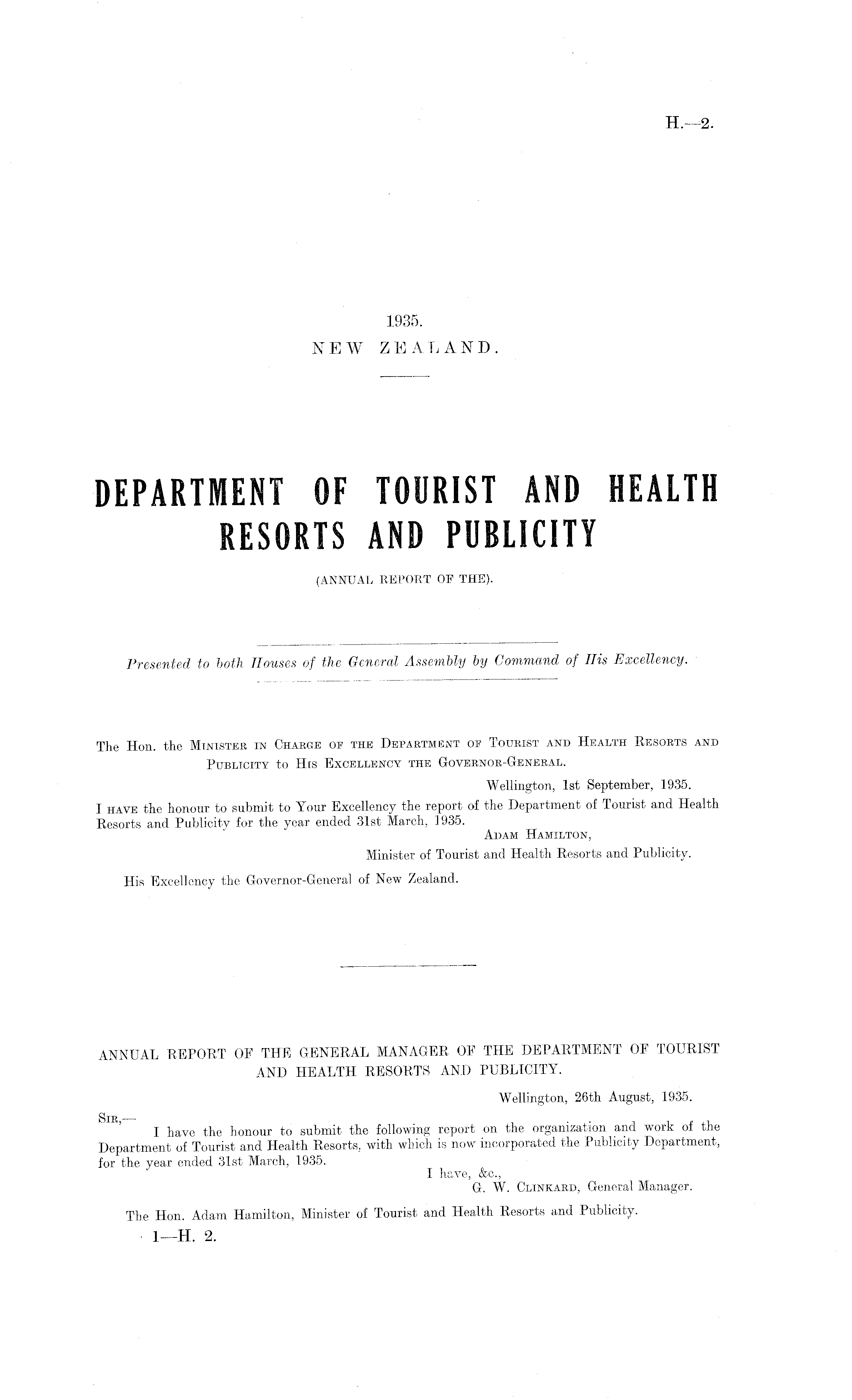 ANNUAL REPORT OF THE GENERAL MANAGER OF THE DEPARTMENT OF TOURIST AND HEALTH RESORTS AND PUBLICITY. Wellington, 26th August, 1935. I have the honour to submit the following report on the organization and work of the Department of Tourist and Health Resorts, with which is now incorporated the Publicity Department, for the year ended 31st March, 1935. I have, &c., G. W. Clinkard, General Manager. The Hon. Adam Hamilton, Minister of Tourist and Health Resorts and Publicity.