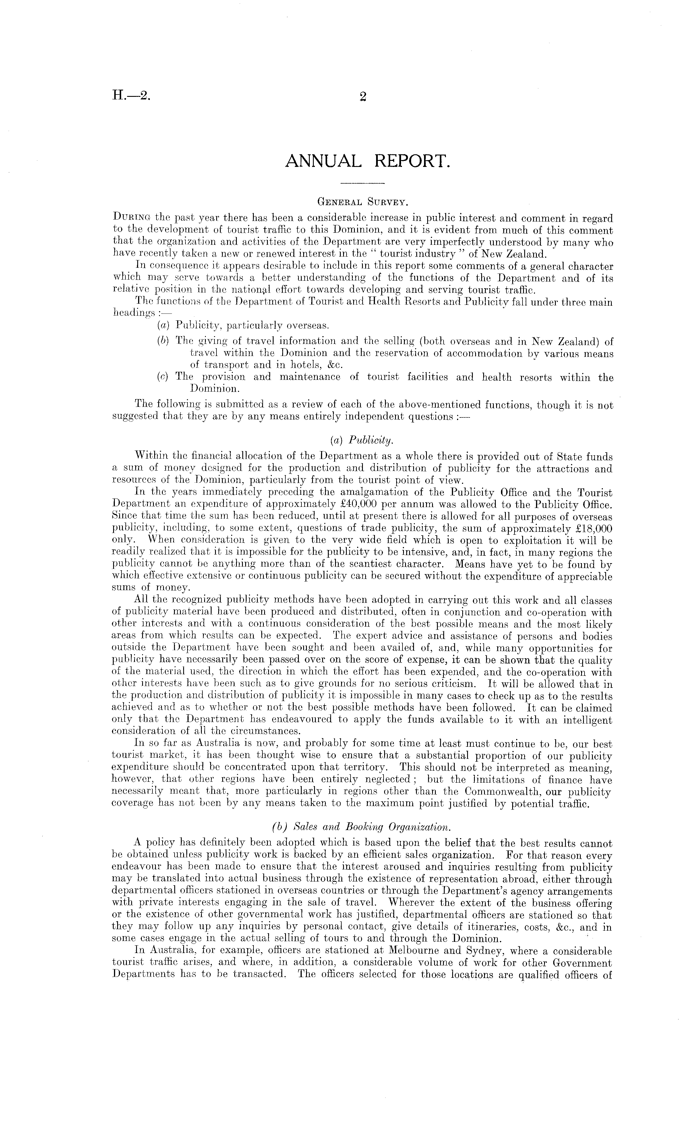 General Survey. During the past year there has been a considerable increase in public interest and comment in regard to the development of tourist traffic to this Dominion, and it is evident from much of this comment that the organization and activities of the Department are very imperfectly understood by many who have recently taken a new or renewed interest in the " tourist industry " of New Zealand. In consequence it appears desirable to include in this report some comments of a general character which may serve towards a better understanding of the functions of the Department and of its relative position in the national effort towards developing and serving tourist traffic. The functions of the Department of Tourist and Health Resorts and Publicity fall under three main headings :— (a) Publicity, particularly overseas. (b) The giving of travel information and the selling (both overseas and in New Zealand) of travel within the Dominion and the reservation of accommodation by various means of transport and in hotels, &c. (c) The provision and maintenance of tourist facilities and health resorts within the Dominion. The following is submitted as a review of each of the above-mentioned functions, though it is not suggested that they are by any means entirely independent questions : — (a) Publicity. Within the financial allocation of the Department as a whole there is provided out of State funds a sum of money designed for the production and distribution of publicity for the attractions and resources of the Dominion, particularly from the tourist point of view. In the years immediately preceding the amalgamation of the Publicity Office and the Tourist Department an expenditure of approximately £40,000 per annum was allowed to the Publicity Office. Since that time the sum has been reduced, until at present there is allowed for all purposes of overseas publicity, including, to some extent, questions of trade publicity, the sum of approximately £18,000 only. When consideration is given to the very wide field which is open to exploitation it will be readily realized that it is impossible for the publicity to be intensive, and, in fact, in many regions the publicity cannot be anything more than of the scantiest character. Means have yet to be found by which effective extensive or continuous publicity can be secured without the expenditure of appreciable sums of money. All the recognized publicity methods-have been adopted in carrying out this work and all classes of publicity material have been produced and distributed, often in conjunction and co-operation with other interests and with a continuous consideration of the best possible means and the most likely areas from which results can be expected. The expert advice and assistance of persons and bodies outside the Department have been sought and been availed of, and, while many opportunities for publicity have necessarily been passed over on the score of expense, it can be shown that the quality of the material used, the direction in which the effort has been expended, and the co-operation with other interests have been such as to give grounds for no serious criticism. It will be allowed that in the production and distribution of publicity it is impossible in many cases to check up as to the results achieved and as to whether or not the best possible methods have been followed. It can be claimed only that the Department has endeavoured to apply the funds available to it with an intelligent consideration of all the circumstances. In so far as Australia is now, and probably for some time at least must continue to be, our best tourist market, it has been thought wise to ensure that a substantial proportion of our publicity expenditure should be concentrated upon that territory. This should not be interpreted as meaning, however, that other regions haVe been entirely neglected; but the limitations of finance have necessarily meant that, more particularly in regions other than the Commonwealth, our publicity coverage has not been by any means taken to the maximum point justified by potential traffic. (b) Sales and Booking Organization. A policy has definitely been adopted which is based upon the belief that the best results cannot be obtained unless publicity work is backed by an efficient sales organization. For that reason every endeavour has been made to ensure that the interest aroused and inquiries resulting from publicity may be translated into actual business through the existence of representation abroad, either through departmental officers stationed in overseas countries or through the Department's agency arrangements with private interests engaging in the sale of travel. Wherever the extent of the business offering or the existence of other governmental work has justified, departmental officers are stationed so that they may follow up any inquiries by personal contact, give details of itineraries, costs, &c., and in some cases engage in the actual selling of tours to and through the Dominion. In Australia, for example, officers are stationed at Melbourne and Sydney, where a considerable tourist traffic arises, and where, in addition, a considerable volume of work for other Government Departments has to be transacted. The officers selected for those locations are qualified officers of