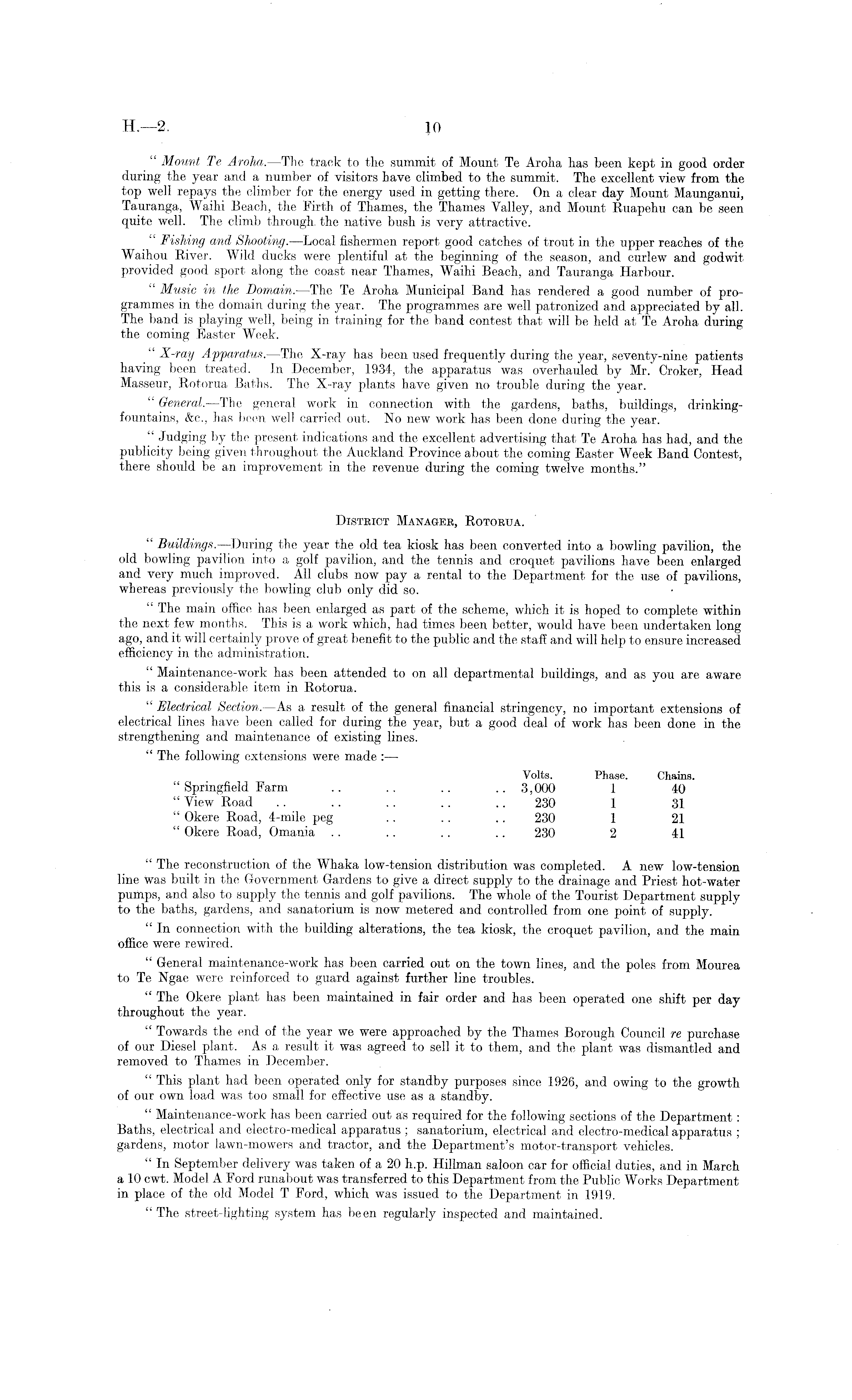 " Mount Te Aroha.—The track to the summit of Mount Te Aroha has been kept in good order during the year and a number of visitors have climbed to the summit. The excellent view from the top well repays the climber for the energy used in getting there. On a clear day Mount Maunganui, Tauranga, Waihi Beach, the Firth of Thames, the Thames Valley, and Mount Ruapehu can be seen quite well. The climb through, the native bush is very attractive. " Fishing and Shooting.—Local fishermen report good catches of trout in the upper reaches of the Waihou River. Wild ducks were plentiful at the beginning of the season, and curlew and godwit provided good sport along the coast near Thames, Waihi Beach, and Tauranga Harbour. " Music in the Domain.—The Te Aroha Municipal Band has rendered a good number of programmes in the domain during the year. The programmes are well patronized and appreciated by all. The band is playing well, being in training for the band contest that will be held at Te Aroha during the coming Easter Week. " X-ray Apparatus.—The X-ray has been used frequently during the year, seventy-nine patients having been treated. In December, 1934, the apparatus was overhauled by Mr. Croker, Head Masseur, Rotorua Baths. The X-ray plants have given no trouble during the year. " General. —The general work in connection with the gardens, baths, buildings, drinkingfountains, &c., has been well carried out. No new work has been done during the year. " Judging by the present indications and the excellent advertising that Te Aroha has had, and the publicity being given throughout the Auckland Province about the coming Easter Week Band Contest, there should be an improvement in the revenue during the coming twelve months." District Manager, Rotorua. " Buildings.—During the year the old tea kiosk has been converted into a bowling pavilion, the old bowling pavilion into a golf pavilion, and the tennis and croquet pavilions have been enlarged and very much improved. All clubs now pay a rental to the Department for the use of pavilions, whereas previously the bowling club only did so. " The main office has been enlarged as part of the scheme, which it is hoped to complete within the next few months. This is a work which, had times been better, would have been undertaken long ago, and it will certainly prove of great benefit to the public and the staff and will help to ensure increased efficiency in the administration. " Maintenance-work has been attended to on all departmental buildings, and as you are aware this is a considerable item in Rotorua. " Electrical Section.-—As a result of the general financial stringency, no important extensions of electrical lines have been called for during the year, but a good deal of work has been done in the strengthening and maintenance of existing lines. " The following extensions were made :— Volts. Phase. Chains. " Springfield Farm .. .. .. .. 3,000 1 40 " View Road .. .. . . .. .. 230 1 31 " Okere Road, 4-mile peg .. .. .. 230 1 21 " Okere Road, Omania . . .. . . .. 230 2 41 " The reconstruction of the Whaka low-tension distribution was completed. A new low-tension line Was built in the Government Gardens to give a direct supply to the drainage and Priest hot-water pumps, and also to supply the tennis and golf pavilions. The whole of the Tourist Department supply to the baths, gardens, and sanatorium is now metered and controlled from one point of supply. " In connection with the building alterations, the tea kiosk, the croquet pavilion, and the main office were rewired. " General maintenance-work has been carried out on the town lines, and the poles from Mourea to Te Ngae were reinforced to guard against further line troubles. " The Okere plant has been maintained in fair order and has been operated one shift per day throughout the year. " Towards the end of the year we were approached by the Thames Borough Council re purchase of our Diesel plant. As a result it was agreed to sell it to them, and the plant was dismantled and removed to Thames in December. " This plant had been operated only for standby purposes since 1926, and owing to the growth of our own load was too small for effective use as a standby. " Maintenance-work has been carried out als required for the following sections of the Department : Baths, electrical and electro-medical apparatus ; sanatorium, electrical and electro-medical apparatus ; gardens, motor lawn-mowers and tractor, and the Department's motor-transport vehicles. " In September delivery was taken of a 20 h.p. Hillman saloon car for official duties, and in March a 10 cwt. Model A Ford runabout was transferred to this Department from the Public Works Department in place of the old Model T Ford, which was issued to the Department in 1919. " The street-lighting system has been regularly inspected and maintained.