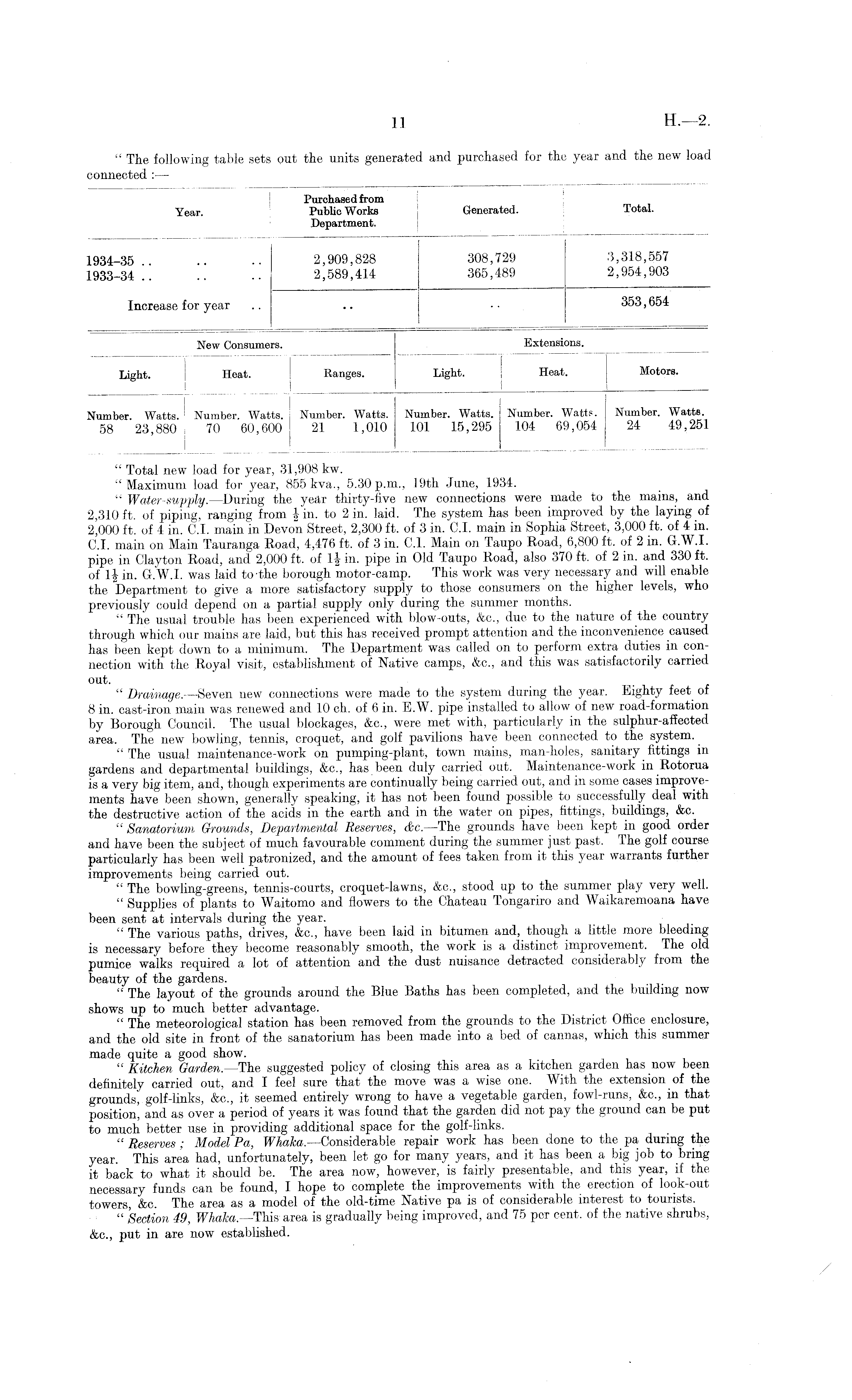 " Total new load for year, 31,908 kw. "Maximum load for year, 855 kva., 5.30 p.m., ]9th June, 1934. " Water-supply. —During the year thirty-five new connections were made to the mains, and 2,310 ft. of piping, ranging from \ in. to 2 in. laid. The system has been improved by the laying of 2,000 ft. of -1 in. C.I. main in Devon Street, 2,300 ft. of 3 in. C.I. main in Sophia Street, 3,000 ft. of 4 in. C.I. main on Main Tauranga Road, 4,476 ft. of 3 in. C.I. Main on Taupo Road, 6,800 ft. of 2 in. G.W.I, pipe in Clayton Road, and 2,000 ft. of 1-| in. pipe in Old Taupo Road, also 370 ft. of 2 in. and 330 ft. of l\ in. G.W.I, was laid to-the borough motor-camp. This work was very necessary and will enable the Department to give a more satisfactory supply to those consumers on the higher levels, who previously could depend on a partial supply only during the summer months. " The usual trouble has been experienced with blow-outs, &c., due to the nature of the country through which our mains are laid, but this has received prompt attention and the inconvenience caused has been kept down to a minimum. The Department was called on to perform extra duties in connection with the Royal visit, establishment of Native camps, &c., and this was satisfactorily carried out. " Drainage.—Seven new connections were made to the system during the year. Eighty feet of 8 in. cast-iron main was renewed and 10 ch. of 6 in. E.W. pipe installed to allow of new road-formation by Borough Council. The usual blockages, &c., were met with, particularly in the sulphur-affected area. The new bowling, tennis, croquet, and golf pavilions have been connected to the system. " The usual maintenance-work on pumping-plant, town mains, man-holes, sanitary fittings in gardens and departmental buildings, &c., has been duly carried out. Maintenance-work in Rotorua is a very big item, and, though experiments are continually being carried out, and in some cases improvements have been shown, generally speaking, it has not been found possible to successfully deal with the destructive action of the acids in the earth and in the water on pipes, fittings, buildings, &c. " Sanatorium Grounds, Departmental Reserves, &c. —The grounds have been kept in good order and have been the subject of much favourable comment during the summer just past. The golf course particularly has been well patronized, and the amount of fees taken from it this year warrants further improvements being carried out. " The bowling-greens, tennis-courts, croquet-lawns, &c., stood up to the summer play very well. " Supplies of plants to Waitomo and flowers to the Chateau Tongariro and Waikaremoana have been sent at intervals during the year. " The various paths, drives, &c., have been laid in bitumen and, though a little more bleeding is necessary before they become reasonably smooth, the work is a distinct improvement. The old pumice walks required a lot of attention and the dust nuisance detracted considerably from the beauty of the gardens. " The layout of the grounds around the Blue Baths has been completed, and the building now shows up to much better advantage. " The meteorological station has been removed from the grounds to the District Office enclosure, and the old site in front of the sanatorium has been made into a bed of cannas, which this summer made quite a good show. " Kitchen Garden. —The suggested policy of closing this area as a kitchen garden has now been definitely carried out, and I feel sure that the move was a wise one. With the extension of the grounds, golf-links, &c., it seemed entirely wrong to have a vegetable garden, fowl-runs, &c., in that position, and as over a period of years it was found that the garden did not pay the ground can be put to much better use in providing additional space for the golf-links. " Reserves; Model Pa, Whaha.—Considerable repair work has been done to the pa during the year. This area had, unfortunately, been let go for many years, and it has been a big job to bring it back to what it should be. The area now, however, is fairly presentable, and this year, if the necessary funds can be found, I hope to complete the improvements with the erection of look-out towers, &c. The area as a model of the old-time Native pa is of considerable interest to tourists. " Section 49, Whaka.—Tm area is gradually being improved, and 75 per cent, of the native shrubs, &e., put in are now established.
