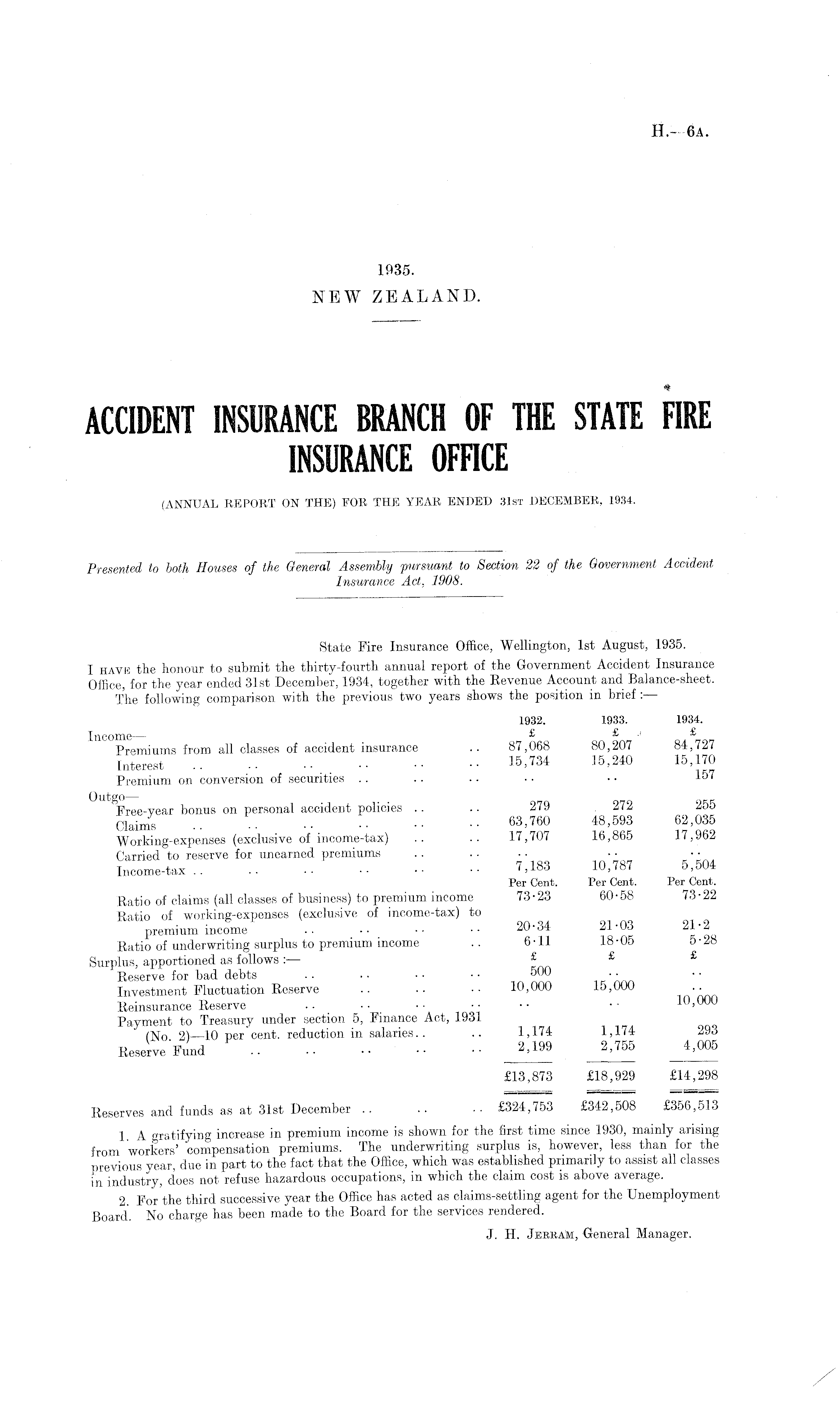 State Fire Insurance Office, Wellington, Ist August, 1935. I have the honour to submit the thirty-fourth annual report of the Government Accident Insurance Office, for the year ended 31st December, 1934, together with the Revenue Account and Balance-sheet. The following comparison with the previous two years shows the position in brief 1932. 1933. 1934. Income — £ 1 £ Premiums from all classes of accident insurance .. 87,068 80,207 84,727 Interest '5-™ 1B > 240 15 >"2 Premium on conversion of securities .. .. .. • • • • 15' bonus on personal accident policies .. .. 279 272 255 Clain f g .. 63,760 48,593 62,035 Working-expenses (exclusive of income-tax) .. .. 17,707 16,865 17,962 Carried to reserve for unearned premiums Income-tax .. .. •• •• •• •• 7,183 10,787 5,504 Per Cent. Per Cent. Per Cent. Ratio of claims (all classes of business) to premium income 73-23 60-58 73-22 Ratio of working-expenses (exclusive of income-tax) to premium income •• •• •• 20-34 21-03 21 -2 Ratio of underwriting surplus to premium income .. 6-11 18-05 5-28 Surplus, apportioned as follows — £ £ £ Reserve for bad debts .. . • ■ • - - 500 Investment Fluctuation Reserve .. •• 10,000 15,000 In ' mn Reinsurance Reserve .. • ■ • • • • • • • ■ 10,000 Payment to Treasury under section 5, Finance Act, 1931 (No 2) —10 per'cent, reduction in salaries.. .. 1,174 1,174 293 Reserve Fund JU99 JUM 4,005 £13,873 £18,929 £14,298 Reserves and funds as at 31st December .. .. £324,753 £342,508 £356,513 1 A gratifying increase in premium income is shown for the first time since 1930, mainly arising from workers' compensation premiums. The underwriting surplus is, however, less than for the previous year, due in part to the fact that the Office, which was established primarily to assist all classes in industry, does not refuse hazardous occupations, in which the claim cost is above average. 2. For the third successive year the Office has acted as claims-settling agent for the Unemployment Board. No charge has been made to the Board for the services rendered. J. H. Jerram, General Manager.