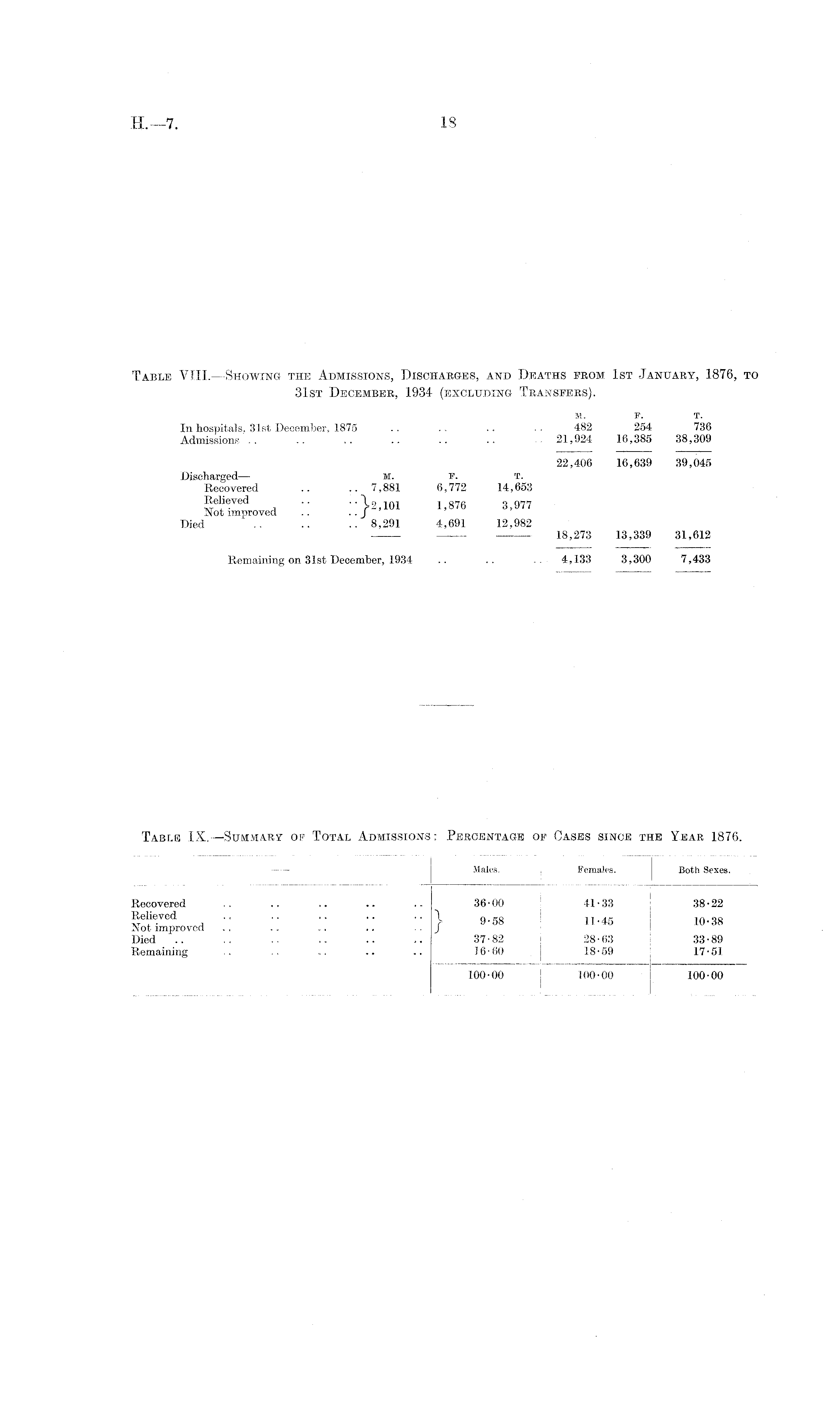 Table Vlll.—Showing the Admissions, Discharges, and Deaths from Ist January, 1876, to 31st December, 1934 (excluding Transfers). M. F. T. In hospitals, 31st December, 1875 .. .. .. • - 482 254 736 Admissions .. .. .. .. .. .. 21,924 16,385 38,309 22,406 16,639 39,045 Discharged — m. f. t. Recovered .. .. 7,881 6,772 14,653 Relieved .. ..\ 2 10 1 1,876 3,977 Not improved .. • • J Died .. .. .. 8,291 4,691 12,982 — 18,273 13,339 31,612 Remaining on 31st December, 1934 .. .. .. 4,133 3,300 7,433