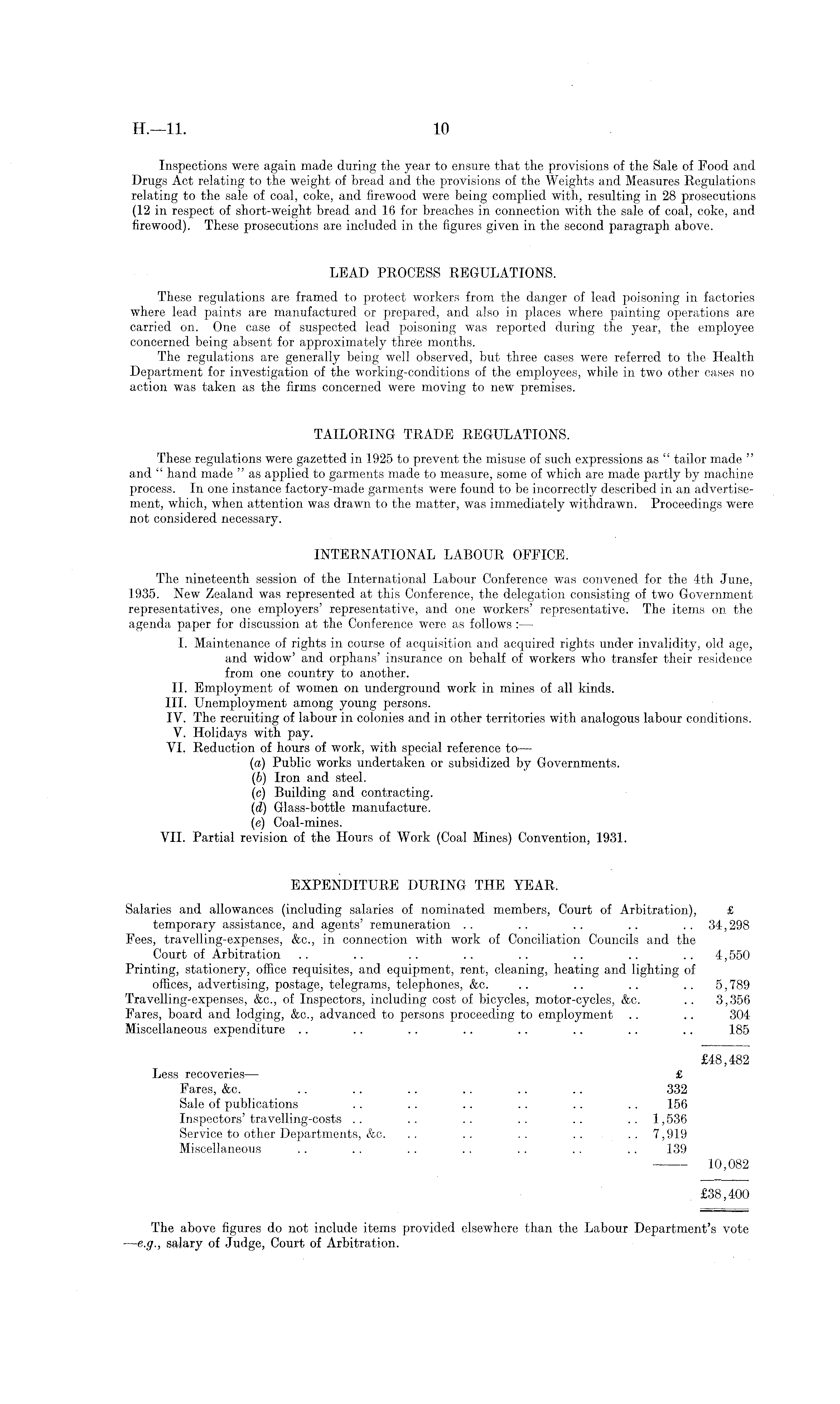 Inspections were again made during the year to ensure that the provisions of the Sale of Food and Drugs Act relating to the weight of bread and the provisions of the Weights and Measures Regulations relating to the sale of coal, coke, and firewood were being complied with, resulting in 28 prosecutions (12 in respect of short-weight bread and 16 for breaches in connection with the sale of coal, coke, and firewood). These prosecutions are included in the figures given in the second paragraph above. LEAD PROCESS REGULATIONS. These regulations are framed to protect workers from the danger of lead poisoning in factories where lead paints are manufactured or prepared, and also in places where painting operations are carried on. One case of suspected lead poisoning was reported during the year, the employee concerned being absent for approximately three months. The regulations are generally being well observed, but three cases were referred to the Health Department for investigation of the working-conditions of the employees, while in two other cases no action was taken as the firms concerned were moving to new premises. TAILORING TRADE REGULATIONS. These regulations were gazetted in 1925 to prevent the misuse of such expressions as " tailor made " and " hand made " as applied to garments made to measure, some of which are made partly by machine process. In one instance factory-made garments were found to be incorrectly described in an advertisement, which, when attention was drawn to the matter, was immediately withdrawn. Proceedings were not considered necessary. INTERNATIONAL LABOUR OFFICE. The nineteenth session of the International Labour Conference was convened for the 4th June, 1935. New Zealand was represented at this Conference, the delegation consisting of two Government representatives, one employers' representative, and one workers' representative. The items on the agenda paper for discussion at the Conference were as follows : — I. Maintenance of rights in course of acquisition and acquired rights under invalidity, old age, and widow' and orphans' insurance on behalf of workers who transfer their residence from one country to another. 11. Employment of women on underground work in mines of all kinds. 111. Unemployment among young persons. IV. The recruiting of labour in colonies and in other territories with analogous labour conditions. V. Holidays with pay. VI. Reduction of hours of work, with special reference to — (a) Public works undertaken or subsidized by Governments. (b) Iron and steel. (c) Building and contracting. (d) Glass-bottle manufacture. (e) Coal-mines. VII. Partial revision of the Hours of Work (Coal Mines) Convention, 1931. EXPENDITURE DURING THE YEAR. Salaries and allowances (including salaries of nominated members, Court of Arbitration), £ temporary assistance, and agents' remuneration .. .. .. .. .. 34,298 Fees, travelling-expenses, &c., in connection with work of Conciliation Councils and the Court of Arbitration .. .. .. .. .. .. .. 4,550 Printing, stationery, office requisites, and equipment, rent, cleaning, heating and lighting of offices, advertising, postage, telegrams, telephones, &c. .. .. .. .. 5,789 Travelling-expenses, &c., of Inspectors, including cost of bicycles, motor-cycles, &c. .. 3,356 Fares, board and lodging, &c., advanced to persons proceeding to employment .. .. 304 Miscellaneous expenditure .. .. .. .. .. .. .. .. 185 £48,482 Less recoveries— £ Fares, &c. .. .. .. .. .. .. 332 Sale of publications .. .. .. .. .. .. 156 Inspectors' travelling-costs .. . . . . . . .. 1,536 Service to other Departments, &c. .. .. .. .. .. 7,919 Miscellaneous .. .. .. . . .. .. .. 139 10,082 £38,400 The above figures do not include items provided elsewhere than the Labour Department's vote ■—e.g., salary of Judge, Court of Arbitration.