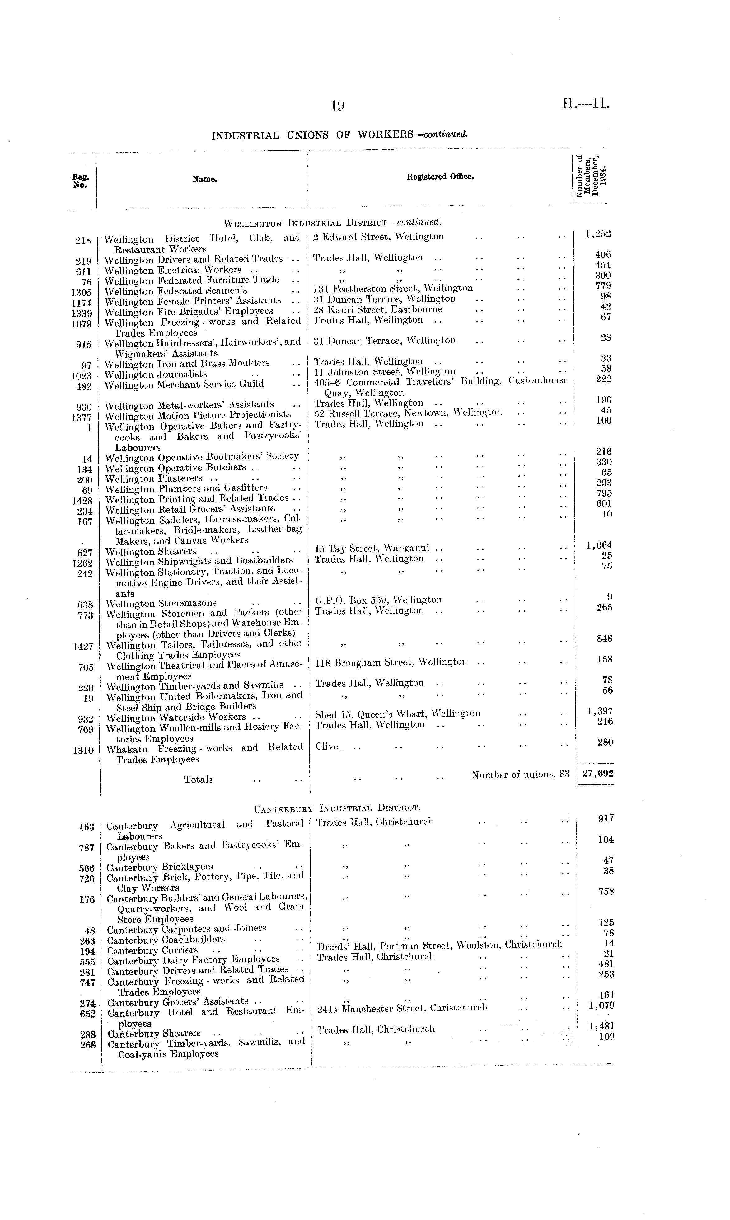 Z ft? (H Keg. Name. Kegistered Office. Ill® No. S a) «t-( A M Wellington Industrial District —continued. 218 Wellington District Hotel, Club, and 2 Edward Street, Wellington .. •• 1,252 Restaurant Workers , , 219 Wellington Drivers and Related Trades .. Trades Hall, Wellington .. .. • • ■ ■ 611 Wellington Electrical Workers .. .. ,, „ •• •• _ 76 Wellington Federated Furniture Trade .. „ „ ■ ■ ■■ ■ ■ ■■ 1305 Wellington Federated Seamen's .. 131 Featherston Street, Wellington .. '<» 1174 Wellington Female Printers' Assistants .. 31 Duncan Terrace, Wellington .. .. • ■ 1339 Wellington Fire Brigades' Employees . • 28 Kauri Street, Eastbourne .. ■ • ■ • 1079 Wellington Freezing - works and Related Trades Hall, Wellington .. .. •• 01 Trades Employees M , 9S 915 Wellington Hairdressers', Hairworkers', and 31 Duncan Terrace, Wellington Wigmakers' Assistants „„ 97 Wellington Iron and Brass Moulders .. Irades Hall, Wellington .. .. • • • • 1023 Wellington Journalists •• •• 11 Johnston Street, Wellington .. .. •• 482 Wellington Merchant Service Guild .. 405-6 Commercial Travellers Building, Customhouse 222 Quay, Wellington 930 Wellington Metal-workers'Assistants .. Trades Hall, Wellington .. ■■ •• •• 1377 Wellington Motion Picture Projectionists 52 Russell Terrace, Newtown, Wellington 40 1 Wellington Operative Bakers and Pastry- Trades Hall, Wellington cooks and Bakers and Pastrycooks Labourers «1« 14 Wellington Operative Bootmakers'Society ,, „ •• •• •• 134 Wellington Operative Butchers .. .. ,, » •• " " " 65 200 Wellington Plasterers .. •• •• >, >> •• •• " " 293 69 Wellington Plumbers and Gasfltters .. ,, ,, •• •• " 1428 Wellington Printing and Related Trades .. ,, ,, •• •• 1 234 Wellington Retail Grocers'Assistants .. ,, ,, ■■ ■■ •• •' 167 Wellington Saddlers, Harness-makers, Col lar-makers, Bridle-makers, Leather-bag Makers, and Canvas Workers . . 627 Wellington Shearers .. • • • • 15 lay ® tr ® et .',JY?' ns f nui " " " " '95 1262 Wellington Shipwrights and Boatbuilders Trades Hall, Wellington .. • • • ■ • • r 242 Wellington Stationary, Traction, and Loco- ,, ,, motive Engine Drivers, and their Assistd/ixfcs G 638 Wellington Stonemasons .. •• G.P.O. Box 559, Wellington .. •• 773 Wellington Storemen and Packers (other Trades Hall, W ellington than in Retail Shops) and Warehouse Employees (other than Drivers and Clerks) _ 4g 1427 Wellington Tailors, Tailoresses, and other Clothing Trades Employees im 705 Wellington Theatrical and Places of Amuse- 118 Brougham Street, Wellington .. . . •• *»» ment Employees 7S 220 Wellington Timber-yards and Sawmills . ■ Trades Hall, W ellington .. • ■ ■ - • ■ 19 Wellington United Boilermakers, Iron and ,, ,, Steel Ship and Bridge Builders , . „„„ 932 Wellington Waterside Workers .. .. Shed 15 Queen s Wharf, Wellington .. •• 769 Wellington Woollen-mills and Hosiery Fac- Trades Hall, Wellington tories Employees 980 1310 Whakatu Freezing - works and Related Olive Trades Employees Totals ■ •• •' Number of unions, 83 27,692 Canterbury Industrial District. 463 I Canterbury Agricultural and Pastoral Trades Hall, Christchurch . . • • • • 91 j Labourers 787 j Canterbury Bakers and Pastrycooks' Em- ,, ployees 47 566 i Canterbury Bricklayers .. ■■ " " " 38 726 i Canterbury Brick, Pottery, Pipe, Tile, anil Clay Workers 7 gg 176 i Canterbury Builders'and General Labourers, Quarry-workers, and Wool and Grain Store Employees 12 g 48 Canterbury Carpenters and Joiners - ■ „ »> • • '' " 7 ' g 58 SttSSSKT :: :: » 555 I Canterbury Dairy Factory Employees .. Irades Hall, Christchuich .. ■ ■ ■ • 281 Canterbury Drivers and Related Trades . . ,, ». , • • • ■ '' 747 Canterbury Freezing - works and Related ,, Trades Employees 164 HI SSSglSwitflBU- 241a Manchester Street, Christchurch !! " i.<«> 288 Canterbury Shearers .. • • - Trades Hall, Christchurch .. -■ 268 Canterbury Timber-yards, Sawmills, and ,, ,, •• " Coal-yards Employees