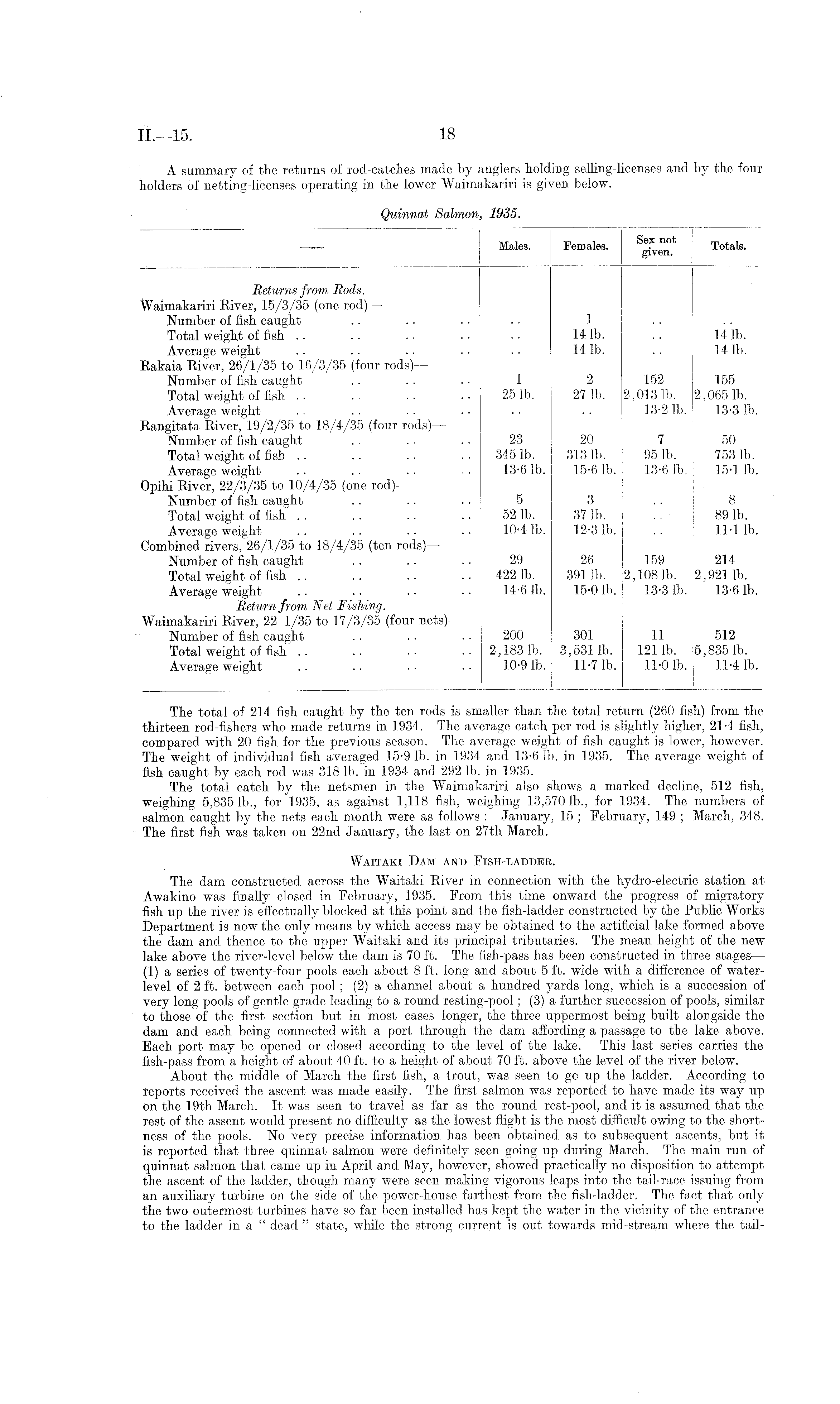The total of 214 fish caught by the ten rods is smaller than the total return (260 fish) from the thirteen rod-fishers who made returns in 1934. The average catch per rod is slightly higher, 21-4 fish, compared with 20 fish for the previous season. The average weight of fish caught is lower, however. The weight of individual fish averaged 15-9 lb. in 1934 and 13-6 lb. in 1935. The average weight of fish caught by each rod was 318 lb. in 1934 and 292 lb. in 1935. The total catch by the netsmen in the Waimakariri also shows a marked decline, 512 fish, weighing 5,835 lb., for 1935, as against 1,118 fish, weighing 13,570 lb., for 1934. The numbers of salmon caught by the nets each month were as follows : January, 15 ; February, 149 ; March, 348. The first fish was taken on 22nd January, the last on 27th March. Waitaki Dam and Fish-ladder. The dam constructed across the Waitaki Eiver in connection with the hydro-electric station at Awakino was finally closed in February, 1935. From this time onward the progress of migratory fish up the river is effectually blocked at this point and the fish-ladder constructed by the Public Works Department is now the only means by which access may be obtained to the artificial lake formed above the dam and thence to the upper Waitaki and its principal tributaries. The mean height of the new lake above the river-level below the dam is 70 ft. The fish-pass has been constructed in three stages— (1) a series of twenty-four pools each about 8 ft. long and about 5 ft. wide with a difference of waterievel of 2 ft. between each pool; (2) a channel about a hundred yards long, which is a succession of very long pools of gentle grade leading to a round resting-pool; (3) a further succession of pools, similar to those of the first section but in most cases longer, the three uppermost being built alongside the dam and each being connected with a port through the dam affording a passage to the lake above. Each port may be opened or closed according to the level of the lake. This last series carries the fish-pass from a height of about 40 ft. to a height of about 70 ft. above the level of the river below. About the middle of March the first fish, a trout, was seen to go up the ladder. According to reports received the ascent was made easily. The first salmon was reported to have made its way up on the 19th March. It was seen to travel as far as the round rest-pool, and it is assumed that the rest of the assent would present no difficulty as the lowest flight is the most difficult owing to the shortness of the pools. No very precise information has been obtained as to subsequent ascents, but it is reported that three quinnat salmon were definitely seen going up during March. The main run of quinnat salmon that came up in April and May, however, showed practically no disposition to attempt the ascent of the ladder, though many were seen making vigorous leaps into the tail-race issuing from an auxiliary turbine on the side of the power-house farthest from the fish-ladder. The fact that only the two outermost turbines have so far been installed has kept the water in the vicinity of the entrance to the ladder in a " dead " state, while the strong current is out towards mid-strea,m where the tail-