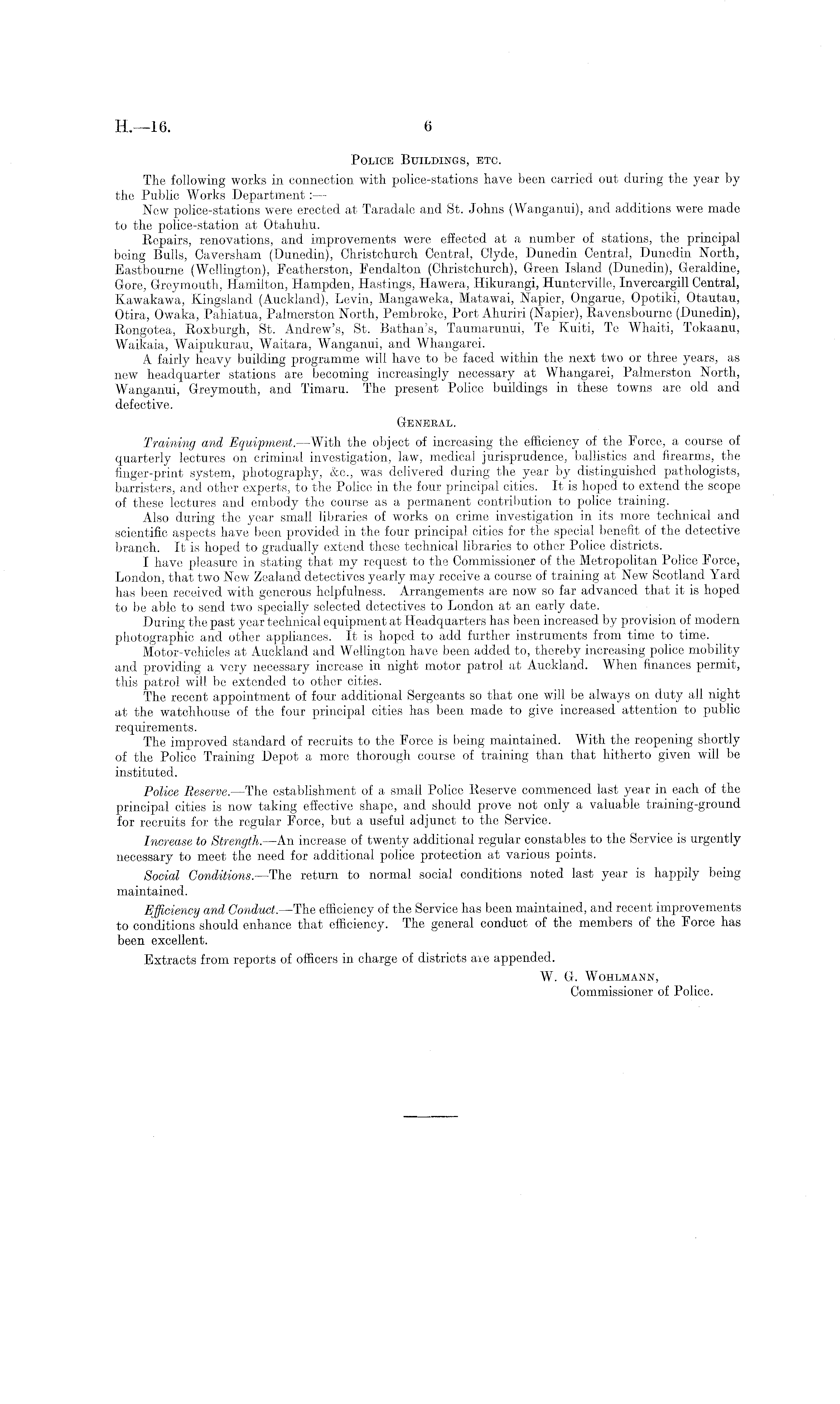 Police Buildings, etc. The following works in connection with police-stations have been carried out during the year by the Public Works Department: — New police-stations were erected at Taradale and St. Johns (Wanganui), and additions were made to the police-station at Otahuhu. Repairs, renovations, and improvements were effected at a number of stations, the principal being Bulls, Caversham (Dunedin), Christchurch Central, Clyde, Dunedin Central, Dunedin North, Eastbourne (Wellington), Featherston, Fendalton (Christchurch), Green Island (Dunedin), Geraldine, Gore, Greymouth, Hamilton, Hampden, Hastings, Hawera, Hikurangi, Hunterville, Invercargill Central, Kawakawa, Kingsland (Auckland), Levin, Mangaweka, Matawai, Napier, Ongarue, Opotiki, Otautau, Otira, Owaka, Pahiatua, Palmerston North, Pembroke, Port Ahuriri (Napier), Eavensbourne (Dunedin), Rongotea, Roxburgh, St. Andrew's, St. Bathan's, Taumarunui, Te Kuiti, Te Whaiti, Tokaami, Waikaia, Waipukurau, Waitara, Wanganui, and Whangarei. A fairly heavy building programme will have to be faced within the next two or three years, as new headquarter stations are becoming increasingly necessary at Whangarei, Palmerston North, Wanganui, Greymouth, and Timaru. The present Police buildings in these towns are old and defective. Geneeal. Training and Equipment. —With the object of increasing the efficiency of the Force, a course of quarterly lectures on criminal investigation, law, medical jurisprudence, ballistics and firearms, the finger-print system, photography, &c, was delivered during the year by distinguished pathologists, barristers, and other experts, to the Police in the four principal cities. It is hoped to extend the scope of these lectures and embody the course as a permanent contribution to police training. Also during the year small libraries of works on crime investigation in its more technical and scientific aspects have been provided in the four principal cities for the special benefit of the detective branch. It is hoped to gradually extend these technical libraries to other Police districts. I have pleasure in stating that my request to the Commissioner of the Metropolitan Police Force, London, that two New Zealand detectives yearly may receive a course of training at New Scotland Yard has been received with generous helpfulness. Arrangements are now so far advanced that it is hoped to be able to send two specially selected detectives to London at an early date. During the past year technical equipment at Headquarters has been increased by provision of modern photographic and other appliances. It is hoped to add further instruments from time to time. Motor-vehicles at Auckland and Wellington have been added to, thereby increasing police mobility and providing a very necessary increase in night motor patrol at Auckland. When finances permit, this patrol will be extended to other cities. The recent appointment of four additional Sergeants so that one will be always on duty all night at the watchhouse of the four principal cities has been made to give increased attention to public requirements. The improved standard of recruits to the Force is being maintained. With the reopening shortly of the Police Training Depot a more thorough course of training than that hitherto given will be instituted. Police Reserve. —The establishment of a small Police Reserve commenced last year in each of the principal cities is now taking effective shape, and should prove not only a valuable training-ground for recruits for the regular Force, but a useful adjunct to the Service. Increase to Strength. —An increase of twenty additional regular constables to the Service is urgently necessary to meet the need for additional police protection at various points. Social Conditions. —The return to normal social conditions noted last year is happily being maintained. Efficiency and Conduct. —The efficiency of the Service has been maintained, and recent improvements to conditions should enhance that efficiency. The general conduct of the members of the Force has been excellent. Extracts from reports of officers in charge of districts are appended. W. G. Wohlmann, Commissioner of Police.