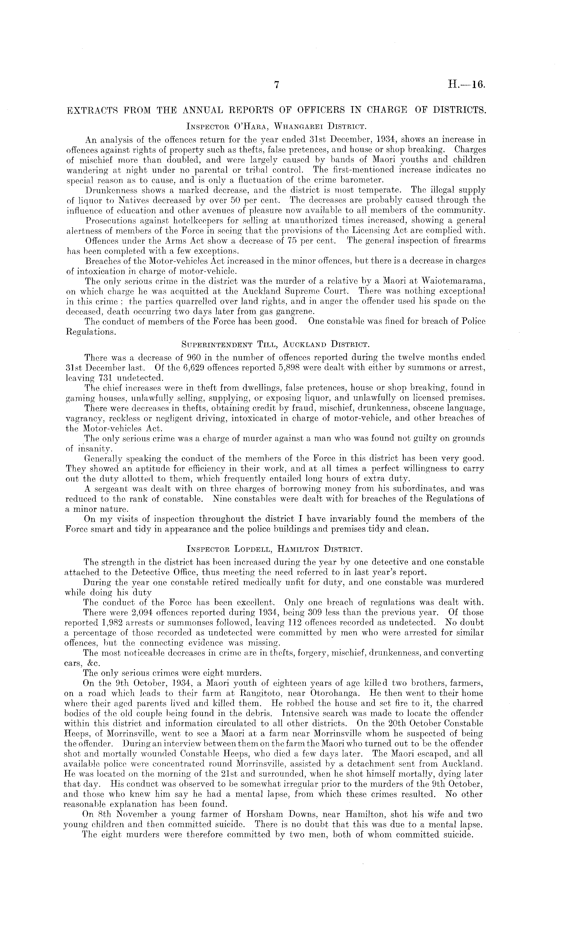 EXTRACTS FROM THE ANNUAL REPORTS OF OFFICERS IN CHARGE OF DISTRICTS. Inspector O'Haea, Whangarei District. An analysis of the offences return for the year ended 31st December, 1934, shows an increase in offences against rights of property such as thefts, false pretences, and house or shop breaking. Charges of mischief more than doubled, and were largely caused by bands of Maori youths and children wandering at night under no parental or tribal control. The first-mentioned increase indicates no special reason as to cause, and is only a fluctuation of the crime barometer. Drunkenness shows a marked decrease, and the district is most temperate. The illegal supply of liquor to Natives decreased by over 50 per cent. The decreases are probably caused through the influence of education and other avenues of pleasure now available to all members of the community. Prosecutions against hotelkeepers for selling at unauthorized times increased, showing a general alertness of members of the Force in seeing that the provisions of the Licensing Act are complied with. Offences under the Arms Act show a decrease of 75 per cent. The general inspection of firearms has been completed with a few exceptions. Breaches of the Motor-vehicles Act increased in the minor offences, but there is a decrease in charges of intoxication in charge of motor-vehicle. The only serious crime in the. district was the murder of a relative by a Maori at Waiotemarama, on which charge he was acquitted at the Auckland Supreme Court. There was nothing exceptional in this crime ; the parties quarrelled over land rights, and in anger the offender used his spade on the deceased, death occurring two days later from gas gangrene. The conduct of members of the Force has been good. One constable was fined for breach of Police Regulations. Superintendent Till, Auckland District. There was a decrease of 960 in the number of offences reported during the twelve months ended 31st December last. Of the 6,629 offences reported 5,898 were dealt with either by summons or arrest, leaving 731 undetected. The chief increases were in theft from dwellings, false pretences, house or shop breaking, found in gaming houses, unlawfully selling, supplying, or exposing liquor, and unlawfully on licensed premises. There were decreases in thefts, obtaining credit by fraud, mischief, drunkenness, obscene language, vagrancy, reckless or negligent driving, intoxicated in charge of motor-vehicle, and other breaches of the Motor-vehicles Act. The only serious crime was a charge of murder against a man who was found not guilty on grounds of insanity. Generally speaking the conduct of the members of the Force in this district has been very good. They showed an aptitude for efficiency in their work, and at all times a perfect willingness to carry out the duty allotted to them, which frequently entailed long hours of extra duty. A sergeant was dealt with on three charges of borrowing money from his subordinates, and was reduced to the rank of constable. Nine constables were dealt with for breaches of the Regulations of a minor nature. On my visits of inspection throughout the district I have invariably found the members of the Force smart and tidy in appearance and the police buildings and premises tidy and clean. Inspector Lopdell, Hamilton District. The strength in the district has been increased during the year by one detective and one constable attached to the Detective Office, thus meeting the need referred to in last year's report. During the year one constable retired medically unfit for duty, and one constable was murdered while doing his duty The conduct of the Force has been excellent. Only one breach of regulations was dealt with. There were 2,094 offences reported during 1934, being 309 less than the previous year. Of those reported 1,982 arrests or summonses followed, leaving 112 offences recorded as undetected. No doubt a percentage of those recorded as undetected were committed by men who were arrested for similar offences, but the connecting evidence was missing. The most noticeable decreases in crime are in thefts, forgery, mischief, drunkenness, and converting cars, &c. The only serious crimes were eight murders. On the 9th October, 1934, a Maori youth of eighteen years of age killed two brothers, farmers, on a road which leads to their farm at Rangitoto, near Otorohanga. He then went to their home where their aged parents lived and killed them. He robbed the house and set fire to it, the charred bodies of the old couple being found in the debris. Intensive search was made to locate the offender within this district and information circulated to all other districts. On the 20th October Constable Heeps, of Morrinsville, went to see a Maori at a farm near Morrinsville whom he suspected of being the offender. During an interview between them on the farm the Maori who turned out to be the offender shot and mortally wounded Constable Heeps, who died a few days later. The Maori escaped, and all available police were concentrated round Morrinsville, assisted by a detachment sent from Auckland. He was located on the morning of the 21st and surrounded, when he shot himself mortally, dying later that day. His conduct was observed to be somewhat irregular prior to the murders of the 9th October, and those who knew him say he had a mental lapse, from which these crimes resulted. No other reasonable explanation has been found. On Bth November a young farmer of Horsham Downs, near Hamilton, shot his wife and two young children and then committed suicide. There is no doubt that this was due to a mental lapse. The eight murders were therefore committed by two men, both of whom committed suicide.