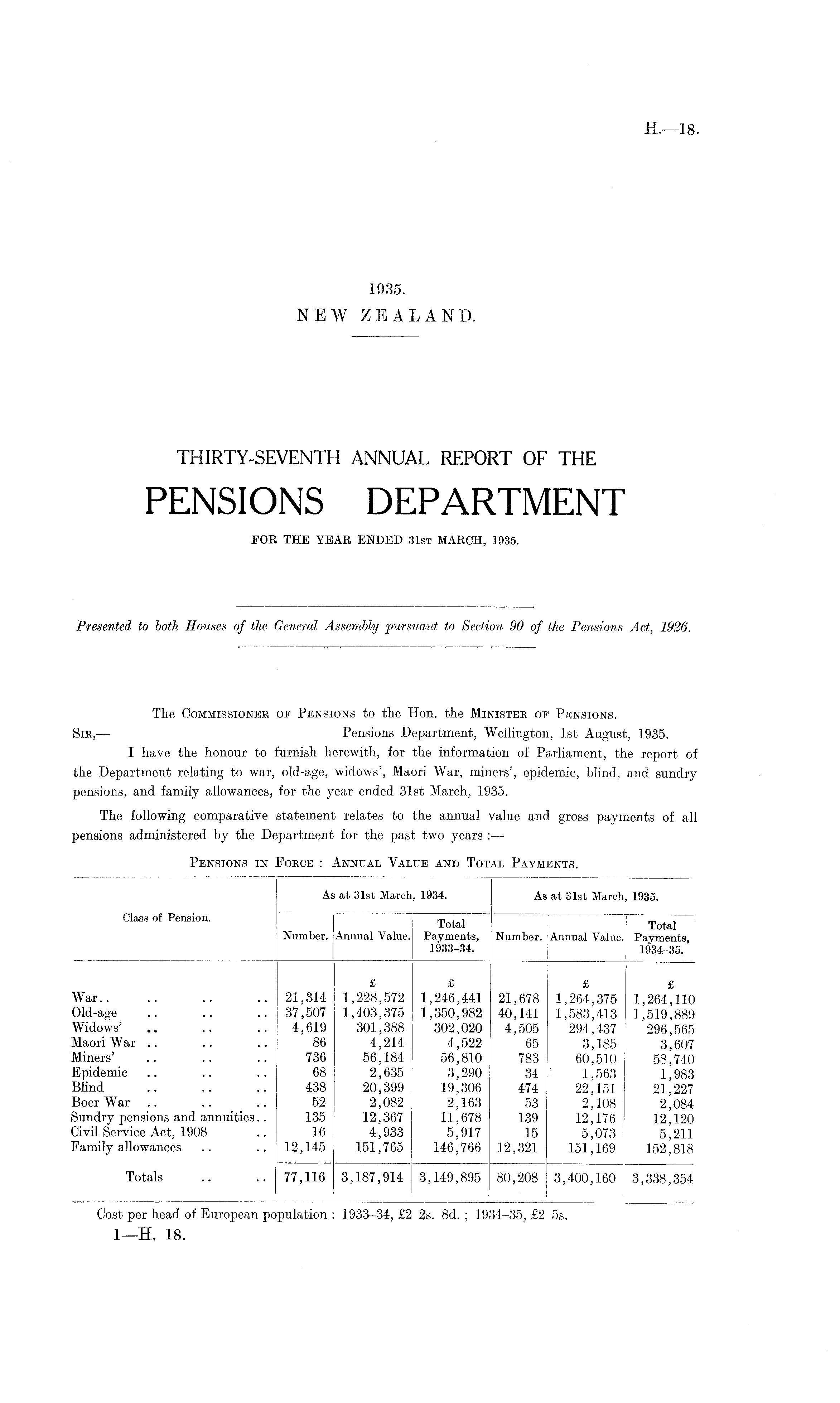 The Commissioner op Pensions to the Hon. the Minister of Pensions. Sir, — Pensions Department, Wellington, Ist August, 1935. I have the honour to furnish herewith, for the information of Parliament, the report of the Department relating to war, old-age, widows', Maori War, miners', epidemic, blind, and sundrypensions, and family allowances, for the year ended 31st March, 1935. The following comparative statement relates to the annual value and gross payments of all pensions administered by the Department for the past two years : —-