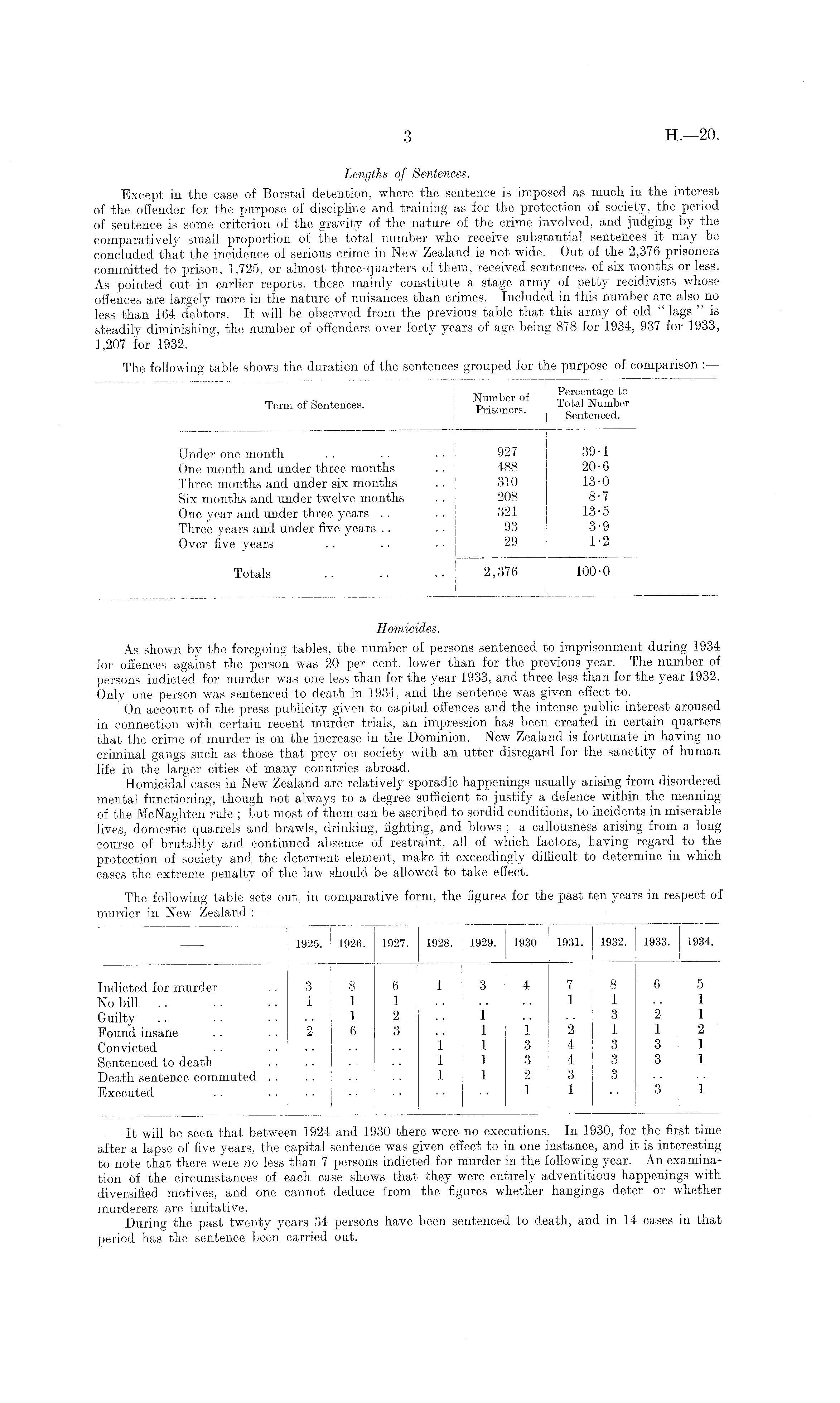 Homicides. As shown by the foregoing tables, the number of persons sentenced to imprisonment during 1934 for offences against the person was 20 per cent, lower than for the previous year. The number of persons indicted for murder was one less than for the year 1933, and three less than for the year 1932. Only one person was sentenced to death in 1934, and the sentence was given effect to. On account of the press publicity given to capital offences and the intense public interest aroused in connection with certain recent murder trials, an impression has been created in certain quarters that the crime of murder is on the increase in the Dominion. New Zealand is fortunate in having no criminal gangs such as those that prey on society with an utter disregard for the sanctity of human life in the larger cities of many countries abroad. Homicidal cases in New Zealand are relatively sporadic happenings usually arising from disordered mental functioning, though not always to a degree sufficient to justify a defence within the meaning of the McNaghten rule ; but most of them can be ascribed to sordid conditions, to incidents in miserable lives, domestic quarrels and brawls, drinking, fighting, and blows ; a callousness arising from a long course of brutality and continued absence of restraint, all of which factors, having regard to the protection of society and the deterrent element, make it exceedingly difficult to determine in which cases the extreme penalty of the law should be allowed to take effect. The following table sets out, in comparative form, the figures for the past ten years in respect of murder in New Zealand :—