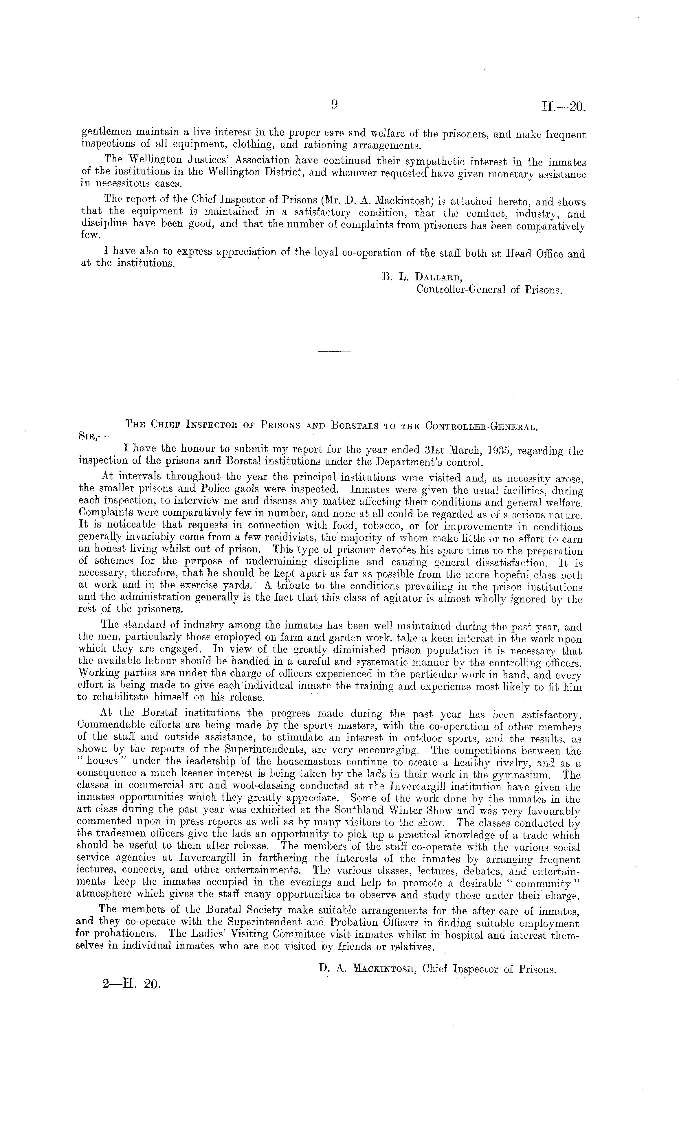 gentlemen maintain a live interest in the proper care and welfare of the prisoners, and make frequent inspections of all equipment, clothing, and rationing arrangements. The Wellington Justices' Association have continued their sympathetic interest in the inmates of the institutions in the Wellington District, and whenever requested have given monetary assistance in necessitous cases. The report of the Chief Inspector of Prisons (Mr. D. A. Mackintosh) is attached hereto, and shows that the equipment is maintained in a satisfactory condition, that the conduct, industry, and discipline have been good, and that the number of complaints from prisoners has been comparatively few. I have also to express appreciation of the loyal co-operation of the staff both at Head Office and at the institutions. B. L. Dallard, Controller-General of Prisons.