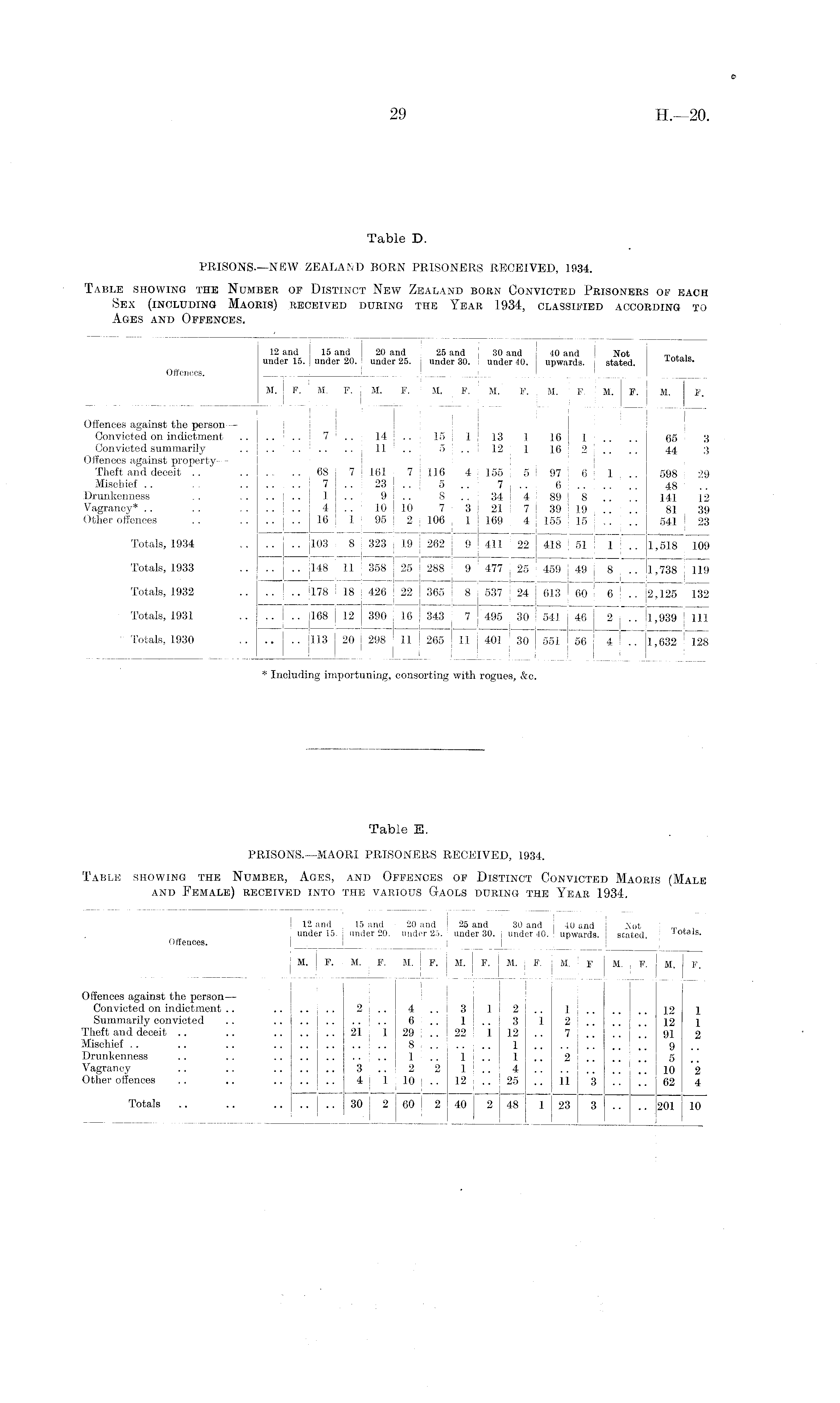 Table E. PRISONS.—MAORI PRISONERS RECEIVED, 1934. Table showing the Number, Ages, and Offences of Distinct Convicted Maoris (Male and Female) received into the various Gaols during the Year 1934.