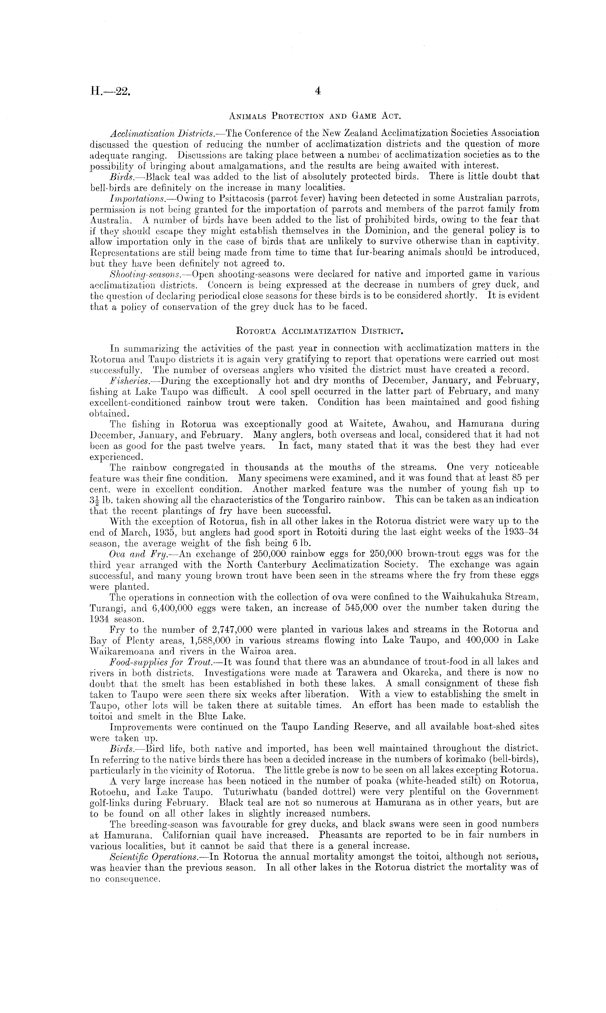 Animals Protection and Game Act. Acclimatization Districts. —The Conference of the New Zealand Acclimatization Societies Association discussed the question of reducing the number of acclimatization districts and the question of more adequate ranging. Discussions are taking place between a number of acclimatization societies as to the possibility of bringing about amalgamations, and the results are being awaited with interest. Birds. —Black teal was added to the list of absolutely protected birds. There is little doubt that bell-birds are definitely on the increase in many localities. Importations. —Owing to Psittacosis (parrot fever) having been detected in some Australian parrots, permission is not being granted for the importation of parrots and members of the parrot family from Australia. A number of birds have been added to the list of prohibited birds, owing to the fear that if they should escape they might establish themselves in the Dominion, and the general policy is to allow importation only in the case of birds that are unlikely to survive otherwise than in captivity. Representations are still being made from time to time that fur-bearing animals should be introduced, but they have been definitely not agreed to. Shooting-seasons. —Open shooting-seasons were declared for native and imported game in various acclimatization districts. Concern is being expressed at the decrease in numbers of grey duck, and the question of declaring periodical close seasons for these birds is to be considered shortly. It is evident that a policy of conservation of the grey duck has to be faced. Rotorua Acclimatization District. In summarizing the activities of the past year in connection with acclimatization matters in the Rotorua and Taupo districts it is again very gratifying to report that operations were carried out most successfully. The number of overseas anglers who visited the district must have created a record. Fisheries. —During the exceptionally hot and dry months of December, January, and February, fishing at Lake Taupo was difficult. A cool spell occurred in the latter part of February, and many excellent-conditioned rainbow trout were taken. Condition has been maintained and good fishing obtained. The fishing in Rotorua was exceptionally good at Waitete, Awahou, and Hamurana during December, January, and February. Many anglers, both overseas and local, considered that it had not been as good for the past twelve years. In fact, many stated that it was the best they had ever experienced. The rainbow congregated in thousands at the mouths of the streams. One very noticeable feature was their fine condition. Many specimens were examined, and it was found that at least 85 per cent, were in excellent condition. Another marked feature was the number of young fish up to 3J lb. taken showing all the characteristics of the Tongariro rainbow. This can be taken as an indication that the recent plantings of fry have been successful. With the exception of Rotorua, fish in all other lakes in the Rotorua district were wary up to the end of March, 1935, but anglers had good sport in Rotoiti during the last eight weeks of the 1933-34 season, the average weight of the fish being 6 lb. Ova and Fry. —An exchange of 250,000 rainbow eggs for 250,000 brown-trout eggs was for the third year arranged with the North Canterbury Acclimatization Society. The exchange was again successful, and many young brown trout have been seen in the streams where the fry from these eggs were planted. The operations in connection with the collection of ova were confined to the Waihukahuka Stream, Turangi, and 6,400,000 eggs were taken, an increase of 545,000 over the number taken during the 1934 season. Fry to the number of 2,747,000 were planted in various lakes and streams in the Rotorua and Bay of Plenty areas, 1,588,000 in various streams flowing into Lake Taupo, and 400,000 in Lake Waikaremoana and rivers in the Wairoa area. Food-supplies for Trout. —It was found that there was an abundance of trout-food in all lakes and rivers in both districts. Investigations were made at Tarawera and Okareka, and there is now no doubt that the smelt has been established in both these lakes. A small consignment of these fish taken to Taupo were seen there six weeks after liberation. With a view to establishing the smelt in Taupo, other lots will be taken there at suitable times. An effort has been made to establish the toitoi and smelt in the Blue Lake. Improvements were continued on the Taupo Landing Reserve, and all available boat-shed sites were taken up. Birds. —Bird life, both native and imported, has been well maintained throughout the district. In referring to the native birds there has been a decided increase in the numbers of korimako (bell-birds), particularly in the vicinity of Rotorua. The little grebe is now to be seen on all lakes excepting Rotorua. A very large increase has been noticed in the number of poaka (white-headed stilt) on Rotorua, Rotoehu, and Lake Taupo. Tuturiwhatu (banded dottrel) were very plentiful on the Government golf-links during February. Black teal are not so numerous at Hamurana as in other years, but are to be found on all other lakes in slightly increased numbers. The breeding-season was favourable for grey ducks, and black swans were seen in good numbers at Hamurana. Californian quail have increased. Pheasants are reported to be in fair numbers in various localities, but it cannot be said that there is a general increase. Scientific Operations. —In Rotorua the annual mortality amongst the toitoi, although not serious, was heavier than the previous season. In all other lakes in the Rotorua district the mortality was of no consequence.