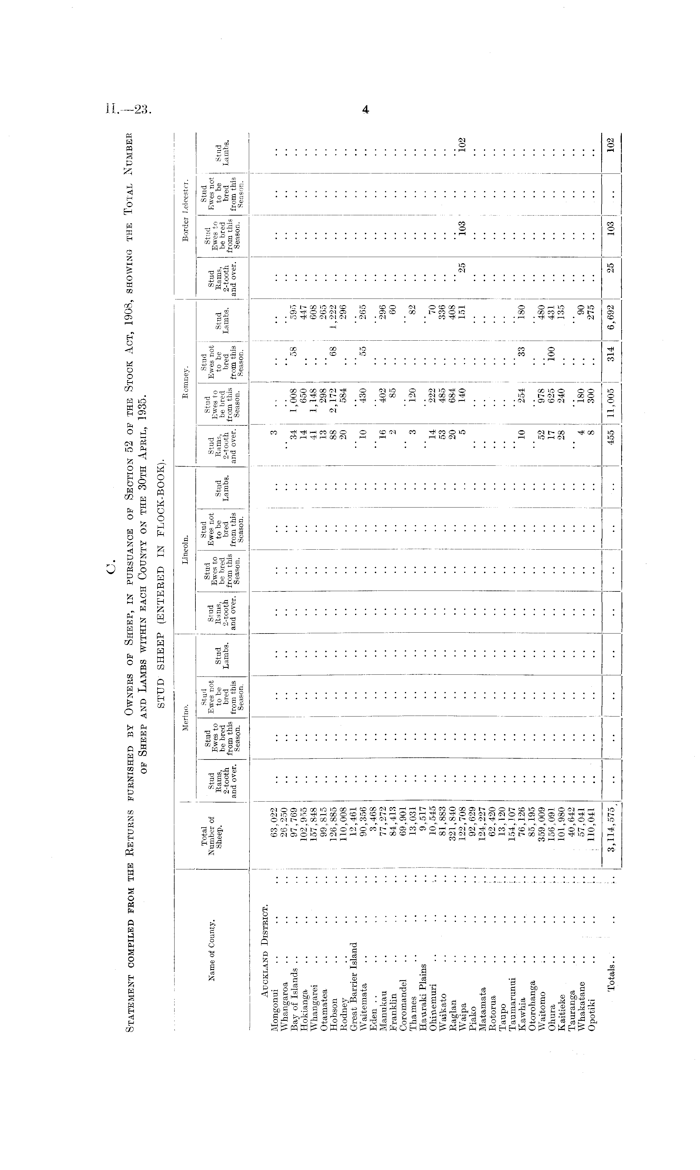 C. Statement compiled from the Returns furnished by Owners of Sheep, in pursuance of Section 52 of the Stock Act, 1908, showing the Total Number of Sheep and Lambs within each County on the 30th April, 1935. STUD SHEEP (ENTERED IN FLOCK-BOOK).