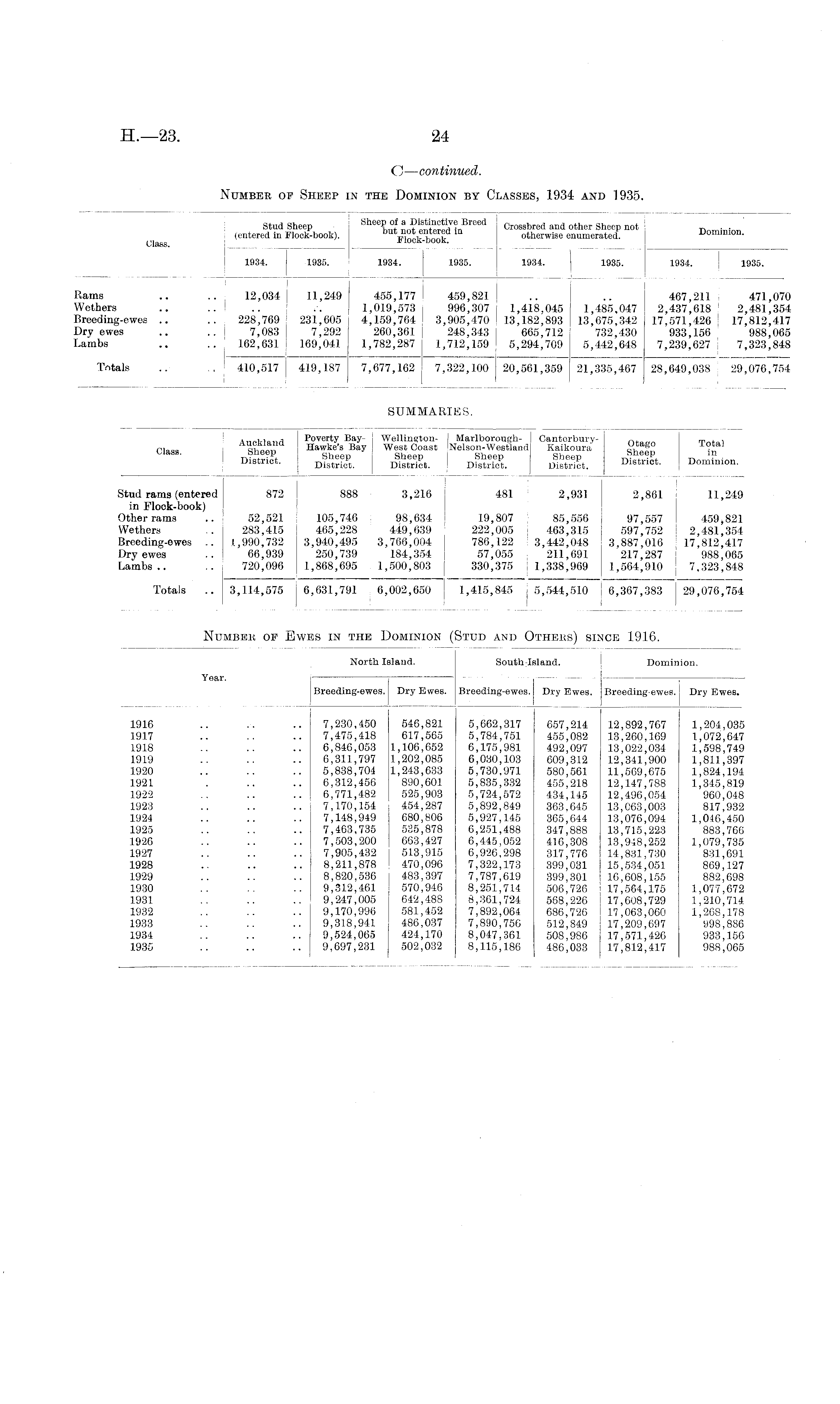 North Island. South Island. Dominion. Year. Breeding-ewes. Dry Ewes. Breeding-ewes. Dry Ewes. Breeding-ewes. Dry Ewes. 1916 .. .. .. 7,230,450 546,821 5,662,317 657,214 12,892,767 1,204,035 1917 .. .. .. 7,475,418 617,565 5,784,751 455,082 13,260,169 1,072,647 1918 .. .. .. 6,846,053 1,106,652 6,175,981 492,097 13,022,034 1,598,749 1919 .. .. .. 6,311,797 1,202,085 6,030,103 609,312 12,341,900 1,811,397 1920 .. .. .. 5,838,704 1,243,633 5,730,971 580,561 11,569,675 1,824,194 1921 . .. .. 6,312,456 890,601 5,835,332 455,218 12,147,788 1,345,819 1922 .. .. .. 6,771,482 525,903 5,724,572 434,145 12,496,054 960,048 1923 .. .. .. 7,170,154 454,287 5,892,849 363,645 13,063,003 817,932 1924 .. .. .. 7,148,949 680,806 5,927,145 365,644 13,076,094 1,046,450 1925 .. .. .. 7,463,735 535,878 6,251,488 347,888 13,715,223 883,766 1926 .. .. .. 7,503,200 663,427 6,445,052 416,308 13,948,252 1,079,735 1927 .. .. .. 7,905,432 513,915 6,926,298 317,776 14,831,730 831,691 1928 .. .. .. 8,211,878 470,096 7,322,173 399,031 15,534,051 869,127 1929 .. .. .. 8,820,536 483,397 7,787,619 399,301 I 16,608,155 882,698 1930 .. .. .. 9,312,461 570,946 8,251,714 506,726 17,564,175 1,077,672 1931 .. .. .. 9,247,005 642,488 8,361,724 568,226 17,608,729 1,210,714 1932 .. .. .. 9,170,996 581,452 7,892,064 686,726 17,063,060 1,268,178 1933 .. .. .. 9,318,941 486,037 7,890,756 512,849 17,209,697 998,886 1934 .. .. .. 9,524,065 424,170 8,047,361 508,986 17,571,426 933,156 1935 .. .. .. 9,697,231 502,032 8,115,186 486,033 17,812,417 988,065