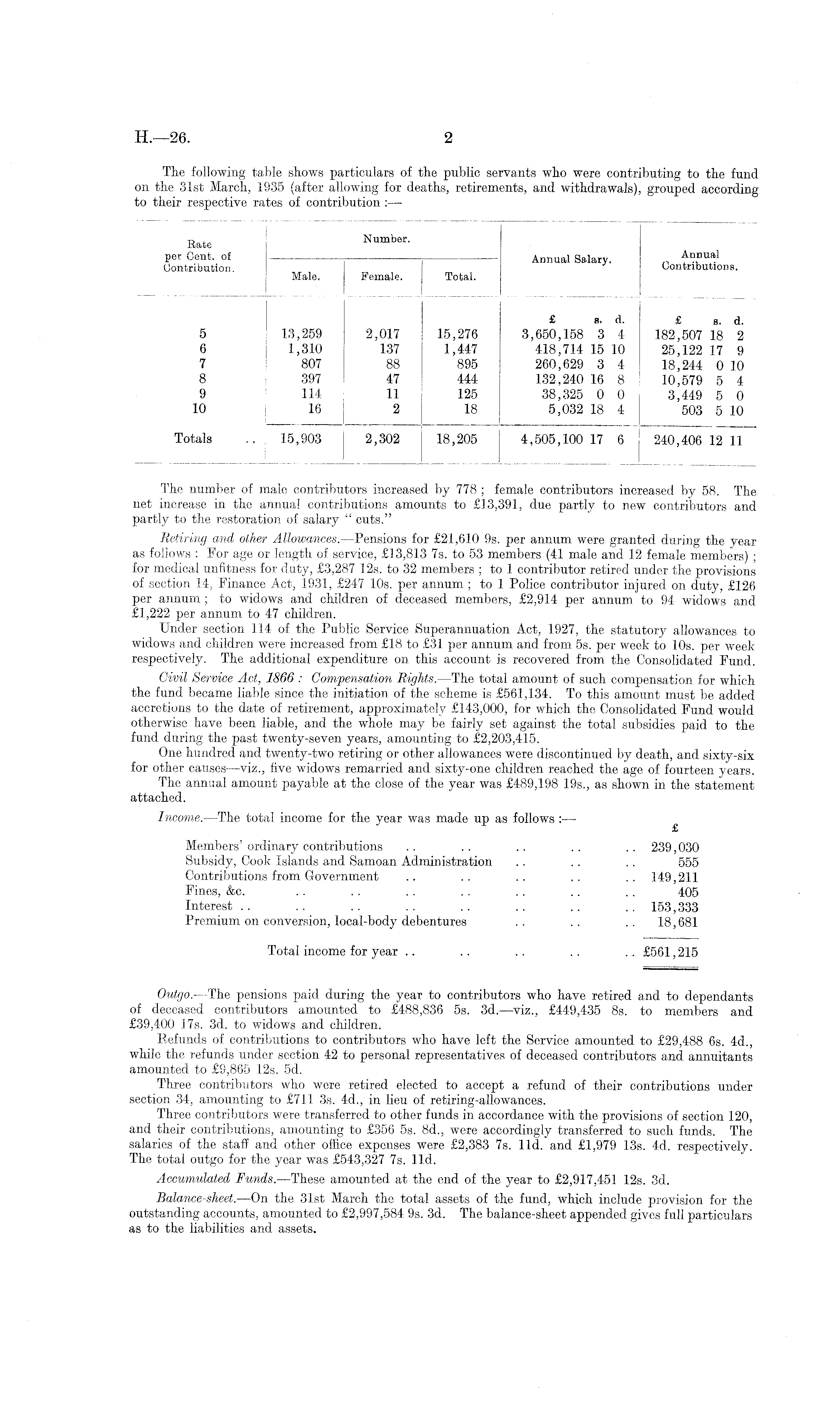 The number of male contributors increased by 778 ; female contributors increased by 58. The net increase in the annual contributions amounts to £i 3,391, due partly to new contributors and partly to the festoration of salary " cuts." Retiring and other Allowances.—Pensions for £21,610 9s. per annum were granted during the year as follows : For age or length of service, £13,813 7s. to 53 members (41 male and 12 female members) : for medical unfitness for duty, £3,287 12s. to 32 members ; to 1 contributor retired under the provisions of section 14, Finance Act, 1931, £247 10s. per annum ; to 1 Police contributor injured on duty, £126 per annum ; to widows and children of deceased members, £2,914 per annum to 94 widows and £1,222 per annum to 47 children. Under section 114 of the Public Service Superannuation Act, 1927, the statutory allowances to widows and children were increased from £18 to £31 per annum and from ss. per week to 10s. per week respectively. The additional expenditure on this account is recovered from the Consolidated Fund. Civil Service Act, 1866 : Compensation Rights.—The total amount of such compensation for which the fund became liable since the initiation of the scheme is £561,134. To this amount must be added accretions to the date of retirement, approximately £143,000, for which the Consolidated Fund would otherwise have been liable, and the whole may be fairly set against the total subsidies paid to the fund during the past twenty-seven years, amounting to £2,203,415. One hundred and twenty-two retiring or other allowances were discontinued by death, and sixty-six for other causes —viz., five widows remarried and sixty-one children reached the age of fourteen years. The annual amount payable at the close of the year was £489,198 195., as shown in the statement attached. Income. —The total income for the year was made up as follows :— Members'ordinary contributions .. .. .. .. .. 239,030 Subsidy, Cook Islands and Samoan Administration .. . . .. 555 Contributions from Government .. . . .. .. .. 149,211 Fines, &c. . . . . . . .. . . .. . . 405 Interest . . . . . . . . . . . . . . . . 153,333 Premium on conversion, local-body debentures .. .. .. 18,681 Total income for year .. . . .. . . . . £561,215 Outgo.—The pensions paid during the year to contributors who have retired and to dependants of deceased contributors amounted to £488,836 ss. 3d.—viz., £449,435 Bs. to members and £39,400 17s. 3d. to widows ancl children. Refunds of contributions to contributors who have left the Service amounted to £29,488 6s. 4d., while the refunds under section 42 to personal representatives of deceased contributors and annuitants amounted to £9,865 12s. sd. Three contributors who were retired elected to accept a refund of their contributions under section 34, amounting to £711 3s. 4d., in lieu of retiring-allowances. Three contributors were transferred to other funds in accordance with the provisions of section 120, and their contributions, amounting to £356 ss. Bd., were accordingly transferred to such funds. The salaries of the staff and other office expenses were £2,383 7s. lid. and £1,979 13s. 4d. respectively. The total outgo for the year was £543,327 7s. lid. Accumulated Funds.—These amounted at the end of the year to £2,917,451 12s. 3d. Balance-sheet. —On the 31st March the total assets of the fund, which include provision for the outstanding accounts, amounted to £2,997,584 9s. 3d. The balance-sheet appended gives full particulars as to the liabilities and assets.