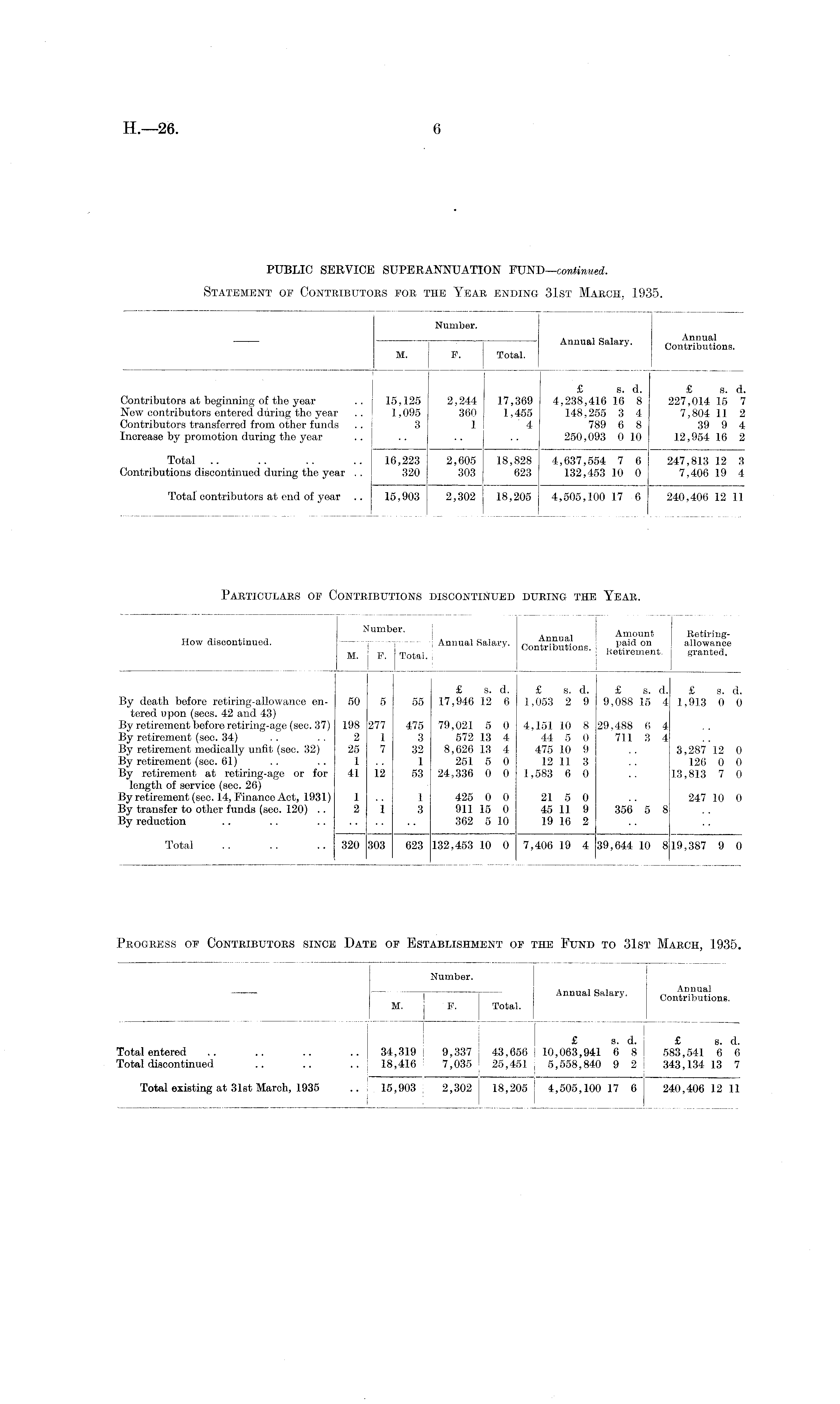 Number. Annual Salary. Contributions. M. F. Total. £ s. d. £ s. d. Total entered .. .. .. .. 34,319 9,337 43,656 10,063,941 6 8 583,541 6 6 Total discontinued .. .. .. 18,416 7,035 25,451 5,558,840 9 2 343,134 13 7 Total existing at 31st March, 1935 .. 15,903 2,302 18,205 4,505,100 17 6 240,406 12 11