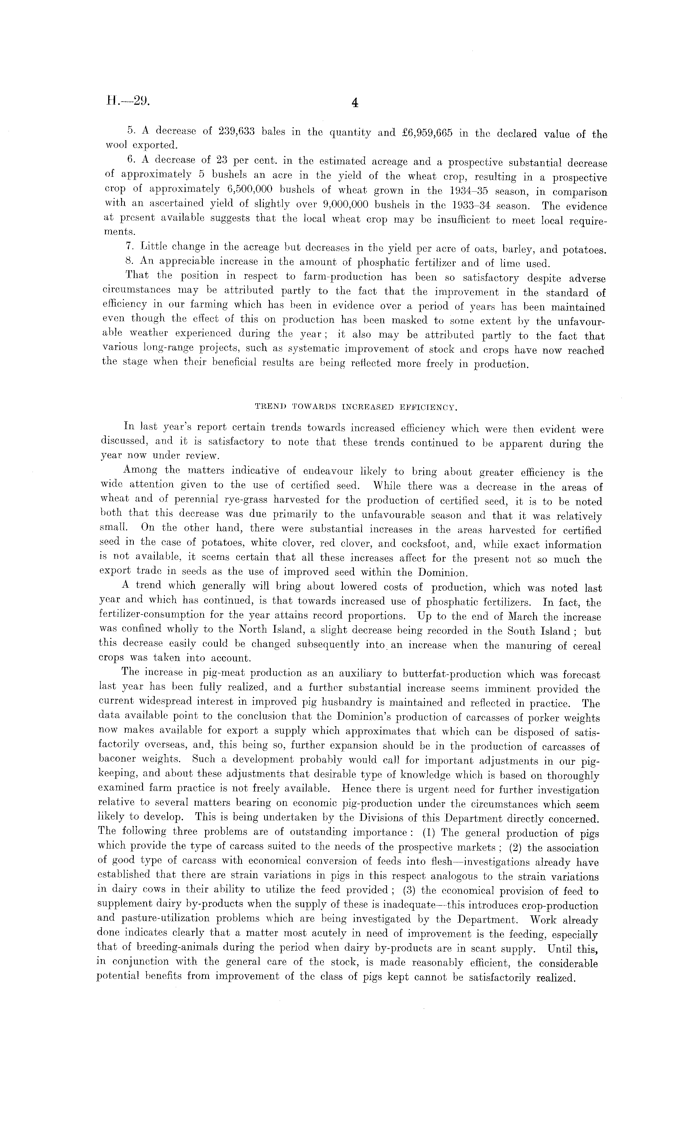 5. A decrease of 239,633 bales in the quantity and £6,959,665 in the declared value of the wool exported. 6. A decrease of 23 per cent, in the estimated acreage and a prospective substantial decrease of approximately 5 bushels an acre in the yield of the wheat crop, resulting in a prospective crop of approximately 6,500,000 bushels of wheat grown in the 1934-35 season, in comparison with an ascertained yield of slightly over 9,000,000 bushels in the 1933-34 season. The evidence at present available suggests that the local wheat crop may be insufficient to meet local requirements. 7. Little change in the acreage but decreases in the yield per acre of oats, barley, and potatoes. 8. An appreciable increase in the amount of phosphatic fertilizer and of lime used. That the position in respect to farm-production has been so satisfactory despite adverse circumstances may be attributed partly to the fact that the improvement in the standard of efficiency in our farming which has been in evidence over a period of years has been maintained even though the effect of this on production has been masked to some extent by the unfavourable weather experienced during the year; it also may be attributed partly to the fact that various long-range projects, such as systematic improvement of stock and crops have now reached the stage when their beneficial results are being reflected more freely in production. TREND TOWARDS INCREASED EFFICIENCY. In last year s report certain trends towards increased efficiency which were then evident were discussed, and it is satisfactory to note that these trends continued to be apparent during the year now under review. Among the matters indicative of endeavour likely to bring about greater efficiency is the wide attention given to the use of certified seed. While there was a decrease in the areas of wheat and of perennial rye-grass harvested for the production of certified seed, it is to be noted both that this decrease was due primarily to the unfavourable season and that it was relatively small. On the other hand, there were substantial increases in the areas harvested for certified seed in the case of potatoes, white clover, red clover, and cocksfoot, and, while exact information is not available, it seems certain that all these increases affect for the present not so much the export trade in seeds as the use of improved seed within the Dominion. A trend which generally will bring about lowered costs of production, which was noted last year and which has continued, is that towards increased use of phosphatic fertilizers. In fact, the fertilizer-consumption for the year attains record proportions. Up to the end of March the increase was confined wholly to the North Island, a slight decrease being recorded in the South Island ; but this decrease easily could be changed subsequently into, an increase when the manuring of cereal crops was taken into account. The increase in pig-meat production as an auxiliary to b.utterfat-production which was forecast last year has been fully realized, and a further substantial increase seems imminent provided the current widespread interest in improved pig husbandry is maintained and reflected in practice. The data available point to the conclusion that the Dominion's production of carcasses of porker weights now makes available for export a supply which approximates that which can be disposed of satisfactorily overseas, and, this being so, further expansion should be in the production of carcasses of baconer weights. Such a development probably would call for important adjustments in our pigkeeping, and about these adjustments that desirable type of knowledge which is based on thoroughly examined farm practice is not freely available. Hence there is urgent need for further investigation relative to several matters bearing on economic pig-production under the circumstances which seem likely to develop. This is being undertaken by the Divisions of this Department directly concerned. The following three problems are of outstanding importance : (1) The general production of pigs which provide the type of carcass suited to the needs of the prospective markets ; (2) the association of good type of carcass with economical conversion of feeds into flesh—investigations already have established that there are strain variations in pigs in this respect analogous to the strain variations in dairy cows in their ability to utilize the feed provided ; (3) the economical provision of feed to supplement dairy by-products when the supply of these is inadequate—this introduces crop-production and pasture-utilization problems which are being investigated by the Department. Work already done indicates clearly that a matter most acutely in need of improvement is the feeding, especially that of breeding-animals during the period when dairy by-products are in scant supply. Until this, in conjunction with the general care of the stock, is made reasonably efficient, the considerable potential benefits from improvement of the class of pigs kept cannot be satisfactorily realized.