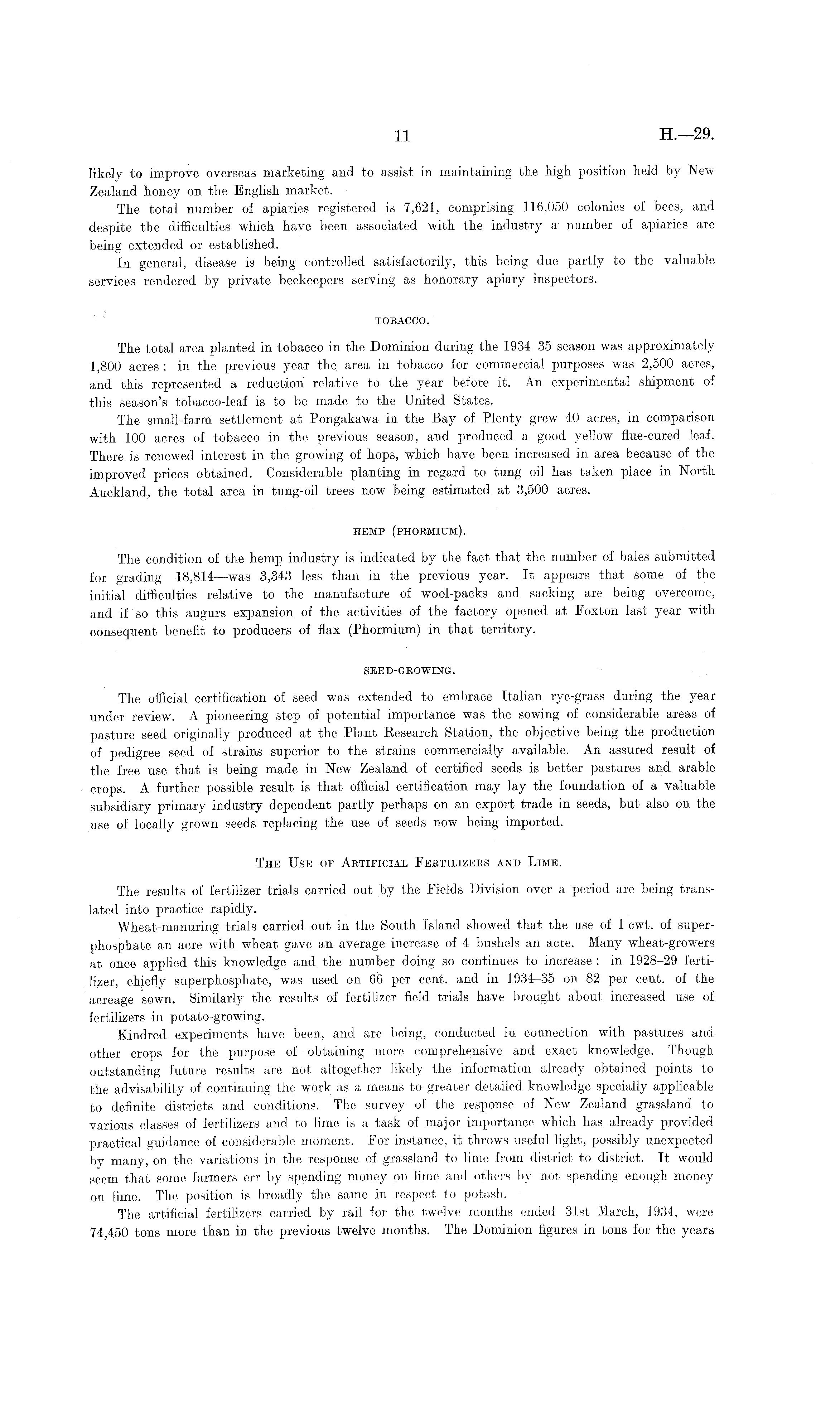 likely to improve overseas marketing and to assist in maintaining the high position held by New Zealand honey on the English market. The total number of apiaries registered is 7,621, comprising 116,050 colonies of bees, and despite the difficulties which have been associated with the industry a' number of apiaries are being extended or established. In general, disease is being controlled satisfactorily, this being due partly to the valuable services rendered by private beekeepers serving as honorary apiary inspectors. TOBACCO. The total area planted in tobacco in the Dominion during the 1934-35 season was approximately 1,800 acres: in the previous year the area in tobacco for commercial purposes was 2,500 acres, and this represented a reduction relative to the year before it. An experimental shipment of this season's tobacco-leaf is to be made to the United States. The small-farm settlement at Pongakawa in the Bay of Plenty grew 40 acres, in comparison with 100 acres of tobacco in the previous season, and produced a good yellow flue-cured leaf. There is renewed interest in the growing of hops, which have been increased in area because of the improved prices obtained. Considerable planting in regard to tung oil has taken place in North Auckland, the total area in tung-oil trees now being estimated at 3,500 acres. HEMP (PHORMIUM). The condition of the hemp industry is indicated by the fact that the number of bales submitted for grading —18,814 —was 3,343 less than in the previous year. It appears that some of the initial difficulties relative to the manufacture of wool-packs and sacking are being overcome, and if so this augurs expansion of the activities of the factory opened at Foxton last year with consequent benefit to producers of flax (Phormium) in that territory. SEED-GROWING. The official certification of seed was extended to embrace Italian rye-grass during the year under review. A pioneering step of potential importance was the sowing of considerable areas of pasture seed originally produced at the Plant Research Station, the objective being the production of pedigree, seed of strains superior to the strains commercially available. An assured result of the free use that is being made in New Zealand of certified seeds is better pastures and arable crops. A further possible result is that official certification may lay the foundation of a valuable subsidiary primary industry dependent partly perhaps on an export trade in seeds, but also on the use of locally grown seeds replacing the use of seeds now being imported. The Use op Artificial Fertilizers and Lime. The results of fertilizer trials carried out by the Fields Division over a period are being translated into practice rapidly. Wheat-manuring trials carried out in the South Island showed that the use of 1 cwt. of superphosphate an acre with wheat gave an average increase of 4 bushels an acre. Many wheat-growers at once applied this knowledge and the number doing so continues to increase : in 1928-29 fertilizer, chiefly superphosphate, was used on 66 per cent, and in 1934-35 on 82 per cent, of the acreage sown. Similarly the results of fertilizer field trials have brought about increased use of fertilizers in potato-growing. Kindred experiments have been, and are being, conducted in connection with pastures and other crops for the purpose of obtaining more comprehensive and exact knowledge. Though outstanding future results are not altogether likely the information already obtained points to the advisability of continuing the work as a means to greater detailed knowledge specially applicable to definite districts and conditions. The survey of the response of New Zealand grassland to various classes of fertilizers and to lime is a task of major importance which has already provided practical guidance of considerable moment. For instance, it throws useful light, possibly unexpected by many, on the variations in the response of grassland to lime from district to district. It would seem that some farmers err by spending money on lime and others by not spending enough money on lime. The position is broadly the same in respect to potash. The artificial fertilizers carried by rail for the twelve months ended 31st March, 1934, were 74,450 tons more than in the previous twelve months. The Dominion figures in tons for the years