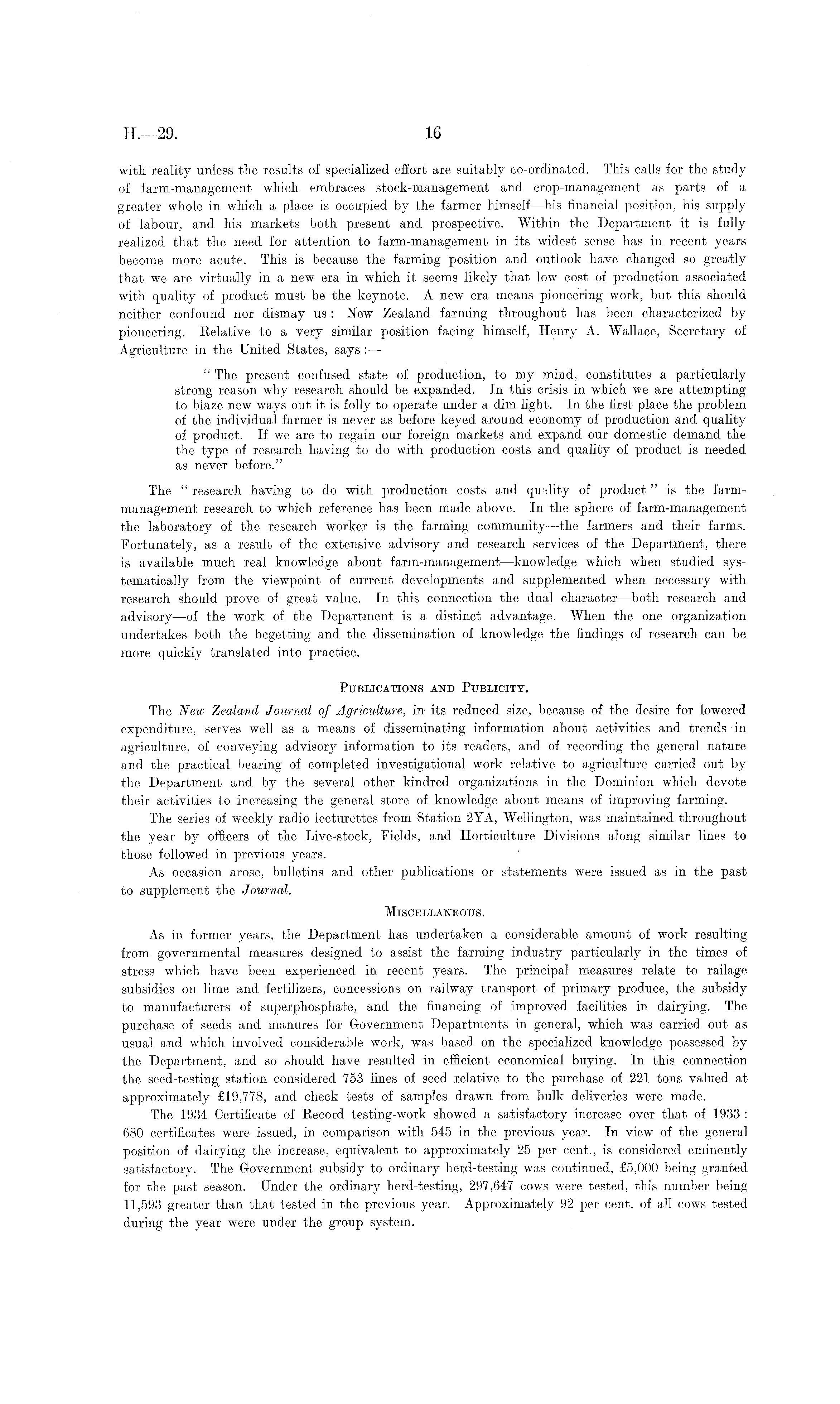 with reality unless the results of specialized effort are suitably co-ordinated. This calls for the study of farm-management which embraces stock-management and crop-management as parts of a greater whole in which a place is occupied by the farmer himself— his financial position, his supply of labour, and his markets both present and prospective. Within the Department it is fully realized that the need for attention to farm-management in its widest sense has in recent years become more acute. This is because the farming position and outlook have changed so greatly that we are virtually in a new era in which it seems likely that low cost of production associated with quality of product must be the keynote. A new era means pioneering work, but this should neither confound nor dismay us : New Zealand farming throughout has been characterized by pioneering. Relative to a very similar position facing himself, Henry A. Wallace, Secretary of Agriculture in the United States, says: — " The present confused state of production, to my mind, constitutes a particularly strong reason why research should be expanded. In this crisis in which we are attempting to blaze new ways out it is folly to operate under a dim light. In the first, place the problem of the individual farmer is never as before keyed around economy of production and quality of product. If we are to regain our foreign markets and expand our domestic demand the the type of research having to do with production costs and quality of product is needed as never before." The " research having to do with production costs and quality of product " is the farmmanagement research to which reference has been made above. In the sphere of farm-management the laboratory of the research worker is the farming community—the farmers and their farms. Fortunately, as a result of the extensive advisory and research services of the Department, there is available much real knowledge about farm-management—knowledge which when studied systematically from the viewpoint of current developments and supplemented when necessary with research should prove of great value. In this connection the dual character —both research and advisory —of the work of the Department is a distinct advantage. When the one organization undertakes both the begetting and the dissemination of knowledge the findings of research can be more quickly translated into practice. Publications and Publicity. The New Zealand Journal of Agriculture, in its reduced size, because of the desire for lowered expenditure, serves well as a means of disseminating information about activities and trends in agriculture, of conveying advisory information to its readers, and of recording the general nature and the practical bearing of completed investigational work relative to agriculture carried out by the Department and by the several other kindred organizations in the Dominion which devote their activities to increasing the general store of knowledge about means of improving farming. The series of weekly radio lecturettes from Station 2YA, Wellington, was maintained throughout the year by officers of the Live-stock, Fields, and Horticulture Divisions along similar lines to those followed in previous years. As occasion arose, bulletins and other publications or statements were issued as in the past to supplement the Journal. Miscellaneous. As in former years, the Department has undertaken a considerable amount of work resulting from governmental measures designed to assist the farming industry particularly in the times of stress which have been experienced in recent years. The principal measures relate to railage subsidies on lime and fertilizers, concessions on railway transport of primary produce, the subsidy to manufacturers of superphosphate, and the financing of improved facilities in dairying. The purchase of seeds and manures for Government Departments in general, which was carried out as usual and which involved considerable work, was based on the specialized knowledge possessed by the Department, and so should have resulted in efficient economical buying. In this connection the seed- station considered 753 lines of seed relative to the purchase of 221 tons valued at approximately £19,778, and check tests of samples drawn from bulk deliveries were made. The 1934 Certificate of Record testing-work showed a satisfactory increase over that of 1933 : 680 certificates were issued, in comparison with 545 in the previous year. In view of the general position of dairying the increase, equivalent to approximately 25 per cent., is considered eminently satisfactory. The Government subsidy to ordinary herd-testing was continued, £5,000 being granted for the past season. Under the ordinary herd-testing, 297,647 cows were tested, this number being 11,593 greater than that tested in the previous year. Approximately 92 per cent, of all cows tested during the year were under the group system.