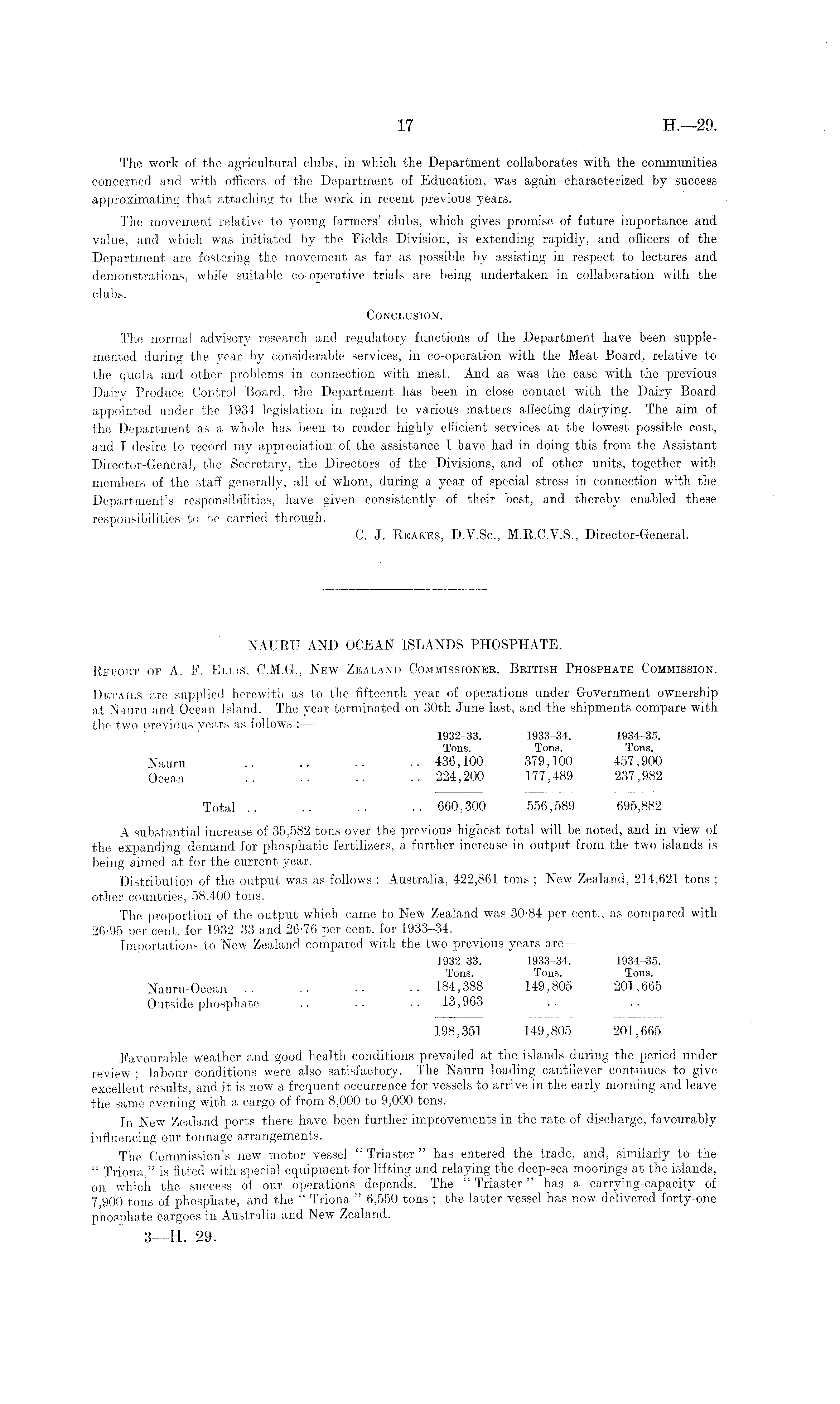 The work of the agricultural clubs, in which the Department collaborates with the communities concerned and with officers of the Department of Education, was again characterized by success approximating that attaching to the work in recent previous years. The movement relative to young farmers' clubs, which gives promise of future importance and value, and which was initiated by the Fields Division, is extending rapidly, and officers of the Department are fostering the movement as far as possible by assisting in respect to lectures and demonstrations, while suitable co-operative trials are being undertaken in collaboration with the clubs. Conclusion. The normal advisory research and regulatory functions of the Department have been supplemented during the year by considerable services, in co-operation with the Meat Board, relative to the quota and other problems in connection with meat. And as was the case with the previous Dairy Produce Control Board, the Department has been in close contact with the Dairy Board appointed under the 1934 legislation in regard to various matters affecting dairying. The aim of the Department as a whole has been to render highly efficient services at the lowest possible cost, and I desire to record my appreciation of the assistance I have had in doing this from the Assistant Director-General, the Secretary, the Directors of the Divisions, and of other units, together with members of the staff generally, all of whom, during a year of special stress in connection with the Department's responsibilities, have given consistently of their best, and thereby enabled these responsibilities to be carried through. C. J. Reakes, D.V.Sc., M.R.C.V.S., Director-General.