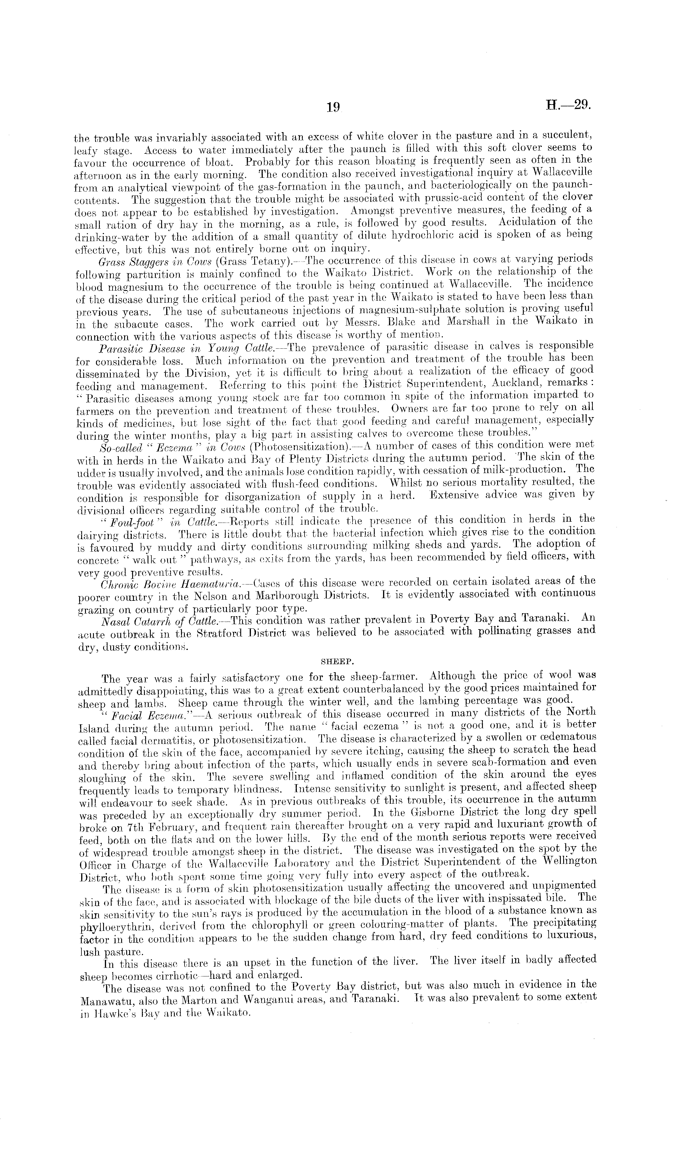 the trouble was invariably associated with an excess of white clover in the pasture and in a succulent, leafy stage. Access to water immediately after the paunch is filled with this soft clover seems to favour the occurrence of bloat. Probably for this reason bloating is frequently seen as often in the afternoon as in the early morning. The condition also received investigational inquiry at Wallaceville from an analytical viewpoint of the gas-formation in the paunch, and bacteriologically on the paunchcontents. The suggestion that the trouble might be associated with prussic-acid content of the clover does not appear to be established by investigation. Amongst preventive measures, the feeding of a small ration of dry hay in the morning, as a rule, is followed by good results. Acidulation of the drinking-water by the addition of a small quantity of dilute hydrochloric acid is spoken of as being effective, but this was not entirely borne out on inquiry. Grass Staggers in Cows (Grass Tetany). —The occurrence of this disease in cows at varying periods following parturition is mainly confined to the Waikato District. Work on the relationship of the blood magnesium to the occurrence of the trouble is being continued at Wallaceville. The incidence of the disease during the critical period of the past year in the Waikato is stated to have been less than previous years. The use of subcutaneous injections of magnesium-sulphate solution is proving useful in the subacute cases. The work carried out by Messrs. Blake and Marshall in the Waikato in connection with the various aspects of this disease is worthy of mention. Parasitic Disease in Young Cattle. —The prevalence of parasitic disease in calves is responsible for considerable loss. Much information on the prevention and treatment of the trouble has been disseminated by the Division, yet it is difficult to bring about a realization of the efficacy of good feeding and management. Referring to this point the District Superintendent, Auckland, remarks . " Parasitic diseases among young stock are far too. common in spite of the information imparted to farmers on the prevention and treatment of these troubles. Owners are far too prone to rely on all kinds of medicines, but lose sight of the fact that good feeding and careful management, especially during the winter months, play a big part in assisting calves to overcome these troubles. So-called " Eczema "in Cows (Photosensitization).— A number of cases of this condition were met with in herds in the Waikato and Bay of Plenty Districts during the autumn period. The skm of the udder is usually involved, and the animals lose condition rapidly, with cessation of milk-production. The trouble was evidently associated with flush-feed conditions. Whilst no serious mortality resulted, the condition is responsible for disorganization of supply in a herd. Extensive advice was given by divisional officers regarding suitable control of the trouble. " Foul-foot " in Cattle. —Reports still indicate the presence of this condition in herds m the dairying districts. There is little doubt that the bacterial infection which gives rise to the condition is favoured by muddy and dirty conditions surrounding milking sheds and yards. The adoption of concrete " walk out " pathways, as exits from the yards, has been recommended by field officers, with very good preventive results. Chronic Bovine Haematuria. —Cases of this disease were recorded on certain isolated areas of the poorer country in the Nelson and Marlborough Districts. It is evidently associated with continuous grazing on country of particularly poor type. Nasal Catarrh of Cattle. —This condition was rather prevalent in Poverty Bay and Taranaki. An acute outbreak in the Stratford District was believed to be associated with pollinating grasses and dry, dusty conditions. SHEEP. The year was a fairly satisfactory one for the sheep-farmer. Although the price of wool was admittedly disappointing, this was to a great extent counterbalanced by the good prices maintained for sheep and lambs. Sheep came through the winter well, and the lambing percentage was good.^ " Facial Eczema." —A serious outbreak of this disease occurred in many districts of the North Island during the autumn period. The name " facial eczema is not a good one, and it is better called facial dermatitis, or photosensitization. The disease is characterized by a swollen or oedematous condition of the skin of the face, accompanied by severe itching, causing the sheep to scratch the head and thereby bring about infection of the parts, which usually ends in severe scab-formation and even sloughing of the skin. The severe swelling and inflamed condition of the skin around the eyes frequently leads to temporary blindness. Intense sensitivity to sunlight is present, and affected sheep will endeavour to seek shade. As in previous outbreaks of this trouble, its occurrence in the autumn was preceded by an exceptionally dry summer period. In the Gisborne District the long dry spell broke on 7th February, and frequent rain thereafter brought on a very rapid and luxuriant growth of feed, both on the flats and on the lower hills. By the end of the month serious reports were received of widespread trouble amongst sheep in the district. The disease was investigated on the spot by the Officer in Charge of the Wallaceville Laboratory and the District Superintendent of the Wellington District, who both spent some time going very fully into every aspect of the outbreak. The disease is a form of skin photosensitization usually affecting the uncovered and unpigmented skin of the face, and is associated with blockage of the bile ducts of the liver with inspissated bile. The skin sensitivity to the sun's rays is produced by the accumulation in the blood of a substance known as phylloerythrin, derived from the chlorophyll or green colouring-matter of plants. The precipitating factor in the condition appears to be t
