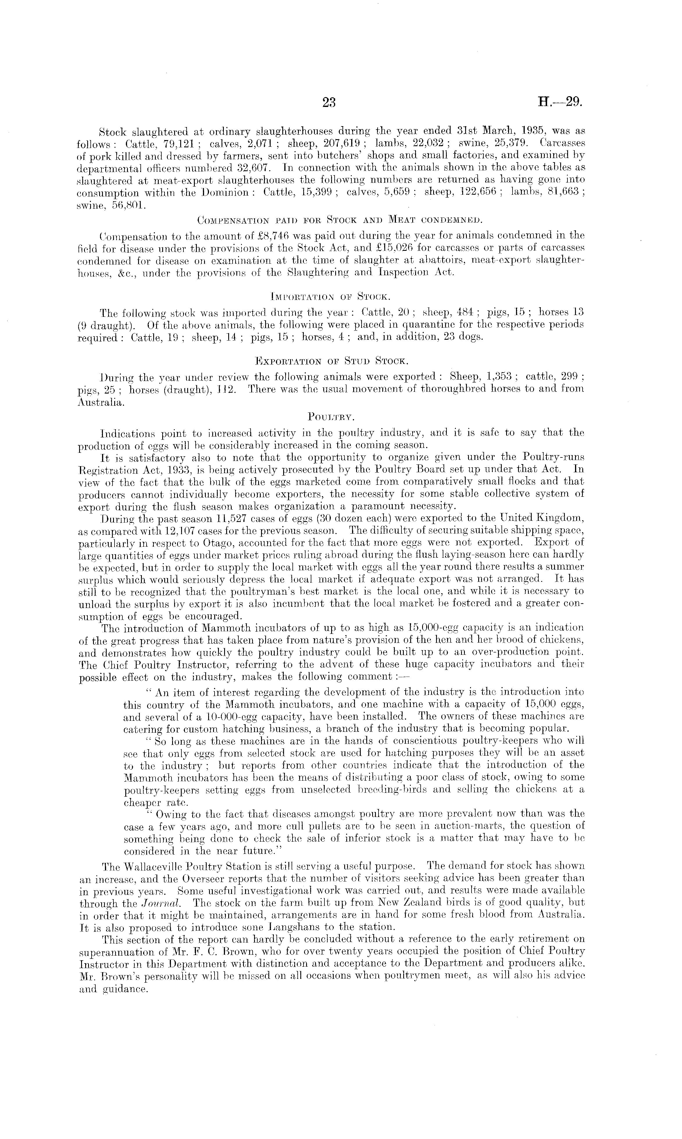Stock slaughtered at ordinary slaughterhouses during the year ended 31st, March, 1935, was as follows : Cattle, 79,121 ; calves, 2,071 ; sheep, 207,619 ; lambs, 22,032 ; swine, 25,379. Carcasses of pork killed and dressed by farmers, sent into butchers' shops and small factories, and examined by departmental officers numbered 32,607. In connection with the animals shown in the above tables as slaughtered at meat-export slaughterhouses the following numbers are returned as having gone into consumption within the Dominion : Cattle, 15,399 ; calves, 5,659 ; sheep, 122,656 ; lambs, 81,663 ; swine, 56,801. Compensation paid for Stock and Meat condemned. Compensation to the amount of £8,746 was paid out during the year for animals condemned in the field for disease under the provisions of the Stock Act, and £15,026 for carcasses or parts of carcasses condemned for disease on examination at the time of slaughter at abattoirs, meat-export slaughterhouses, &c., under the provisions of the Slaughtering and Inspection Act. Importation of Stock. The following stock was imported during the year : Cattle, 20 ; sheep, 484 ; pigs, 15 ; horses 13 (9 draught). Of the above animals, the following were placed in quarantine for the respective periods required : Cattle, 19 ; sheep, 14 ; pigs, 15 ; horses, 4 ; and, in addition, 23 dogs. Exportation of Stud Stock. During the year under review the following animals were exported : Sheep, 1,353 ; cattle, 299 ; pigs, 25 ; horses (draught), 112. There was the usual movement of thoroughbred horses to and from Australia. Poultry. Indications point to increased activity in the poultry industry, and it is safe to say that the production of eggs will be considerably increased in the coming season. It is satisfactory also to note that the opportunity to organize given under the Poultry-runs Eegistration Act, 1933, is being actively prosecuted by the Poultry Board set up under that Act. In view of the fact that the bulk of the eggs marketed come from comparatively small flocks and that producers cannot individually become exporters, the necessity for some stable collective system of export during the flush season makes organization a paramount necessity. During the past season 11,527 cases of eggs (30 dozen each) were exported to the United Kingdom, as compared with 12,107 cases for the previous season. The difficulty of securing suitable shipping space, particularly in respect to Otago, accounted for the fact that more eggs were not exported. Export of large quantities of eggs under market prices ruling abroad during the flush laying-season here can hardly be expected, but in order to supply the local market with eggs all the year round there results a summer surplus which would seriously depress the local market if adequate export was not arranged. It has still to be recognized that the poultryman's best market is the local one, and while it is necessary to unload the surplus by export it is also incumbent that the local market be fostered and a greater consumption of eggs be encouraged. The introduction of Mammoth incubators of up to as high as 15,000-egg capacity is an indication of the great progress that has taken place from nature's provision of the hen and her brood of chickens, and demonstrates how quickly the poultry industry could be built up to an over-production point. The Chief Poultry Instructor, referring to the advent of these huge capacity incubators and their possible effect on the industry, makes the following comment: — " An item of interest regarding the development of the industry is the introduction into this country of the Mammoth incubators, and one machine with a capacity of 15,000 eggs, and several of a 10-000-egg capacity, have been installed. The owners of these machines are catering for custom hatching business, a branch of the industry that is becoming popular. " So long as these machines are in the hands of conscientious poultry-keepers who will see that only eggs from selected stock are used for hatching purposes they will be an asset to the industry ; but reports from other countries indicate that the introduction of the Mammoth incubators has been the means of distributing a poor class of stock, owing to some poultry-keepers setting eggs from unselected breeding-birds and selling the chickens at a cheaper rate. " Owing to the fact that diseases amongst poultry are more prevalent now than was the case a few years ago, and more cull pullets are to be seen in auction-marts, the question of something being done to check the sale of inferior stock is a matter that may have to be considered in the near future." The Wallaceville Poultry Station is still serving a useful purpose. The demand for stock has shown an increase, and the Overseer reports that the number of visitors seeking advice has been greater than in previous years. Some useful investigational work was carried out, and results were made available through the Journal. The stock on the farm built up from New Zealand birds is of good quality, but in order that it might be maintained, arrangements are in hand for some fresh blood from Australia. It is also proposed to introduce sone Langshans to the station. This section of the report can hardly be concluded without a reference to the early retirement on superannuation of Mr. E. C. Brown, who for over twenty years occupied the position of Chief Poultry Instructor in this Department with distinction and acceptance to the Department and producers alike. Mr. Brown's personality will be missed on all occasions when poultrymen meet, as will also his advice and guidance.