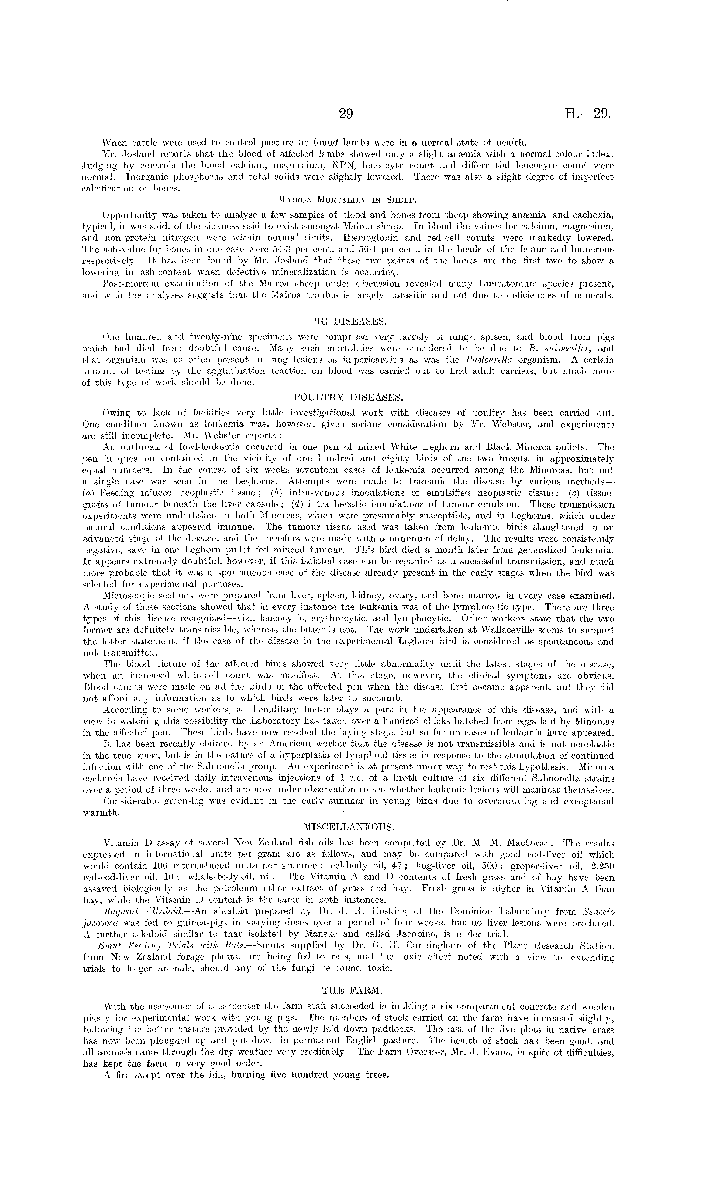 When cattle were used to control pasture lie found lambs were in a normal state of health. Mr. Josland reports that the blood of affected lambs showed only a slight anaemia with a normal colour index. Judging by controls the blood calcium, magnesium, NPN, leucocyte count and differential leucocyte count were normal. Inorganic phosphorus and total solids were slightly lowered. There was also a slight degree of imperfect calcification of bones. Mairoa Mortality in Sheep. Opportunity was taken to analyse a few samples of blood and bones from sheep showing anaemia and cachexia, typical, it was said, of the sickness said to exist amongst Mairoa sheep. In blood the values for calcium, magnesium, and non-protein nitrogen were within normal limits. Haemoglobin and red-cell counts were markedly lowered. The ash-value fojr bones in one case were 54-3 per cent, and 56-1 per cent, in the heads of the femur and humerous respectively. It has been found by Mr. Josland that these two points of the bones are the first two to show a lowering in ash-content when defective mineralization is occurring. Post-mortem examination of the Mairoa sheep under discussion revealed many Bunostomum species present, and with the analyses suggests that the Mairoa trouble is largely parasitic and not due to deficiencies of minerals. PIG DISEASES. One hundred and twenty-nine specimens were comprised very largely of lungs, spleen, and blood from pigs which had died from doubtful cause. Many such mortalities were considered to be due to B. suipestifer, and that organism was as often present in lung lesions as in pericarditis as was the Pasteurella organism. A certain amount of testing by the agglutination reaction on blood was carried out to find adult carriers, but much more of this type of work should be done. POULTRY DISEASES. Owing to lack of facilities very little investigational work with diseases of poultry has been carried out. One condition known as leukemia was, however, given serious consideration by Mr. Webster, and experiments are still incomplete. Mr. Webster reports : — An outbreak of fowl-leukemia occurred in one pen of mixed White Leghorn and Black Minorca pullets. The pen in question contained in the vicinity of one hundred and eighty birds of the two breeds, in approximately equal numbers. In the course of six weeks seventeen cases of leukemia occurred among the Minorcas, but not a single case was seen in the Leghorns. Attempts were made to transmit the disease by various methods — (a) Feeding minced neoplastic tissue; (b) intra-venous inoculations of emulsified neoplastic tissue; (c) tissuegrafts of tumour beneath the liver capsule ; (d) intra hepatic inoculations of tumour emulsion. These transmission experiments were undertaken in both Minorcas, which were presumably susceptible, and in Leghorns, which under natural conditions appeared immune. The tumour tissue used was taken from leukemic birds slaughtered in an advanced stage of the disease, and the transfers were made with a minimum of delay. The results were consistently negative, save in one Leghorn pullet fed minced tumour. This bird died a month later from generalized leukemia. It appears extremely doubtful, however, if this isolated case can be regarded as a successful transmission, and much more probable that it was a spontaneous case of the disease already present in the early stages when the bird was selected for experimental purposes. Microscopic sections were prepared from liver, spleen, kidney, ovary, and bone marrow in every case examined. A study of these sections showed that in every instance the leukemia was of the lymphocytic type. There are three types of this disease recognized—viz., leucocytic, erythrocytic, and lymphocytic. Other workers state that the two former are definitely transmissible, whereas the latter is not. The work undertaken at Wallaceville seems to support the latter statement, if the case of the disease in the experimental Leghorn bird is considered as spontaneous and not transmitted. The blood picture of the affected birds showed very little abnormality until the latest stages of the disease, when an increased white-cell count was manifest. At this stage, however, the clinical symptoms are obvious. Blood counts were made on all the birds in the affected pen when the disease first became apparent, but they did not afford any information as to which birds were later to succumb. According to some workers, an hereditary factor plays a part in the appearance of this disease, and with a view to watching this possibility the Laboratory has taken over a hundred chicks hatched from eggs laid by Minorcas in the affected pen. These birds have now reachcd the laying stage, but so far 110 cases of leukemia have appeared. It has been recently claimed by an American worker that the disease is not transmissible and is not neoplastic in the true sense, but is in the nature of a hyperplasia of lymphoid tissue in response to the stimulation of continued infection with one of the Salmonella group. An experiment is at present under way to test this hypothesis. Minorca cockerels have received daily intravenous injections of I c.e. of a broth culture of six different Salmonella strains over a period of three weeks, and are now under observation to see whether leukemic lesions will manifest themselves. Considerable green-leg was evident in the early summer in young birds due to overcrowding and exceptional warmth. MISCELLANEOUS. Vitamin D assay of several New Zealand fish oils has been completed by Dr. M. M. MacOwan. The results expressed in international units per gram are as follows, and may be compared with good cod-liver oil which would contain 100 international units per gramme : eel-body oil, 47 ; ling-liver oil, 500 ; groper-liver oil, 2,250 red-cod-liver oil, 10 ; whale-body oil, nil. The Vitamin A and D contents of fresh grass and of hay have been assayed biologically as the petroleum ether extract of grass and hay. Fresh g