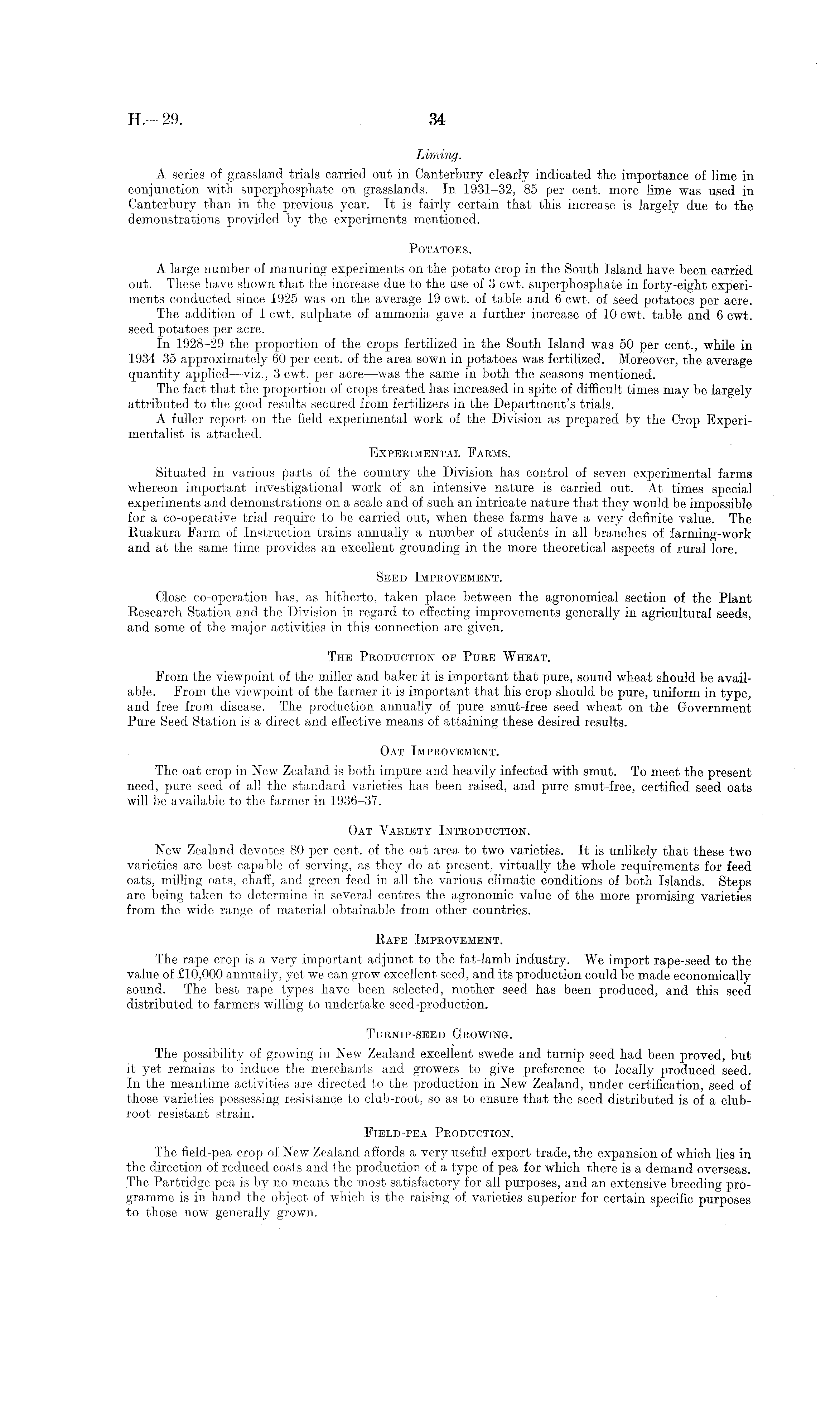 Liming. A series of grassland trials carried out in Canterbury clearly indicated the importance of lime in conjunction with superphosphate on grasslands. In 1931-32, 85 per cent, more lime was used in Canterbury than in the previous year. It is fairly certain that this increase is largely due to the demonstrations provided by the experiments mentioned. Potatoes. A large number of manuring experiments on the potato crop in the South Island have been carried out. These have shown that the increase due to the use of 3 cwt. superphosphate in forty-eight experiments conducted since 1925 was on the average 19 cwt. of table and 6 cwt. of seed potatoes per acre. The addition of 1 cwt. sulphate of ammonia gave a further increase of 10 cwt. table and 6 cwt. seed potatoes per acre. In 1928-29 the proportion of the crops fertilized in the South Island was 50 per cent., while in 1934-35 approximately 60 per cent, of the area sown in potatoes was fertilized. Moreover, the average quantity applied —viz., 3 cwt. per acre —was the same in both the seasons mentioned. The fact that the proportion of crops treated has increased in spite of difficult times may be largely attributed to the good results secured from fertilizers in the Department's trials. A fuller report on the field experimental work of the Division as prepared by the Crop Experimentalist is attached. Experimental Farms. Situated in various parts of the country the Division has control of seven experimental farms whereon important investigational work of an intensive nature is carried out. At times special experiments and demonstrations on a scale and of such an intricate nature that they would be impossible for a co-operative trial require to be carried out, when these farms have a very definite value. The Ruakura Farm of Instruction trains annually a number of students in all branches of farming-work and at the same time provides an excellent grounding in the more theoretical aspects of rural lore. Seed Improvement. Close co-operation has, as hitherto, taken place between the agronomical section of the Plant Research Station and the Division in regard to effecting improvements generally in agricultural seeds, and some of the major activities in this connection are given. The Production op Pure Wheat. From the viewpoint of the miller and baker it is important that pure, sound wheat should be available. From the viewpoint of the farmer it is important that his crop should be pure, uniform in type, and free from disease. The production annually of pure smut-free seed wheat on the Government Pure Seed Station is a direct and effective means of attaining these desired results. Oat Improvement. The oat crop in New Zealand is both impure and heavily infected with smut. To meet the present need, pure seed of all the standard varieties has been raised, and pure smut-free, certified seed oats will be available to the farmer in 1936-37. Oat Variety Introduction. New Zealand devotes 80 per cent, of the oat area to two varieties. It is unlikely that these two varieties are best capable of serving, as they do at present, virtually the whole requirements for feed oats, milling oats, chaff, and green feed in all the various climatic conditions of both Islands. Steps are being taken to determine in several centres the agronomic value of the more promising varieties from the wide range of material obtainable from other countries. Rape Improvement. The rape crop is a very important adjunct to the fat-lamb industry. We import rape-seed to the value of £10,000 annually, yet we can grow excellent seed, and its production could be made economically sound. The best rape types have been selected, mother seed has been produced, and this seed distributed to farmers willing to undertake seed-production. Turnip-seed Growing. The possibility of growing in New Zealand excellent swede and turnip seed had been proved, but it yet remains to induce the merchants and growers to give preference to locally produced seed. In the meantime activities are directed to the production in New Zealand, under certification, seed of those varieties possessing resistance to club-root, so as to ensure that the seed distributed is of a clubroot resistant strain. Field-pea Production. The field-pea crop of New Zealand affords a very useful export trade, the expansion of which lies in the direction of reduced costs and the production of a type of pea for which there is a demand overseas. The Partridge pea is by no means the most satisfactory for all purposes, and an extensive breeding programme is in hand the object of which is the raising of varieties superior for certain specific purposes to those now generally grown.